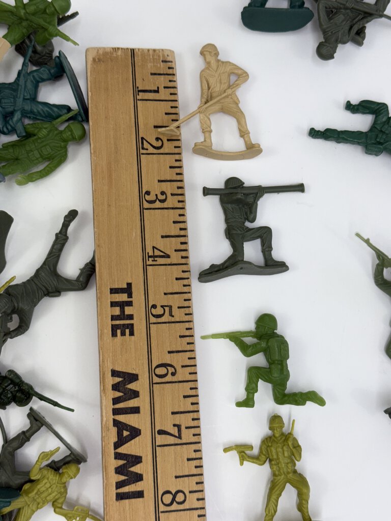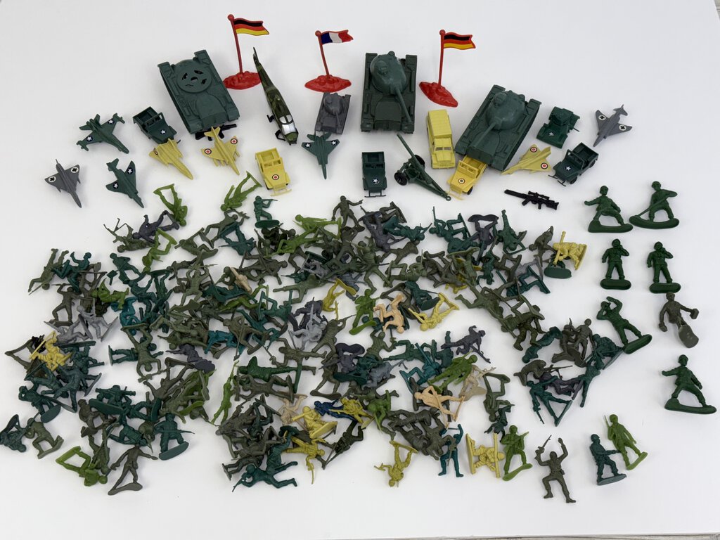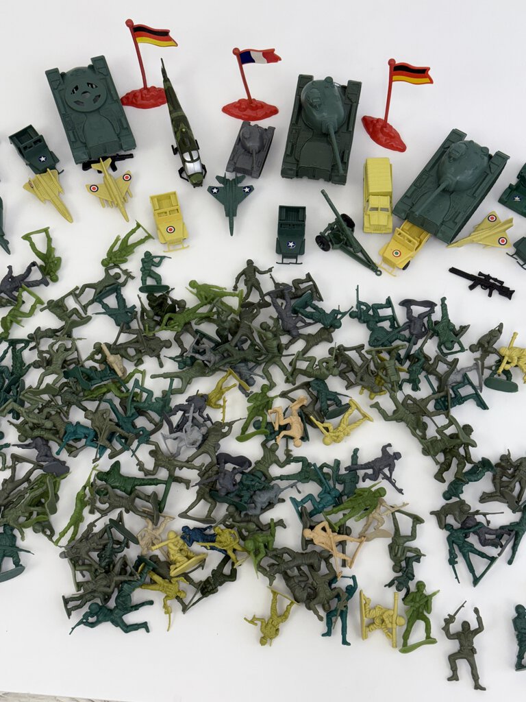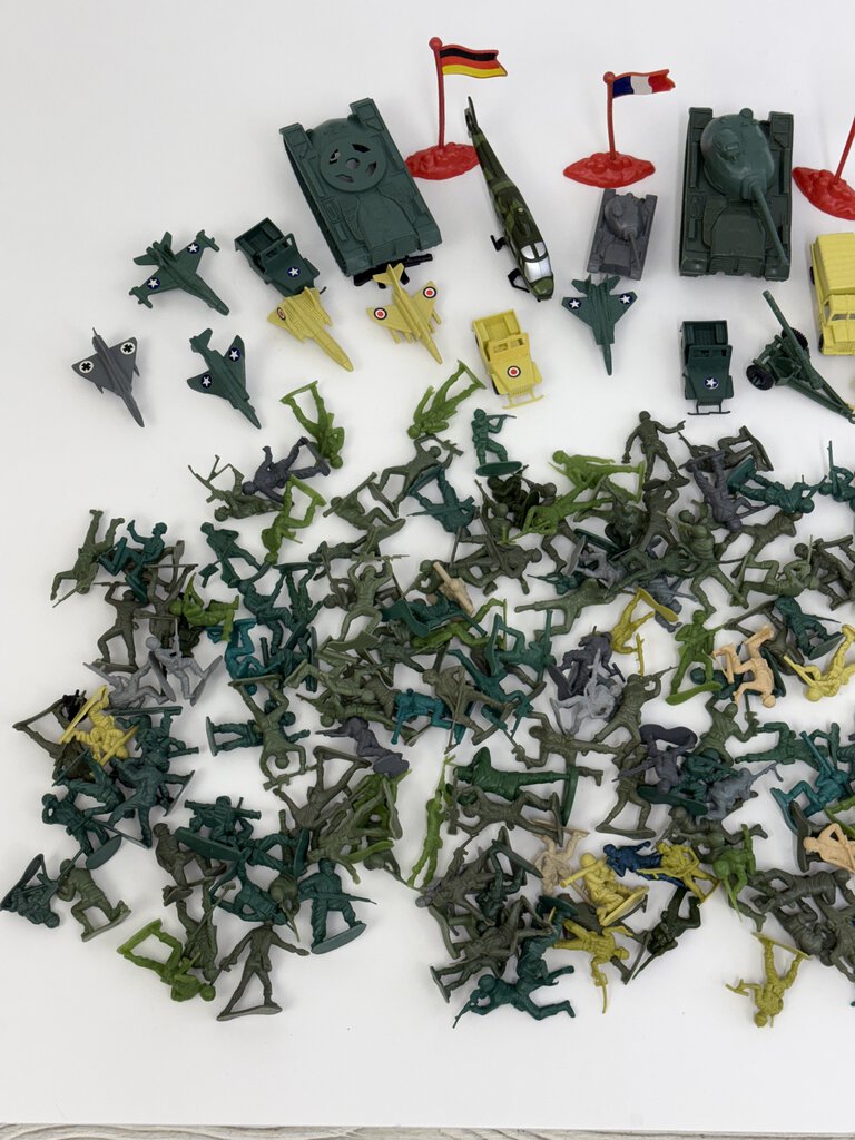 Large Lot of 200 pieces of 1960’ies plastic toy soldiers in a variety of colors and positions. includes tanks, jeeps, planes and figures. Please review all photos for content of listing.