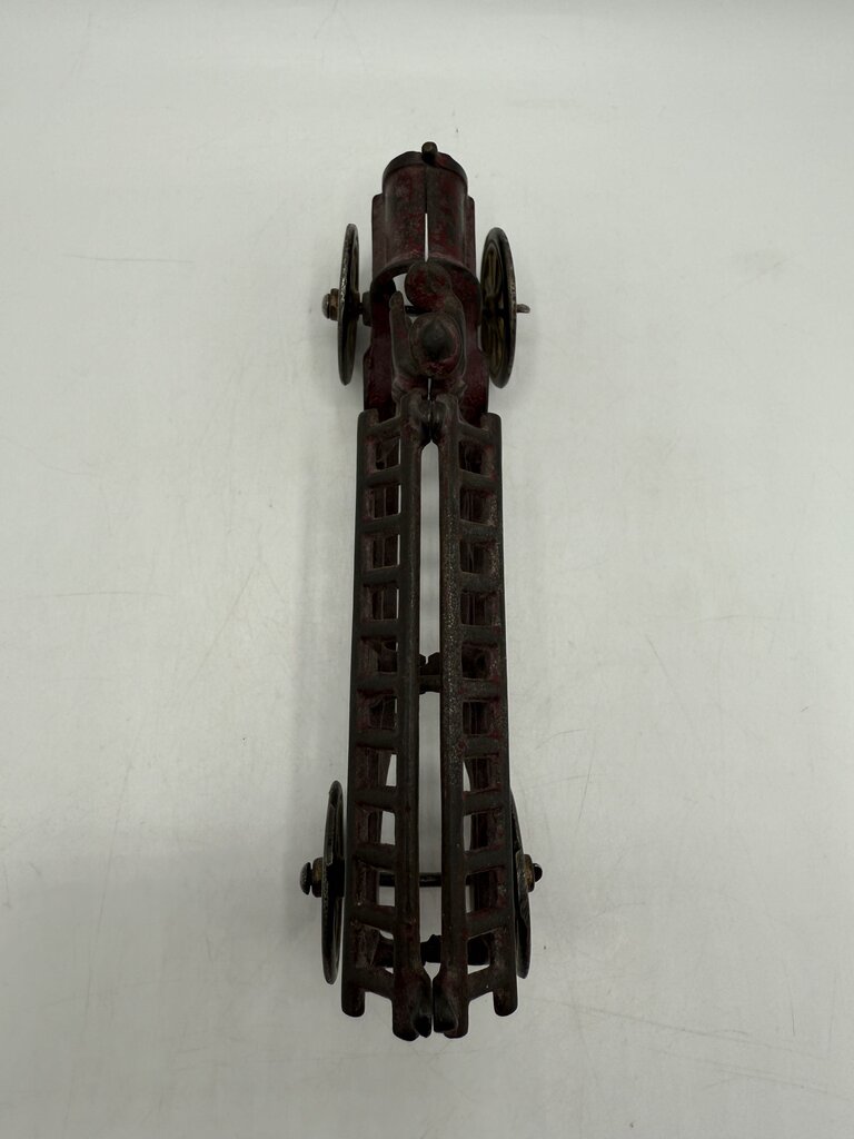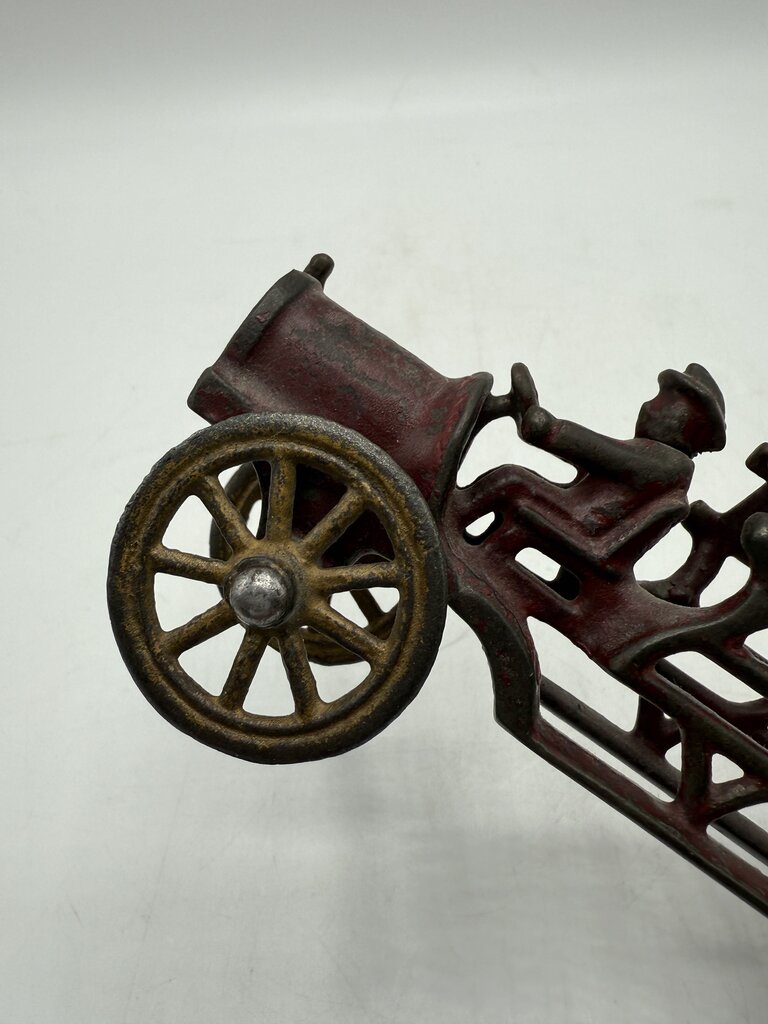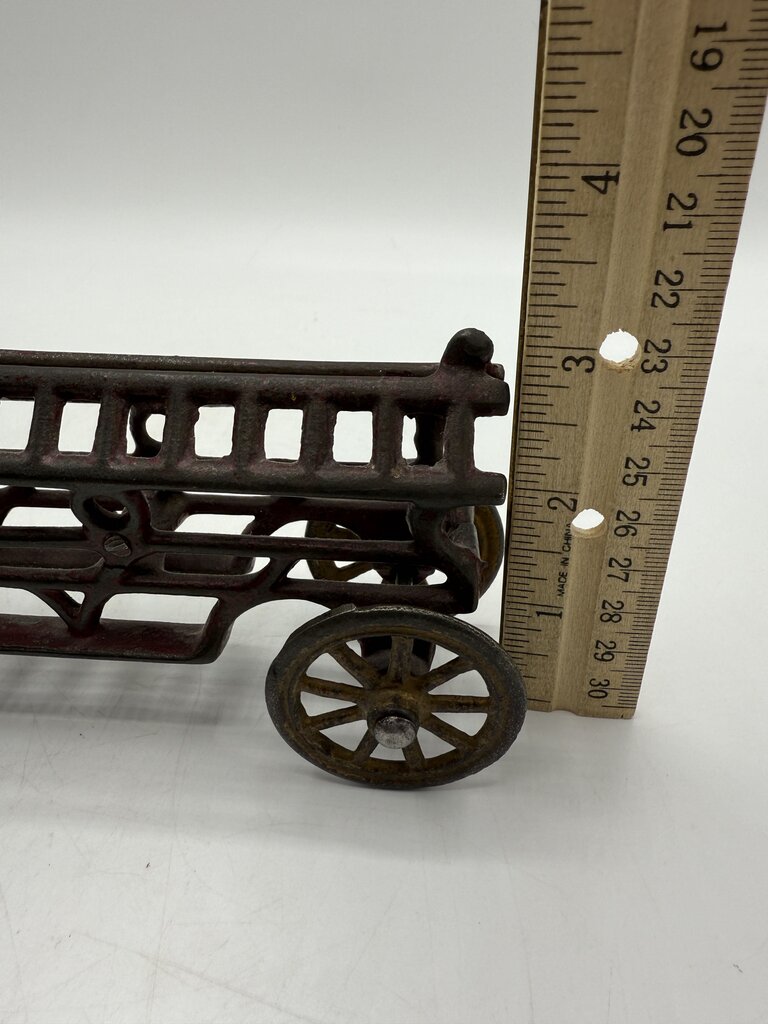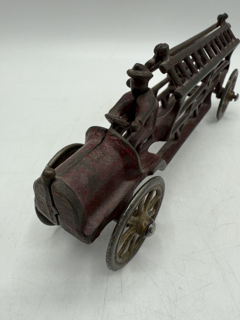 Antique cast iron toy firetruck with driver measures 7.5” long by 3” tall and 2” wide. Great patina of wear on original red paint. The wheels still roll.