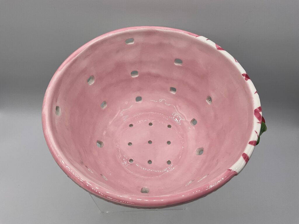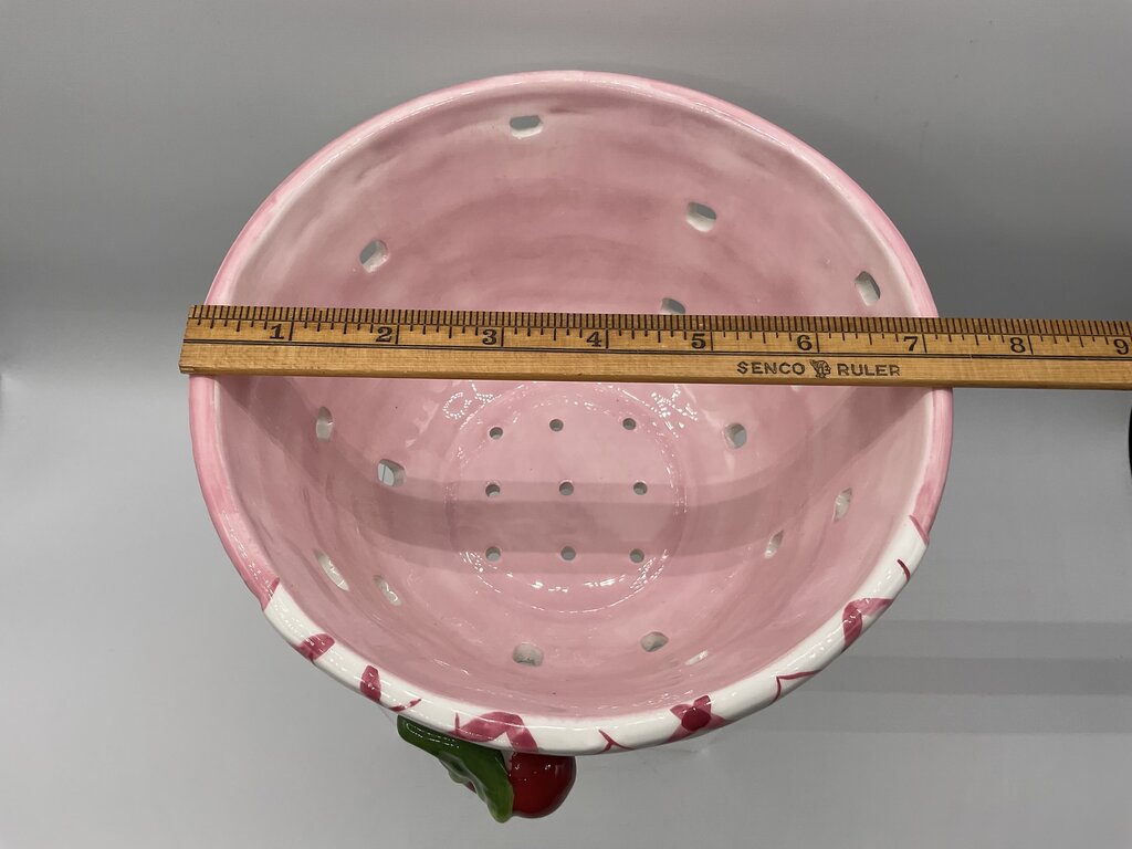 This piece is a ceramic strainer produced by Bella Casa by Ganz. It features a basket design, with several hearts adorning some of the weaves of the basket, as well a cherry and leaf raised design on the outside of the strainer. The inside is a cute light pink color. This strainer is perfect for washing and serving fruits such as cherries, strawberries, and much more. This piece measures 7 1/4” wide at the rim and 4” tall and weighs 1 pound and 5.3 ounces. Strainer is in overall excellent condition, no chips, cracks, or other damages present. Please refer to all photos for overall condition. Estate item. Condition is pre owned. Ships USPS Ground Advantage Mail.