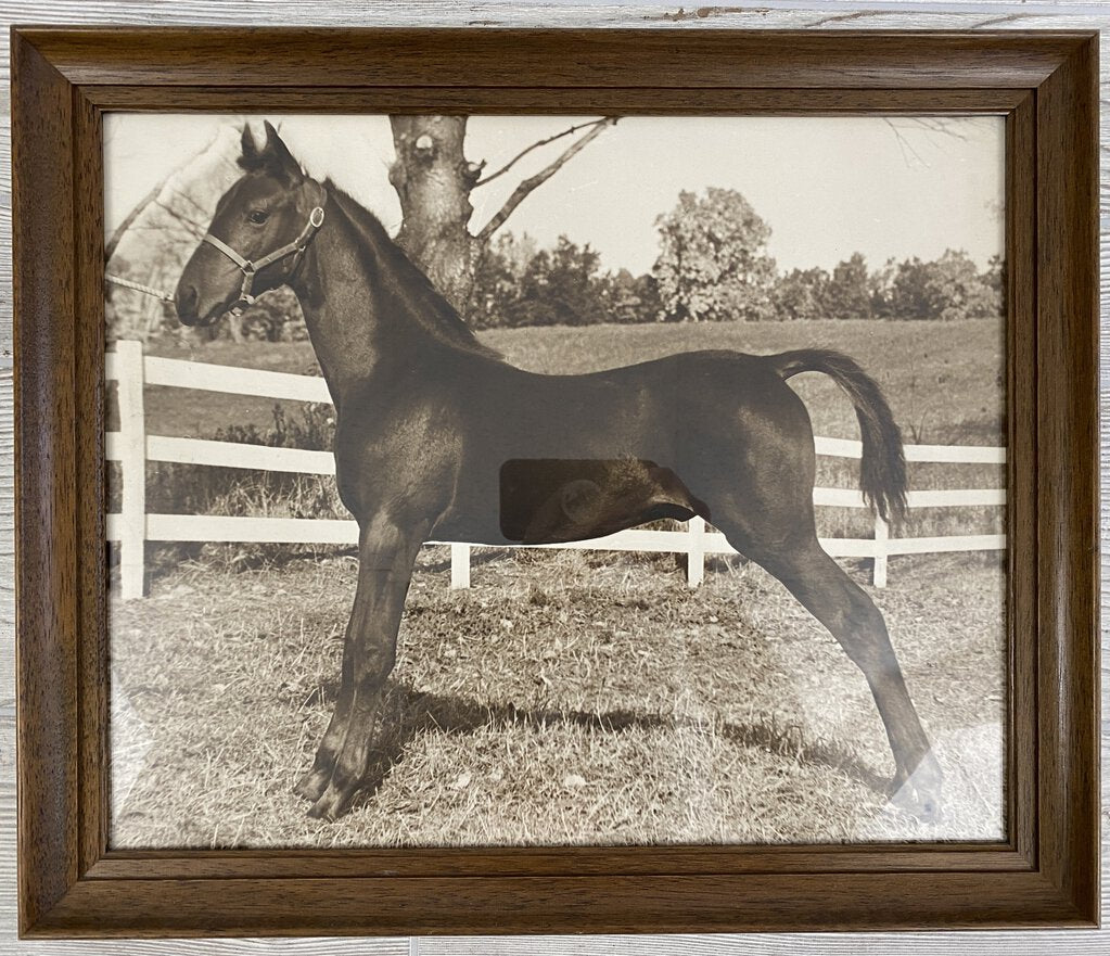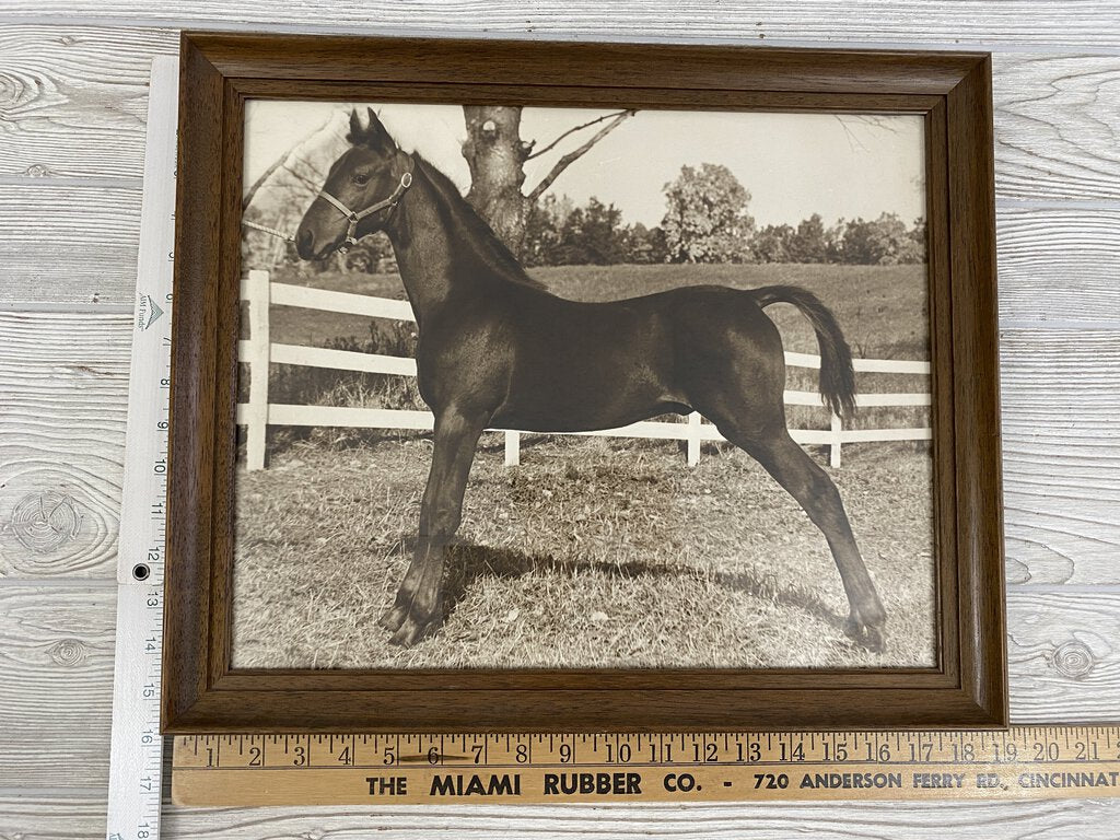 Custom framed black and white photograph of a young show horse. Great detail in the horses shiny coat in a fenced in pasture. Frame measures 18.5” x 15.5”. No damage found.