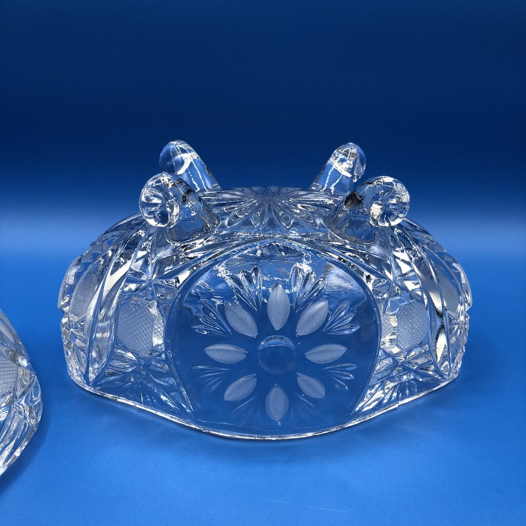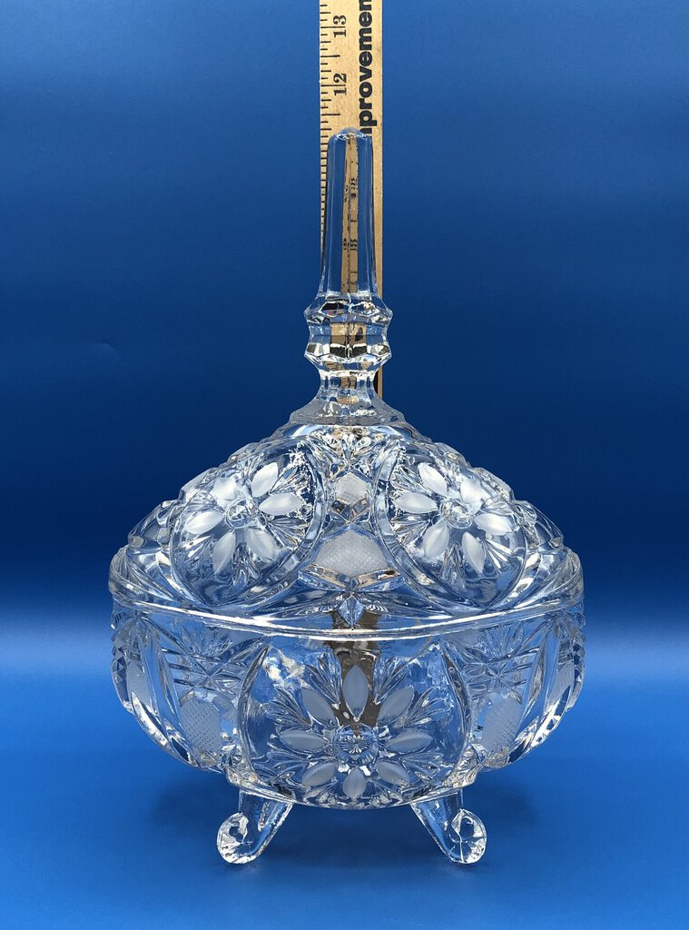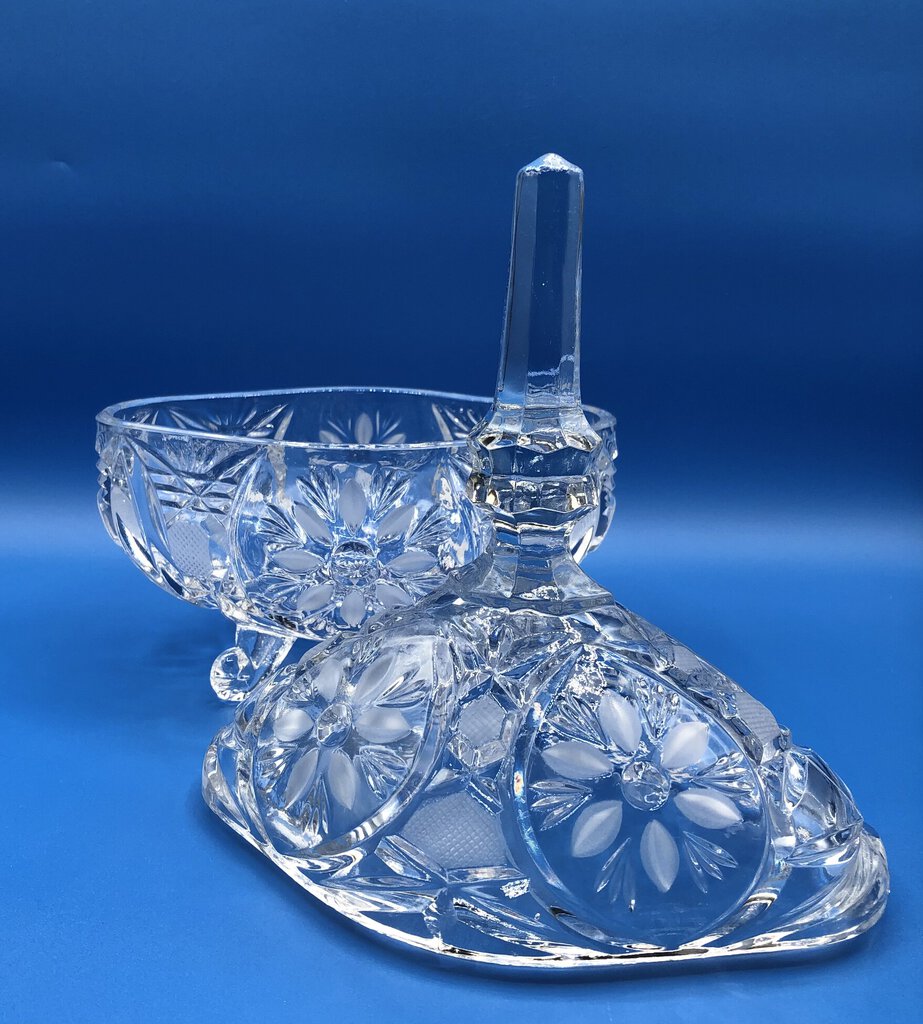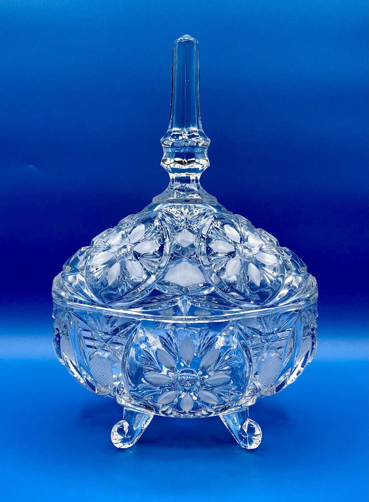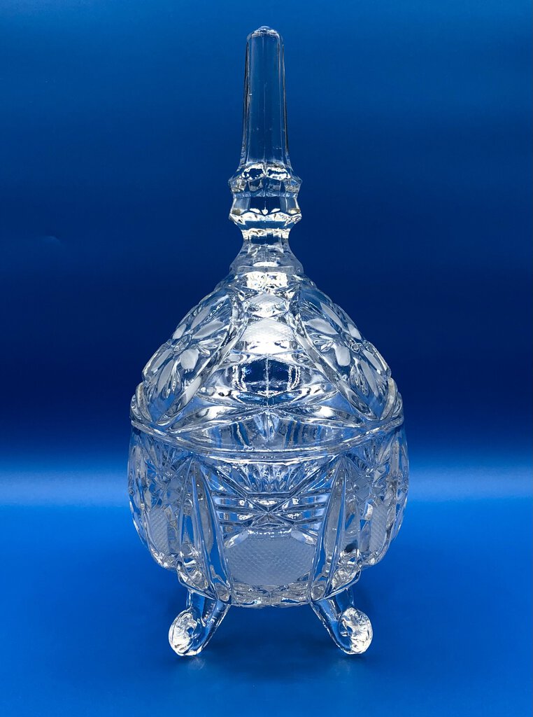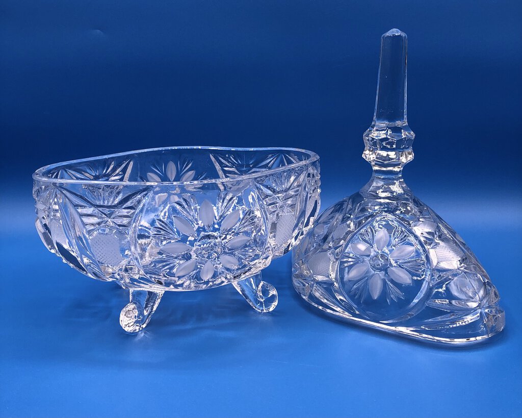 Exquisite pressed, cut glass oval candy dish sits on four blown glass feet. The lid is designed with a steeple handle for add elegance. Would add elegance to any table or arrangement.