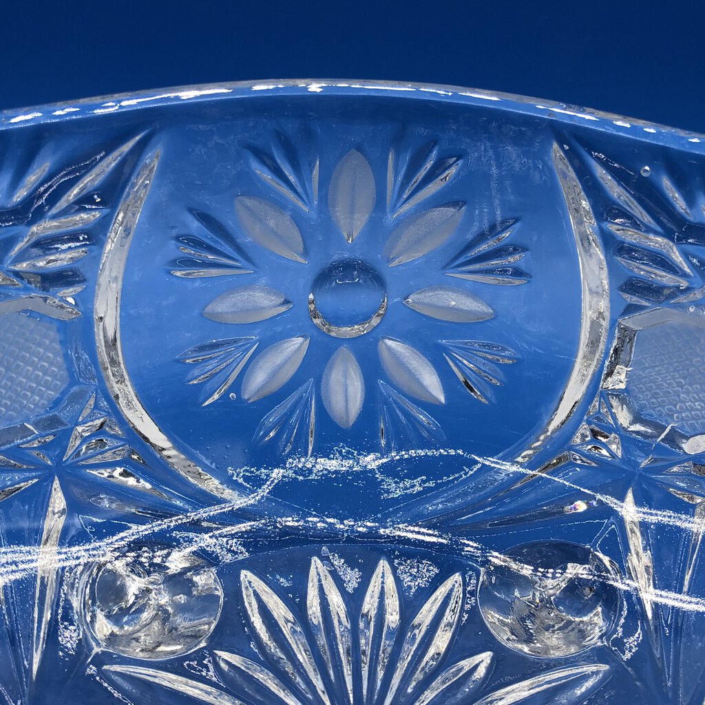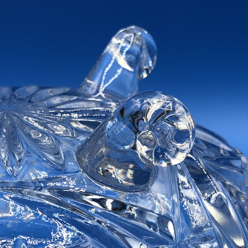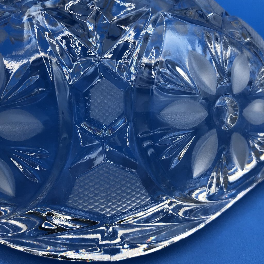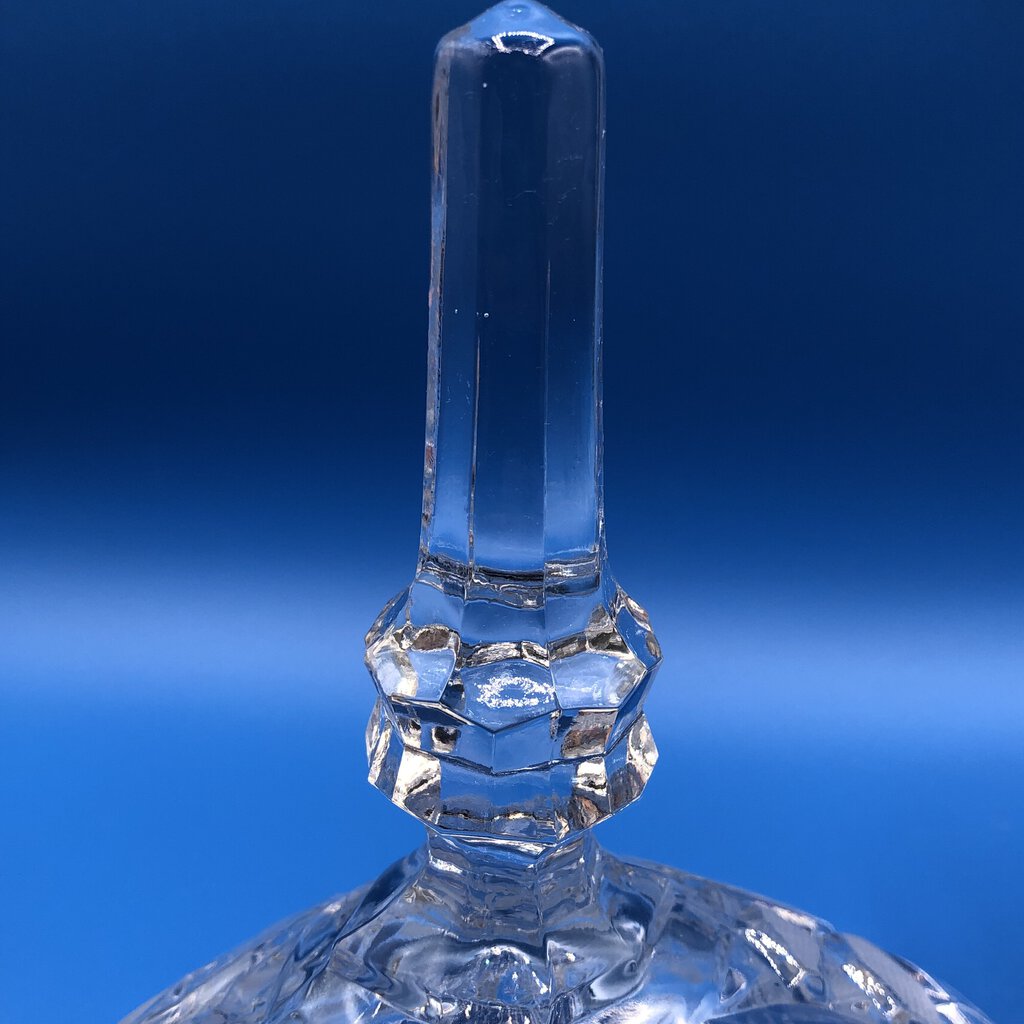 Exquisite pressed, cut glass oval candy dish sits on four blown glass feet. The lid is designed with a steeple handle for add elegance. Would add elegance to any table or arrangement.