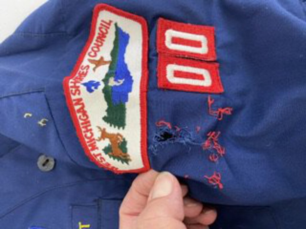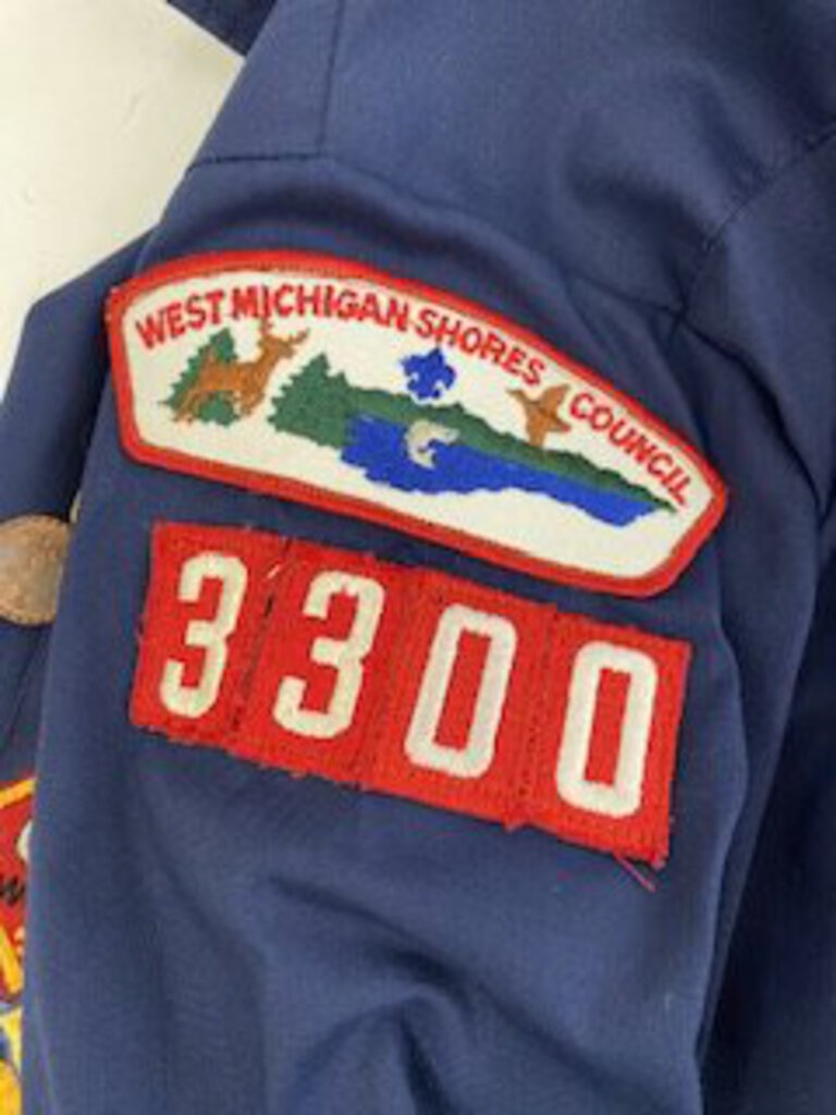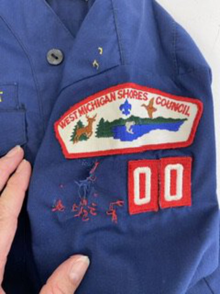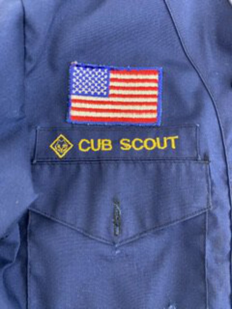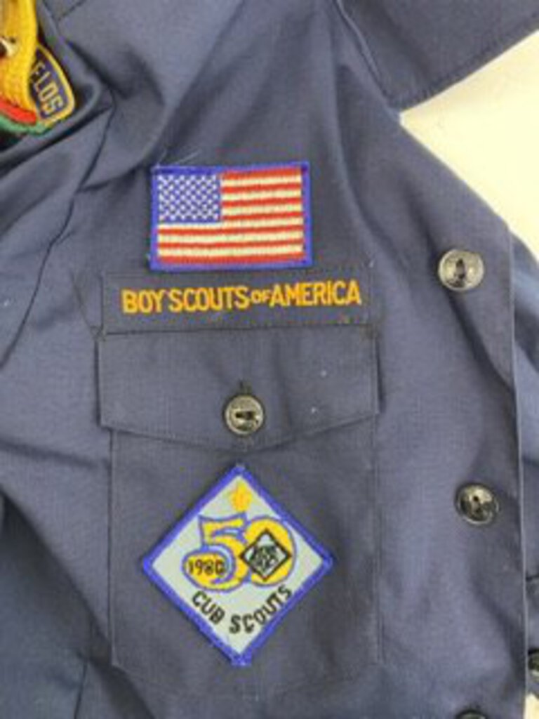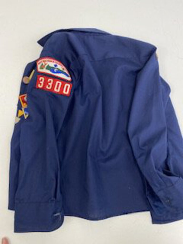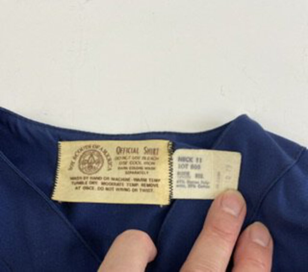 Estate find of Boys Scouts of America Uniform shirt, long sleeve, neck size 13”, 22” length shoulder to hem, chest 16” sleeve length 20”. No rips or tears. And one collarless Cub Scout long sleeve uniform shirt neck size 11. One hole in sleeve from removing a patch.