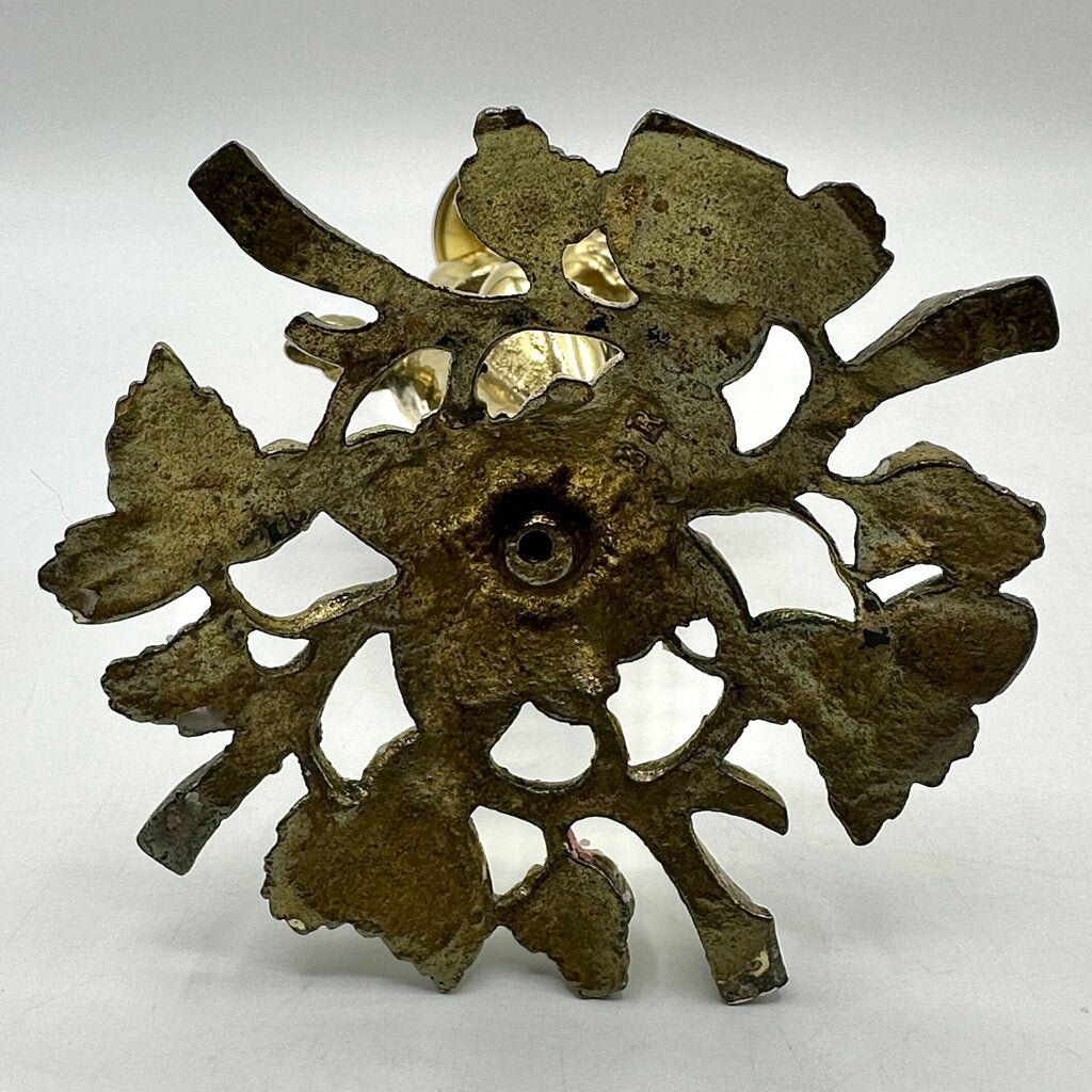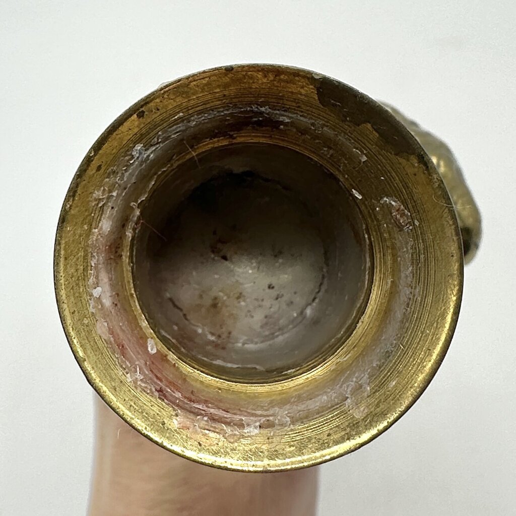 Vintage brass Cherub candlestick holder, a magnificent piece of classical decor. It features a beautifully detailed cherub standing on grapevines. Imagine this elegant, heavy (3lbs) piece gracing your mantlepiece or dining table. It holds a standard taper candle which is not included. The candleholder is 11” tall on a 4” base, it is in very good vintage condition with a wonderful patina. It has light age and use appropriate wear and a small amount of candle wax drips.