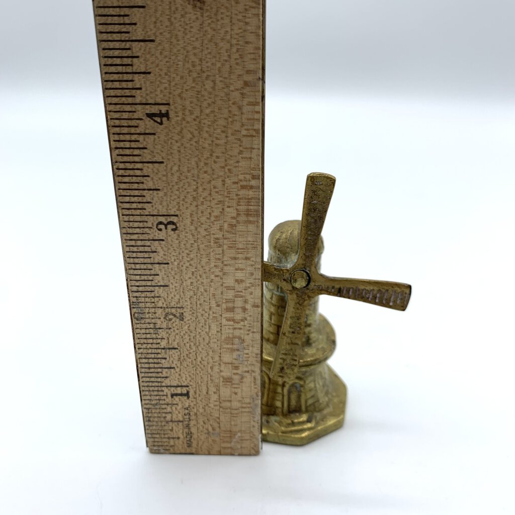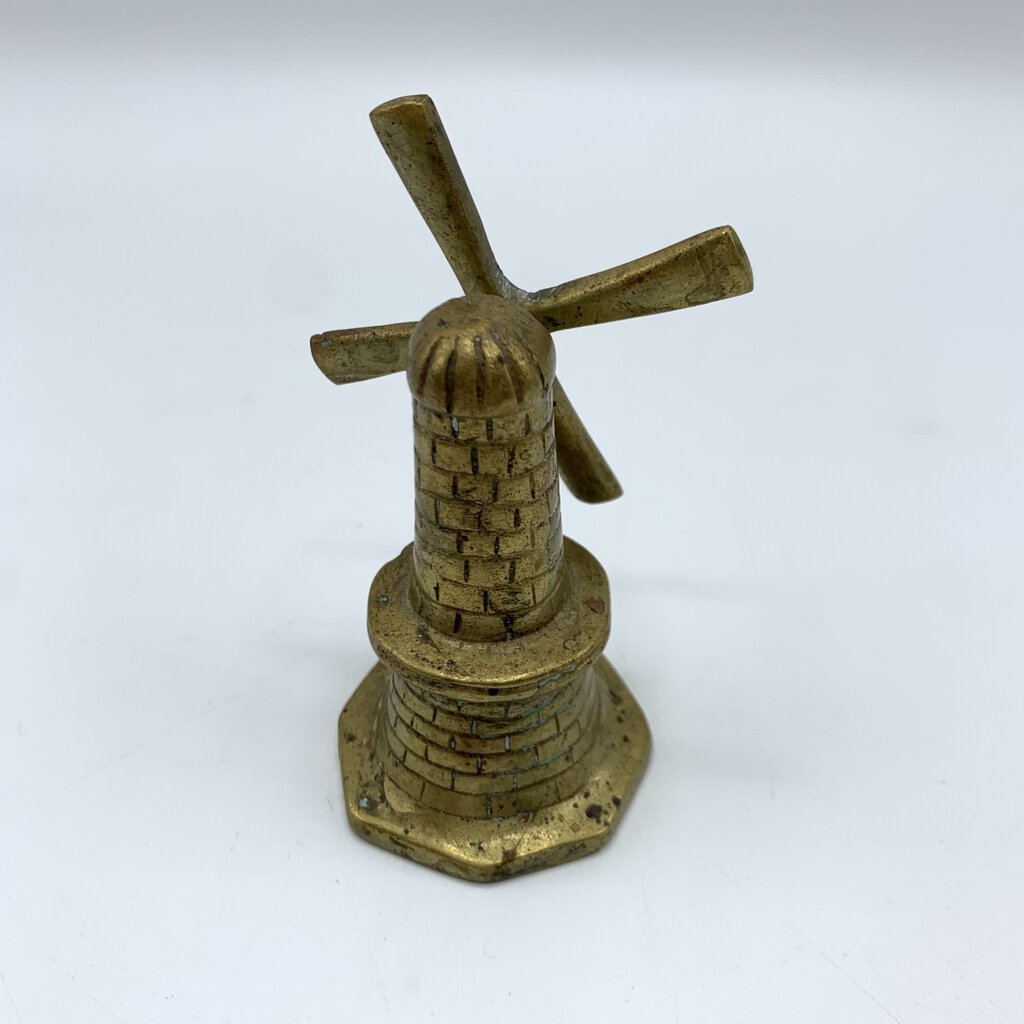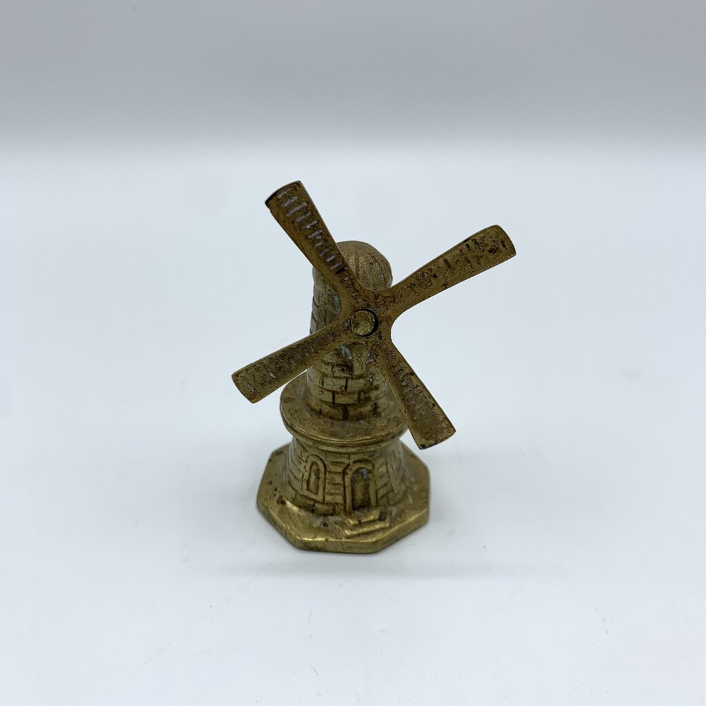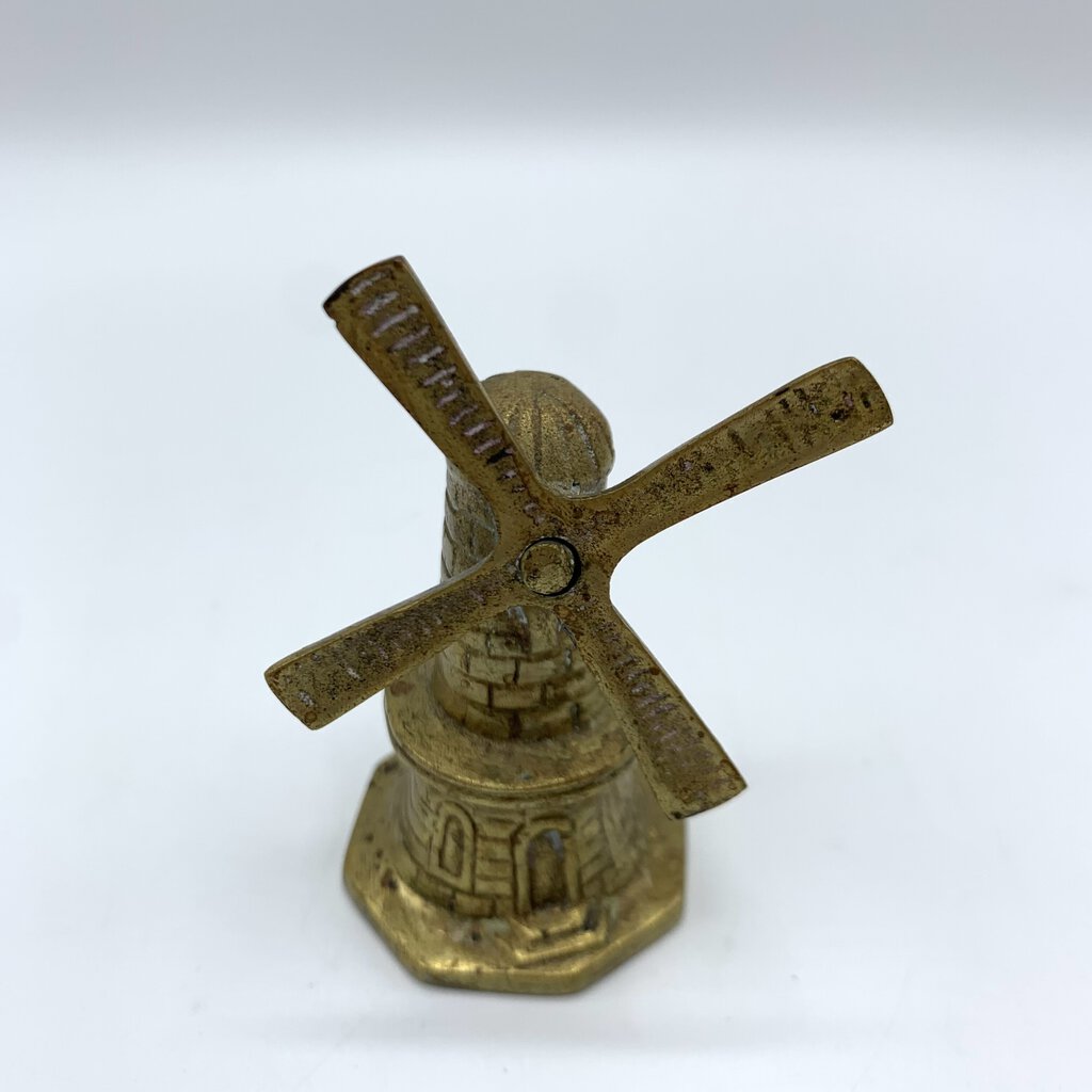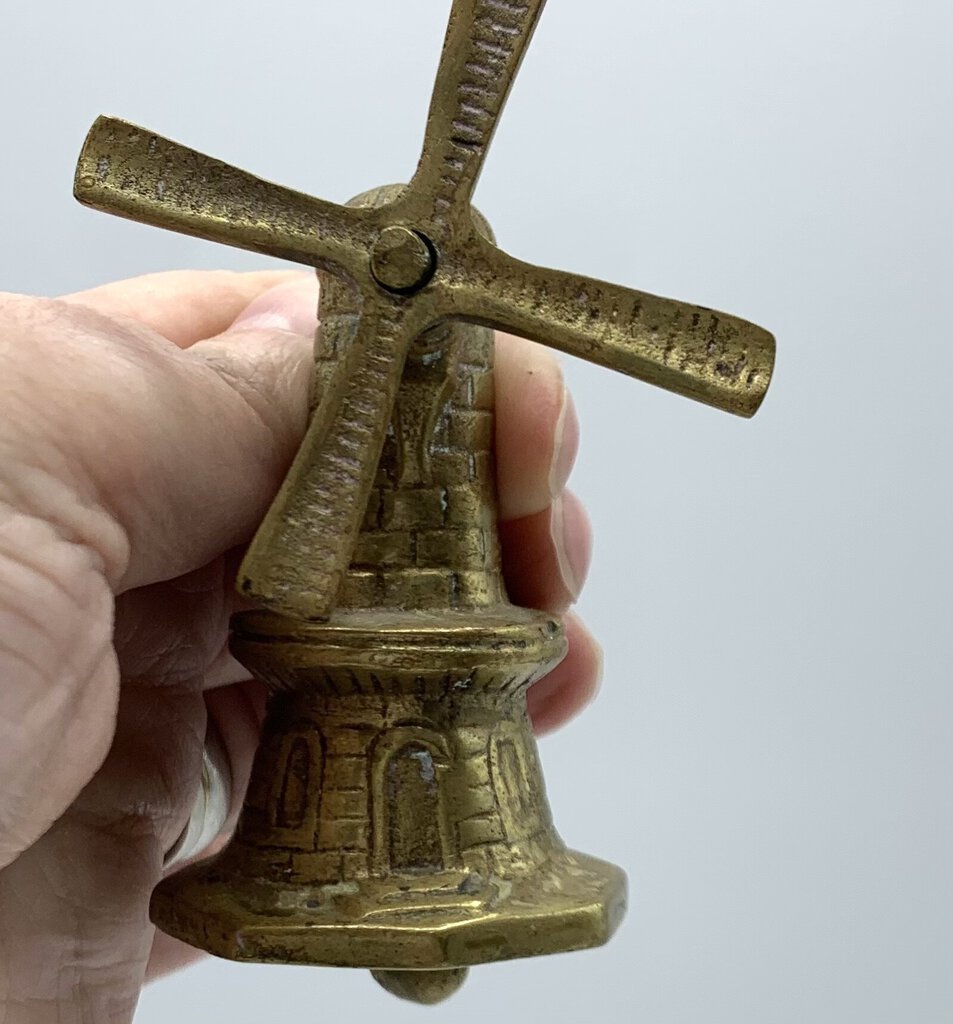 Adorable little vintage brass windmill bell. It sits well with the clapper tucked inside, so it will display well. The blades of the windmill can be rotated manually.