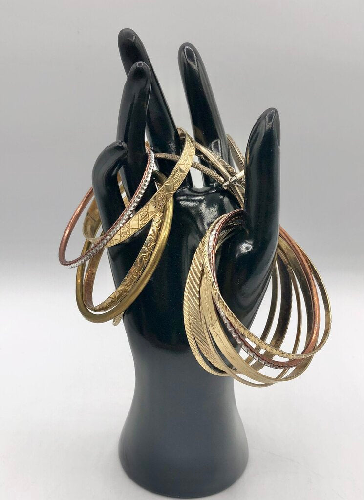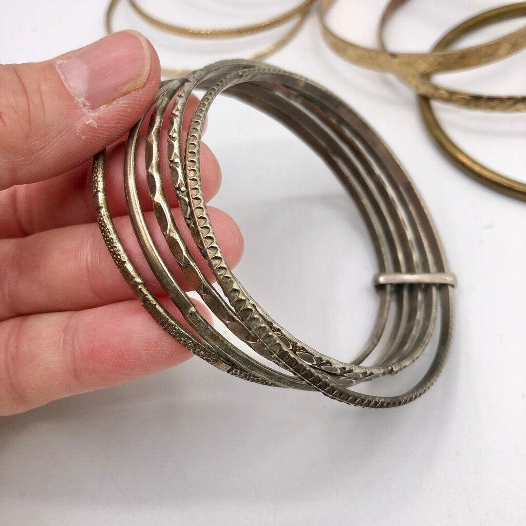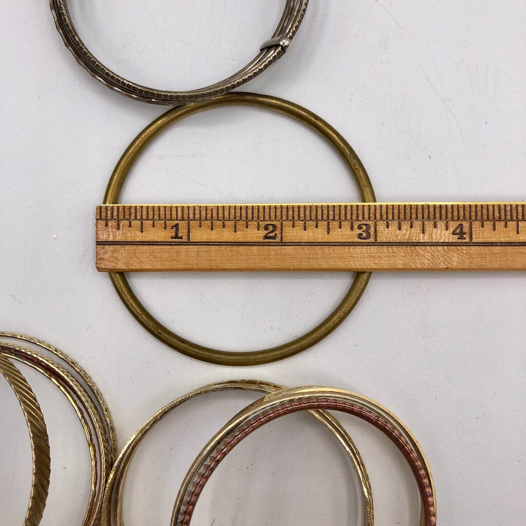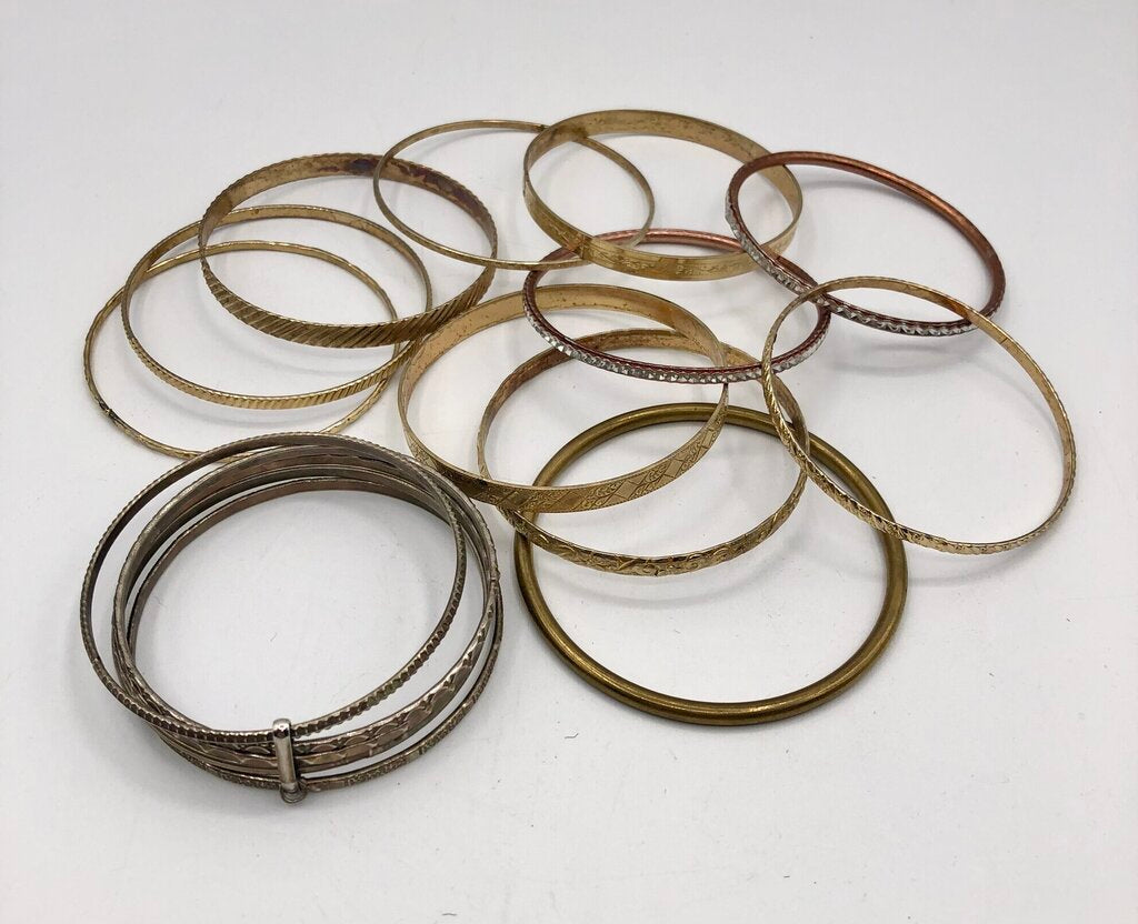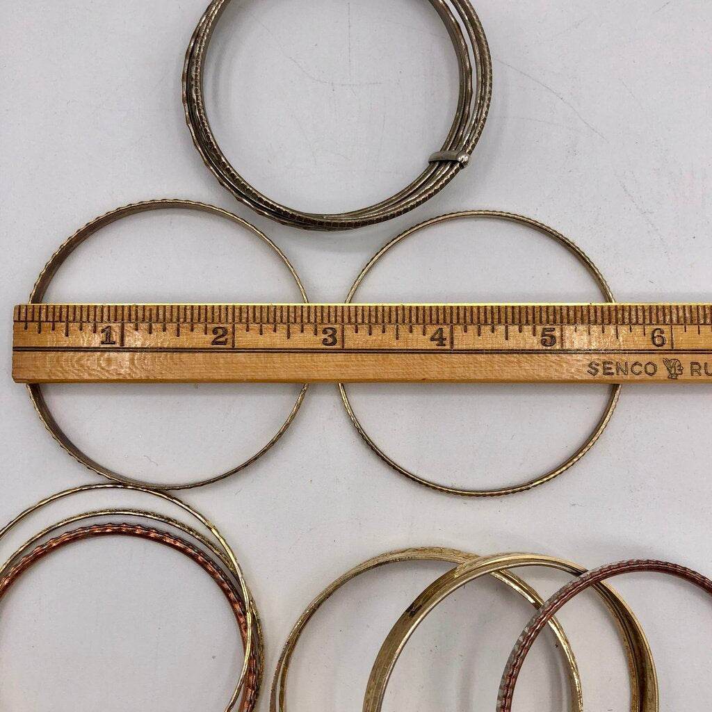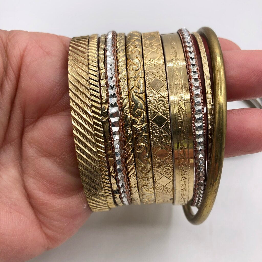 Great vintage fashion to enhance that summer vibe or Bohemian style. This lot of 12 bangles are all gold toned in an assortment of textures. One bracelet is connected into 5 rings. I have only counted this piece as one unit.