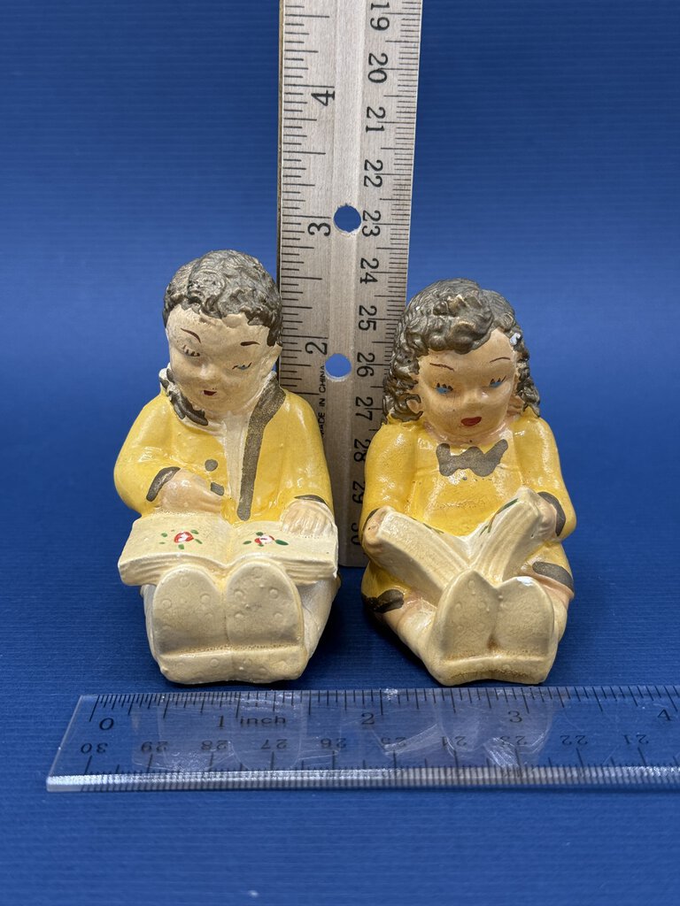 Vintage set of chalkware figurines, seated little boy and little girl reading books. Handpainted, yellow clothing with flowers on book pages. Measures approximately 3” tall with a 2” x 1” base.