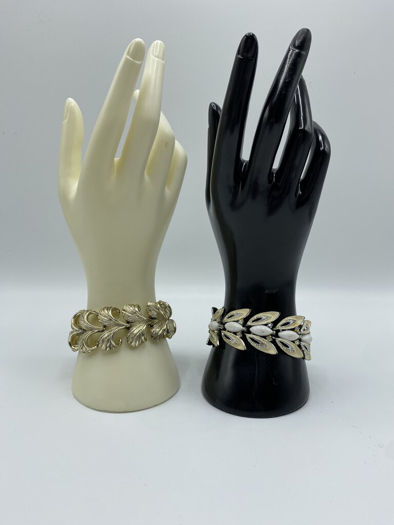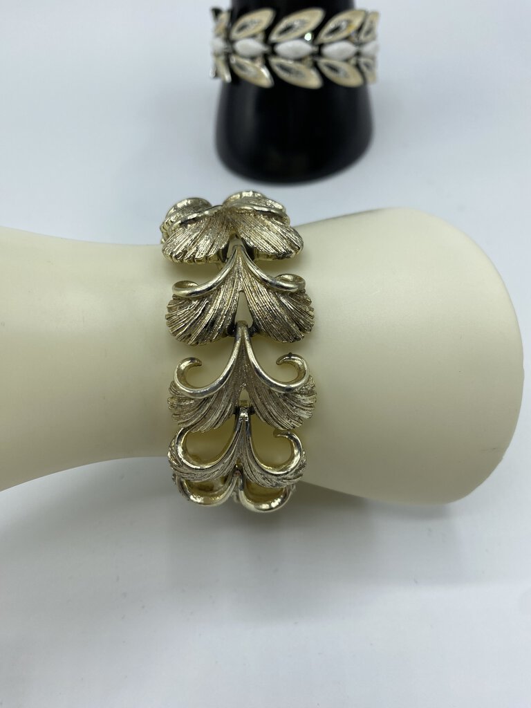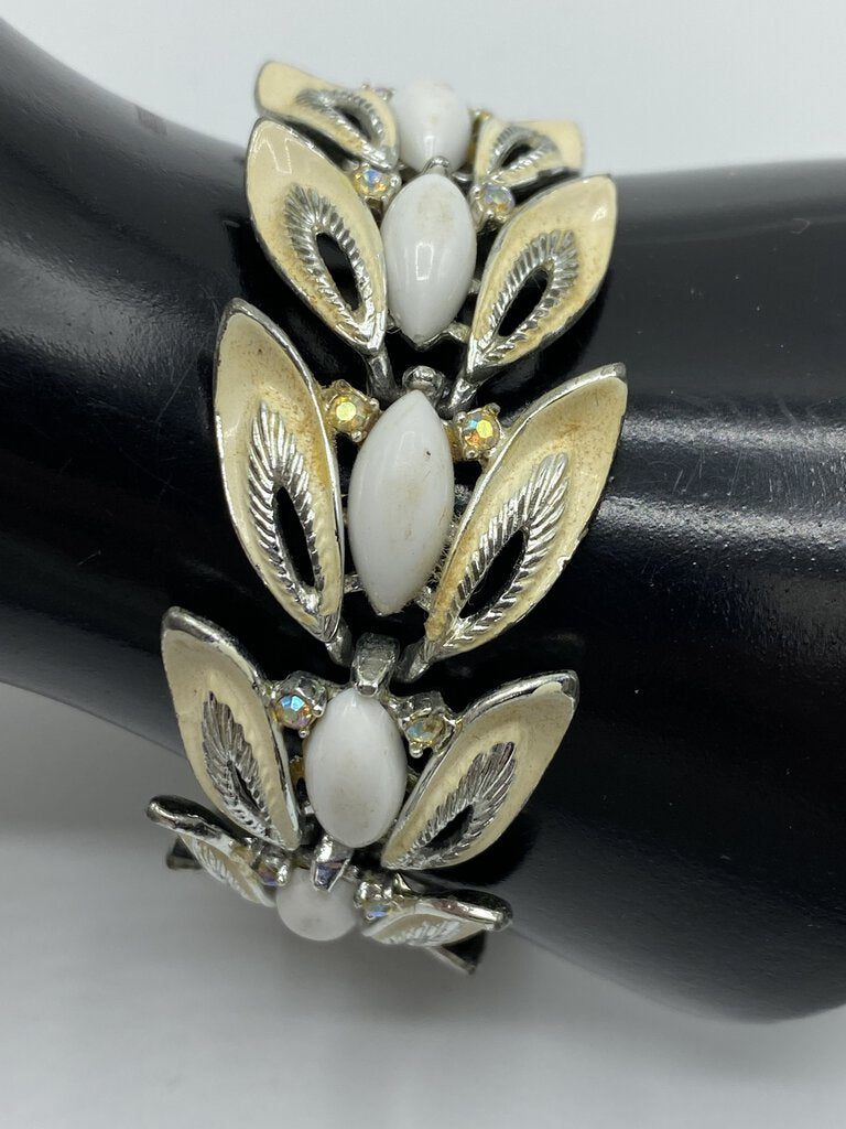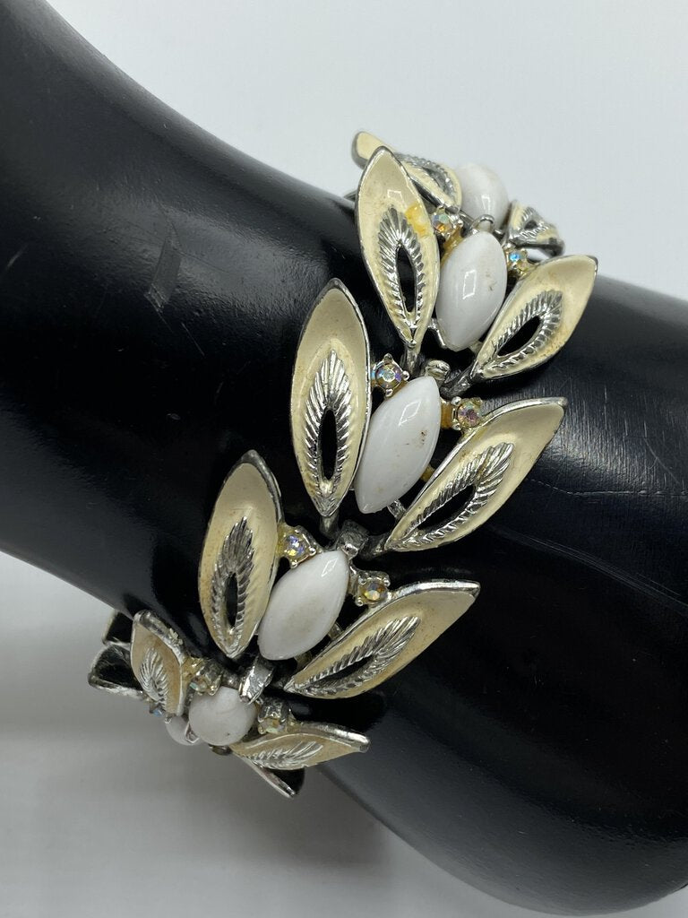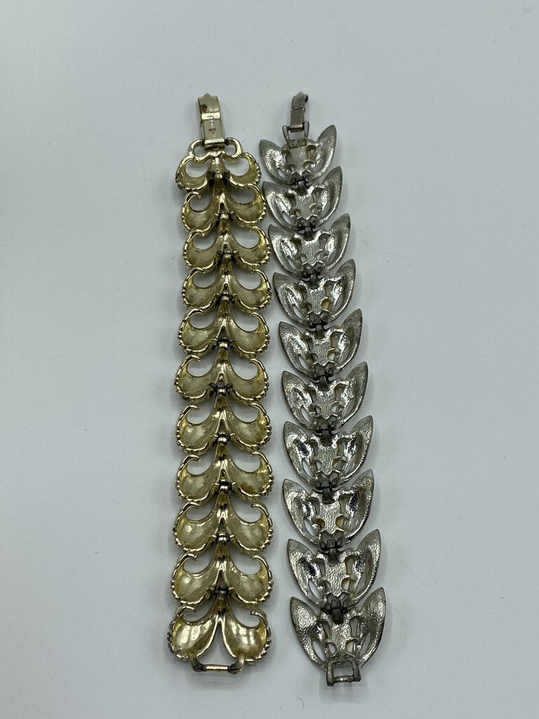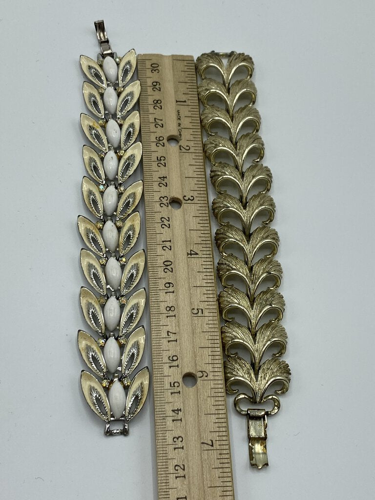 Two quality vintage metal bracelets. The gold tone metal bracelet in a fern leaf style is made by Lisner and measures 7” long and 1” wide, fully functioning secure clasp. The second bracelet is silver toned with solid white football shapes with rhinestones and white and silver leaf shapes links forming the bracelet. This one measures 7” long and 1” wide, with a fully functioning secure clasp. Some light marks found from use.