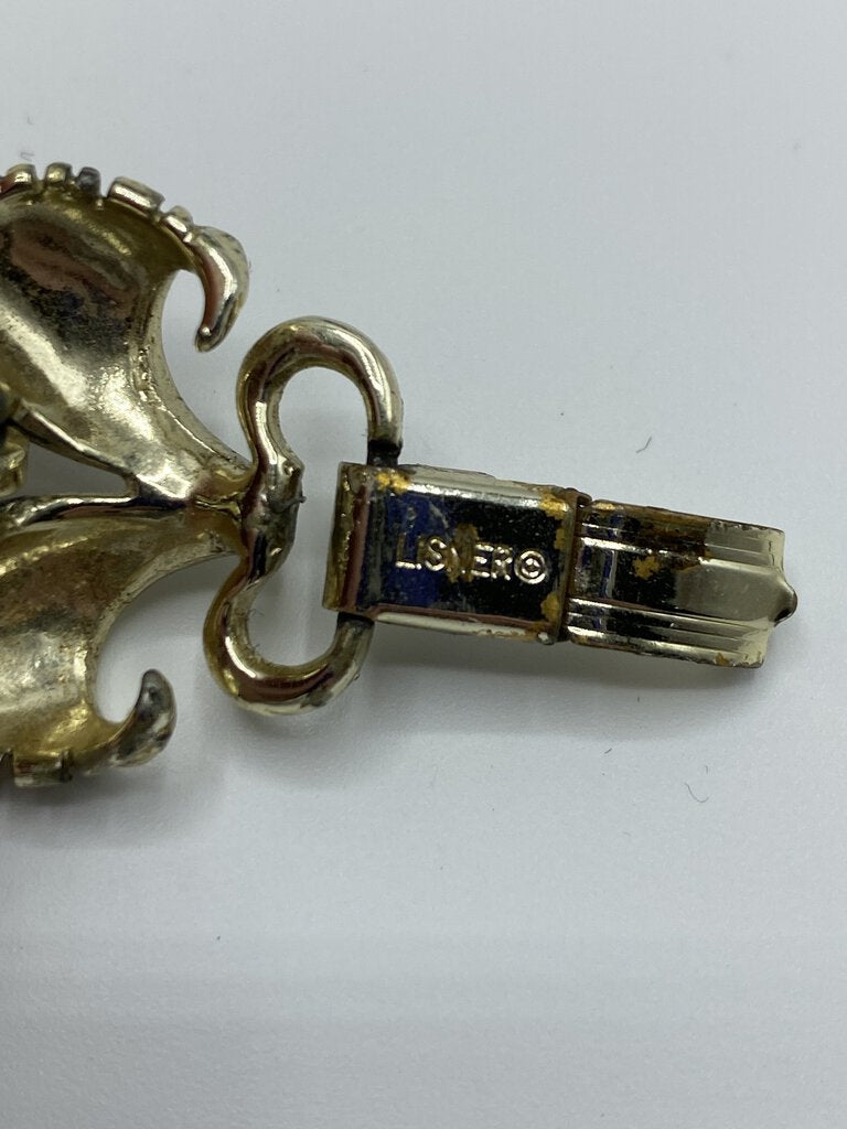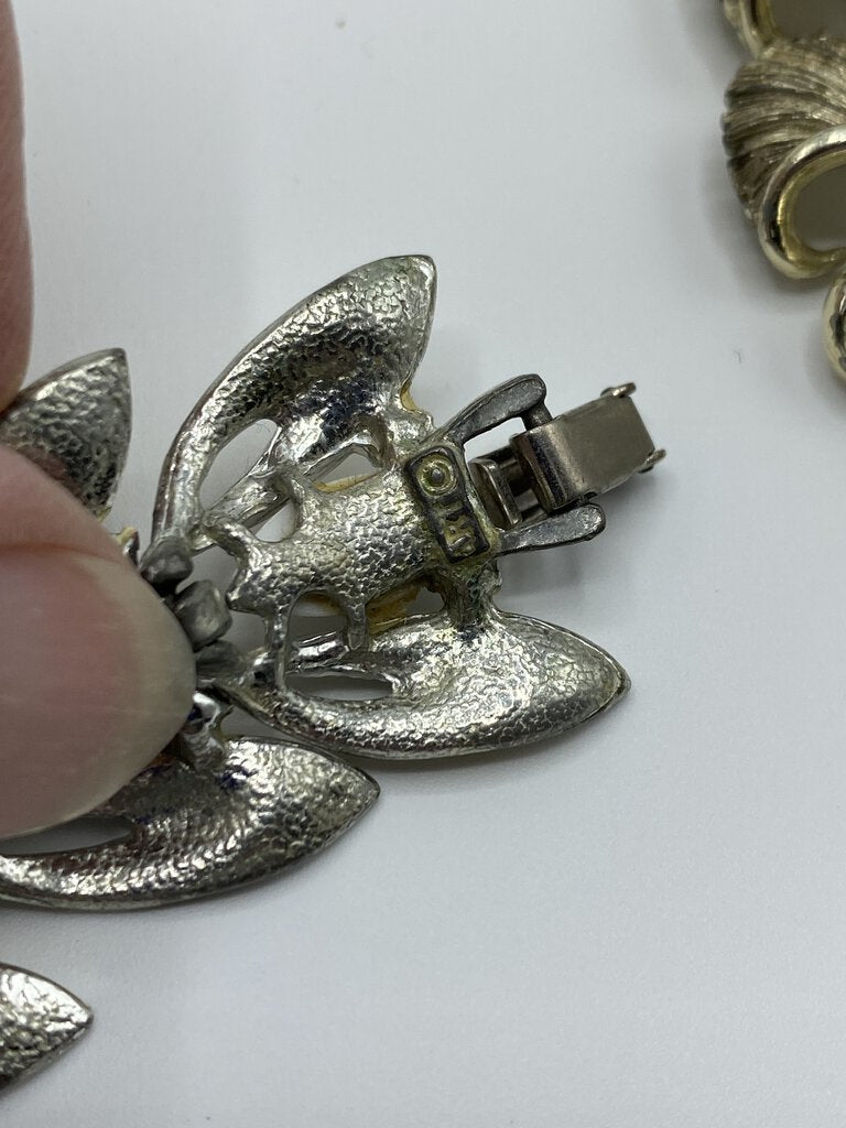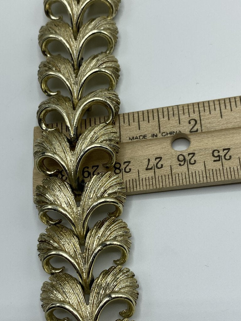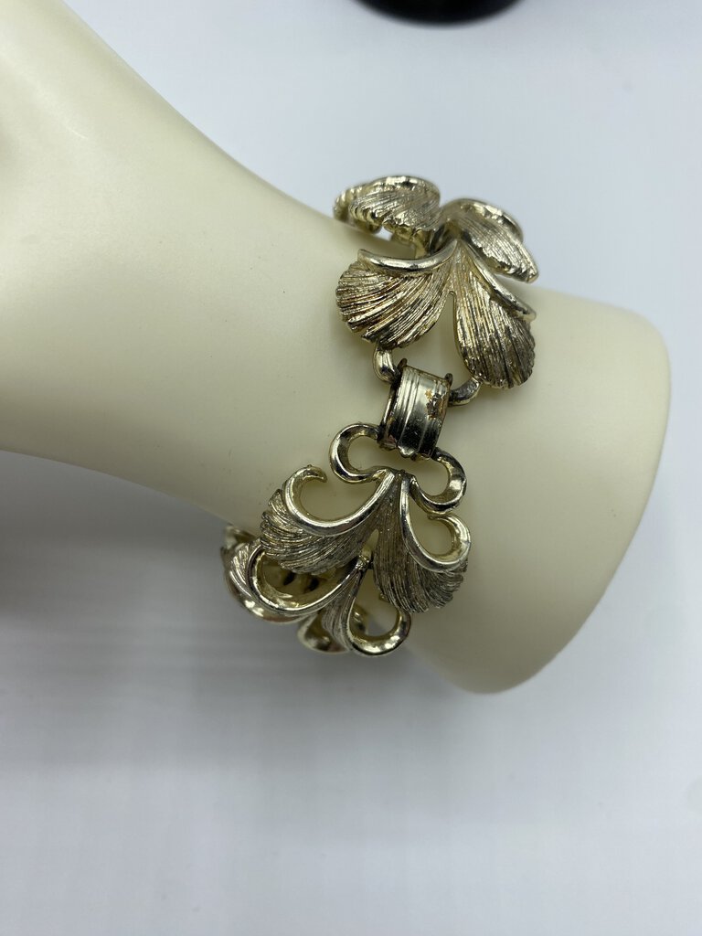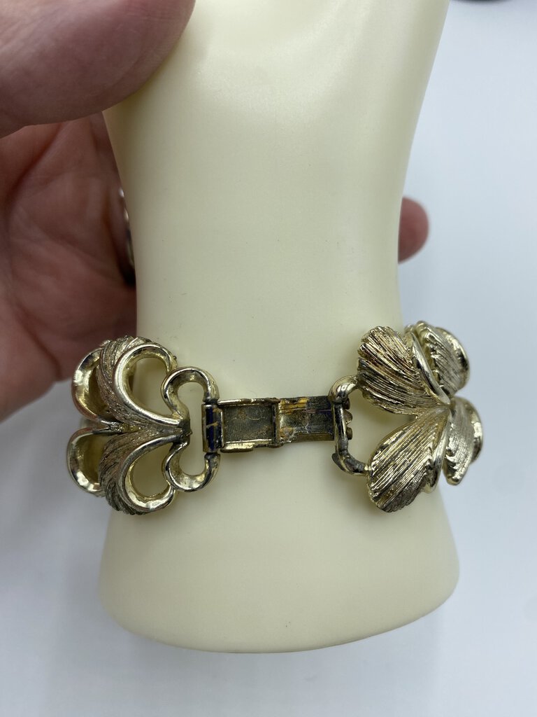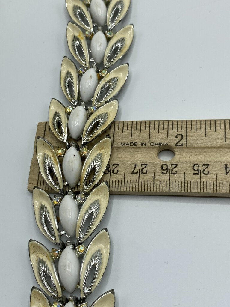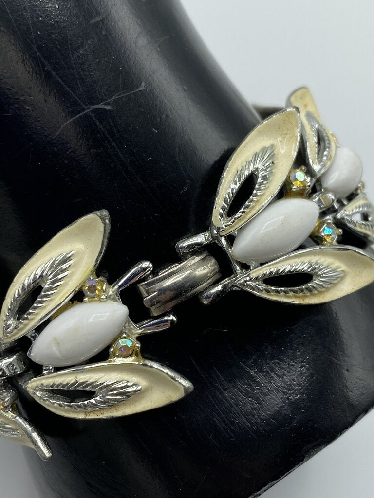 Two quality vintage metal bracelets. The gold tone metal bracelet in a fern leaf style is made by Lisner and measures 7” long and 1” wide, fully functioning secure clasp. The second bracelet is silver toned with solid white football shapes with rhinestones and white and silver leaf shapes links forming the bracelet. This one measures 7” long and 1” wide, with a fully functioning secure clasp. Some light marks found from use.