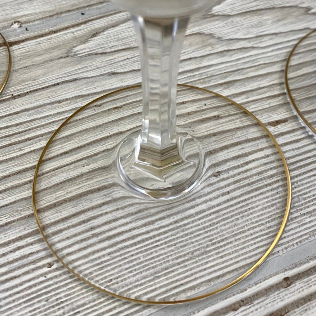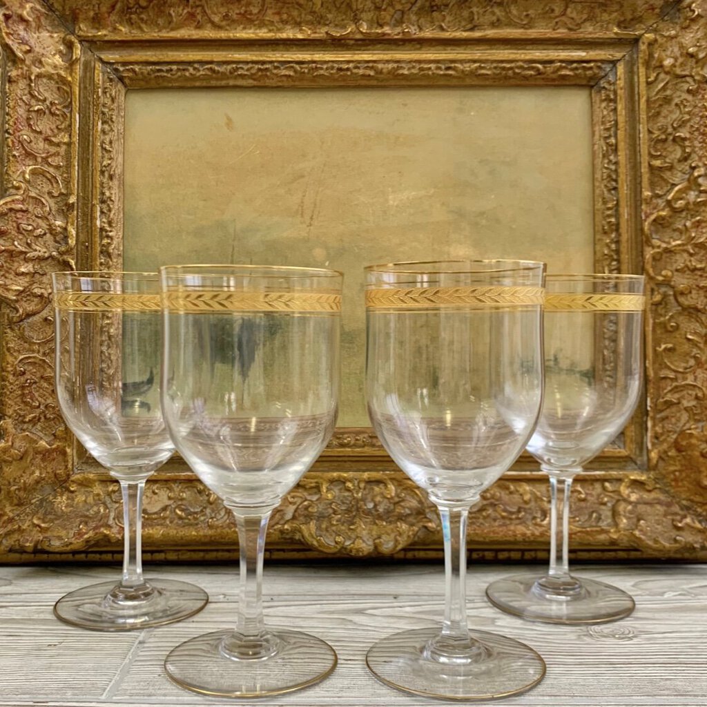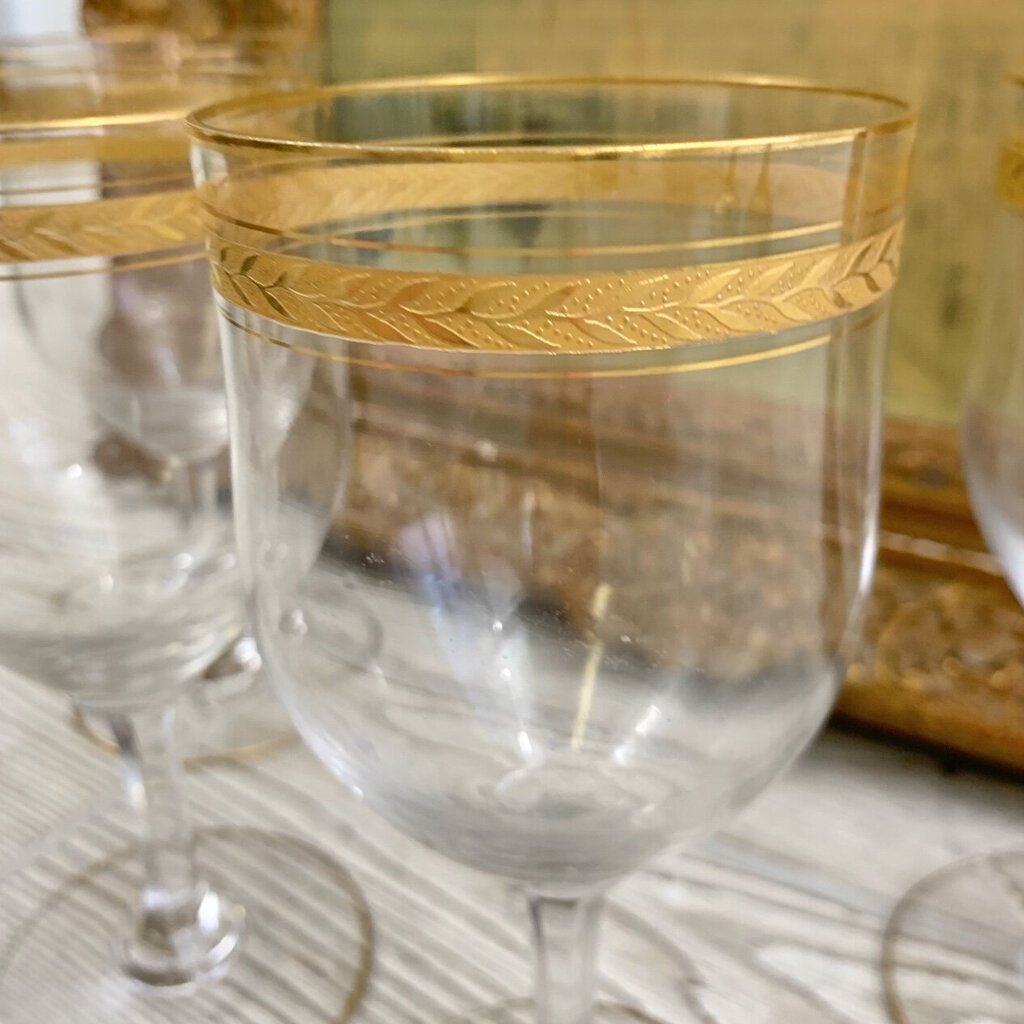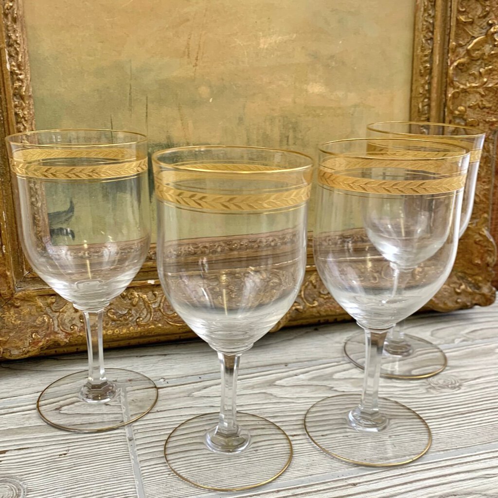 Elegant set of four vintage wine glasses with lovely detailing. The glasses have a beautiful gold gilded laurel pattern around the top of the glass and a gorgeous cut column style stem. Classic elegance! The glasses were estate-owned and are in good vintage condition. A few of the bases have bubbles in glass, and the gold gilding is showing some subtle fading in spots. Glasses measure 6 3/8” in height and the base diameter is 2 78”. Please carefully review the photos for condition details.