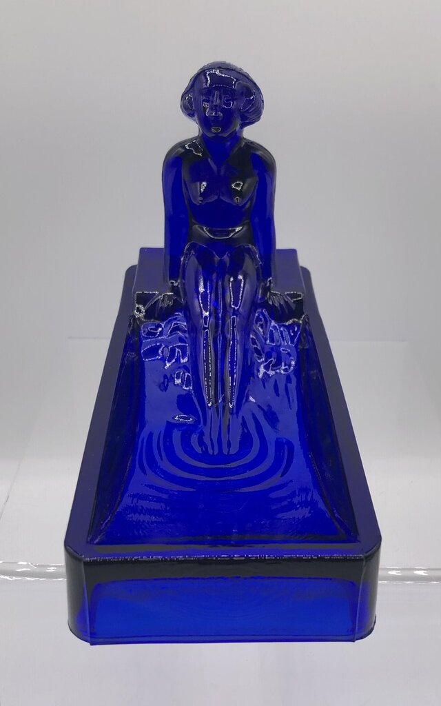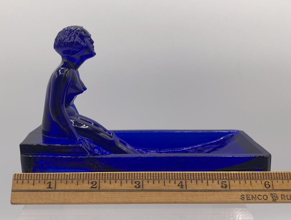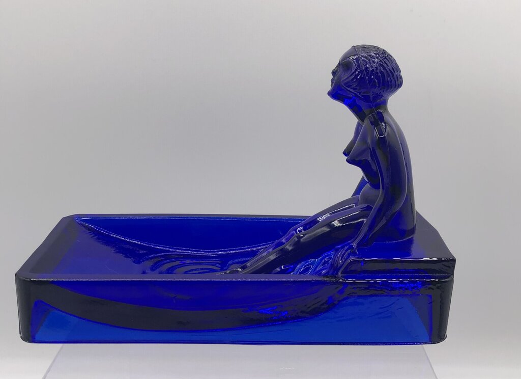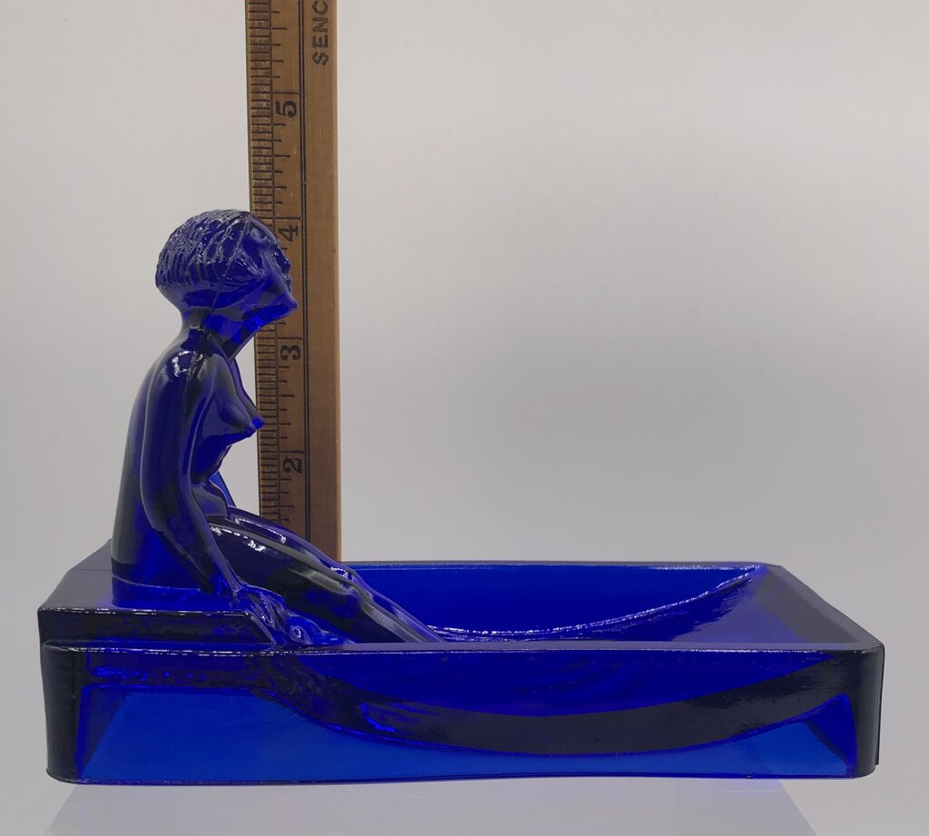 This is a cobalt glass 1981 reproduction of a Heinrich Hoffman Bathing Nude Lady soap dish.