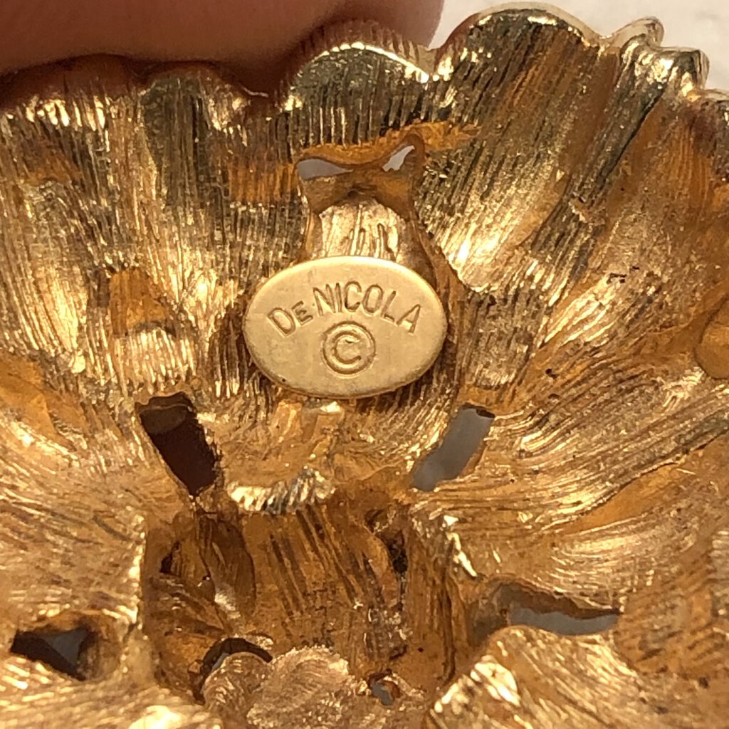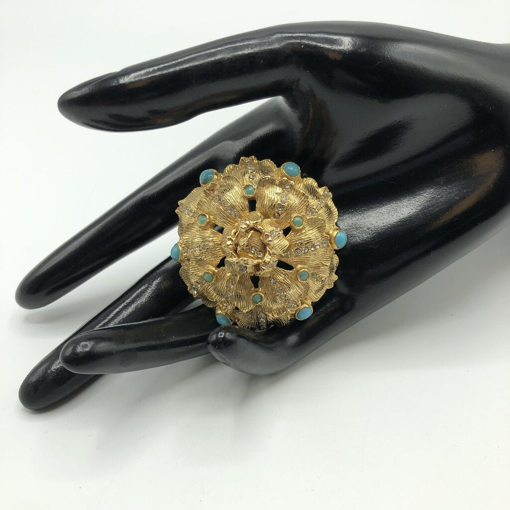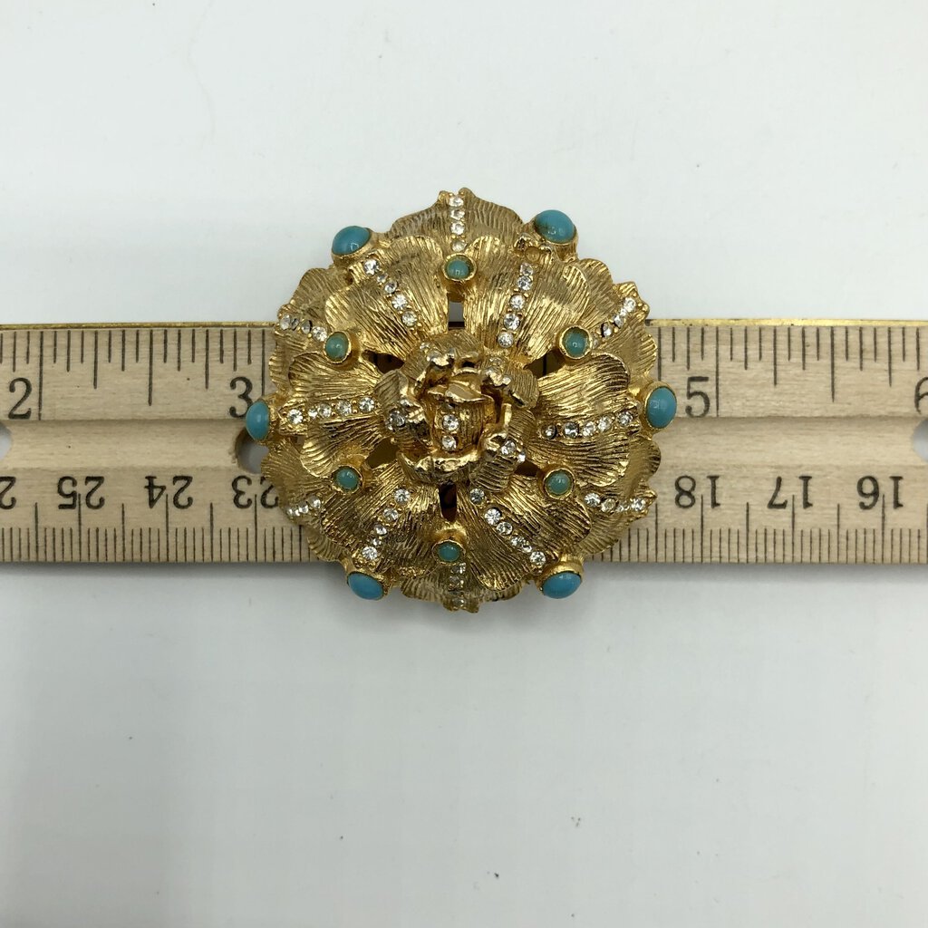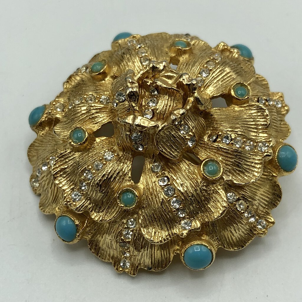 Well done and well designed brooch, styled in a full open flower bloom, accented with faux turquoise beads and crystal rhinestones.