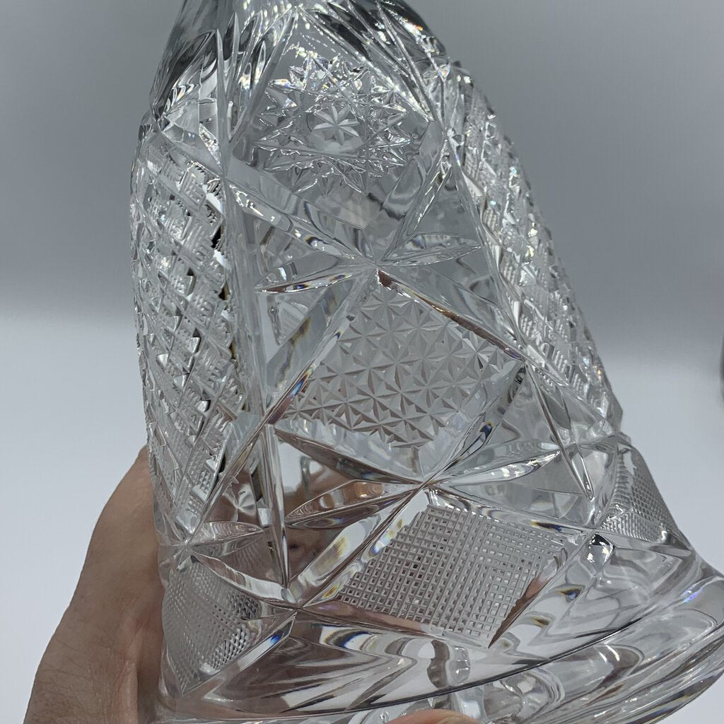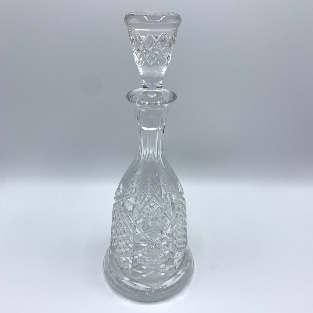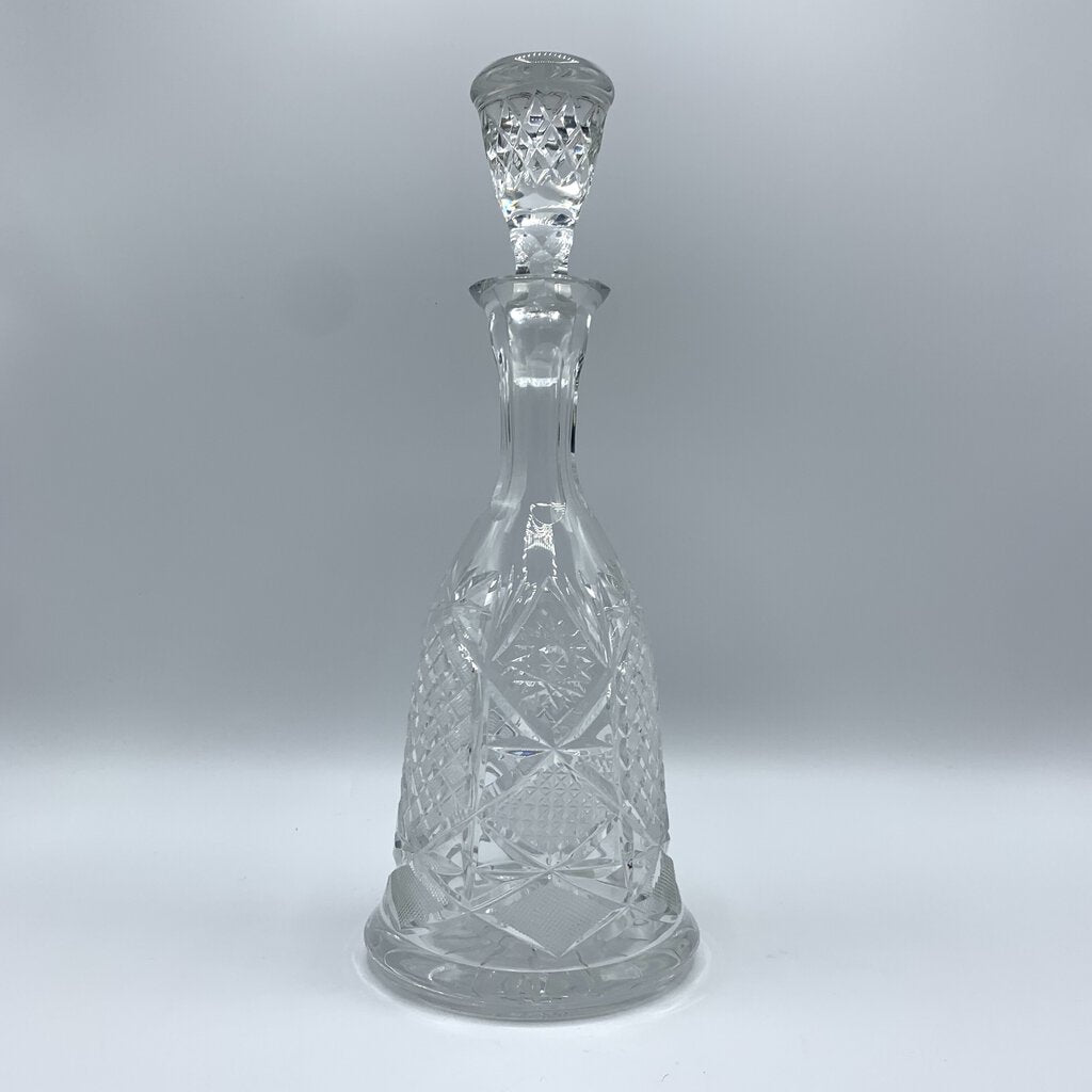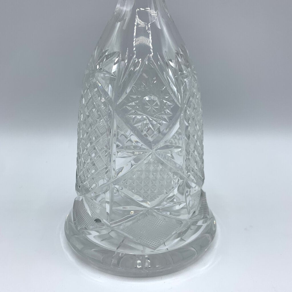 Gorgeous diamond and cut and pinwheel pattern on this elegant decanter. It has a lovely bell shape to it and a diamond cut and starburst designed stopper.