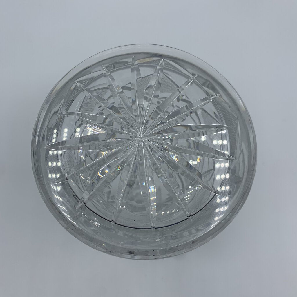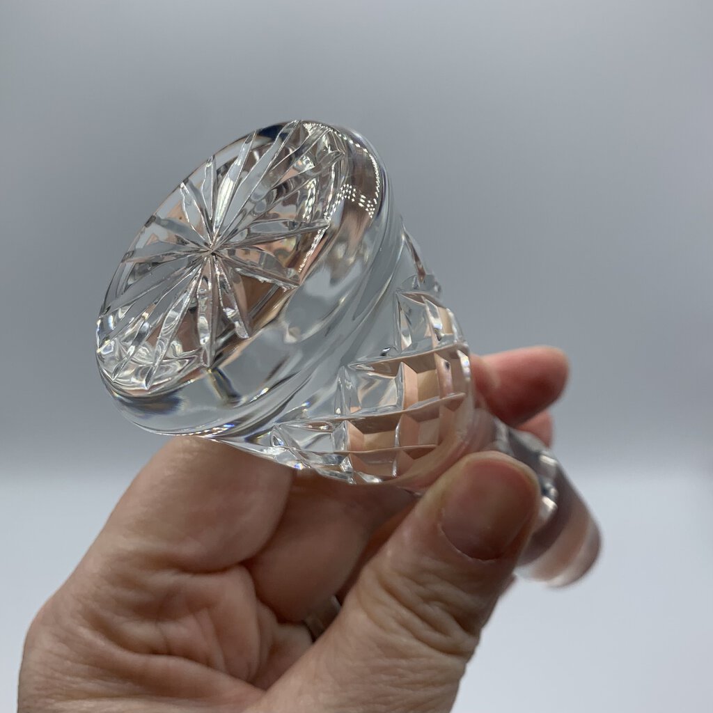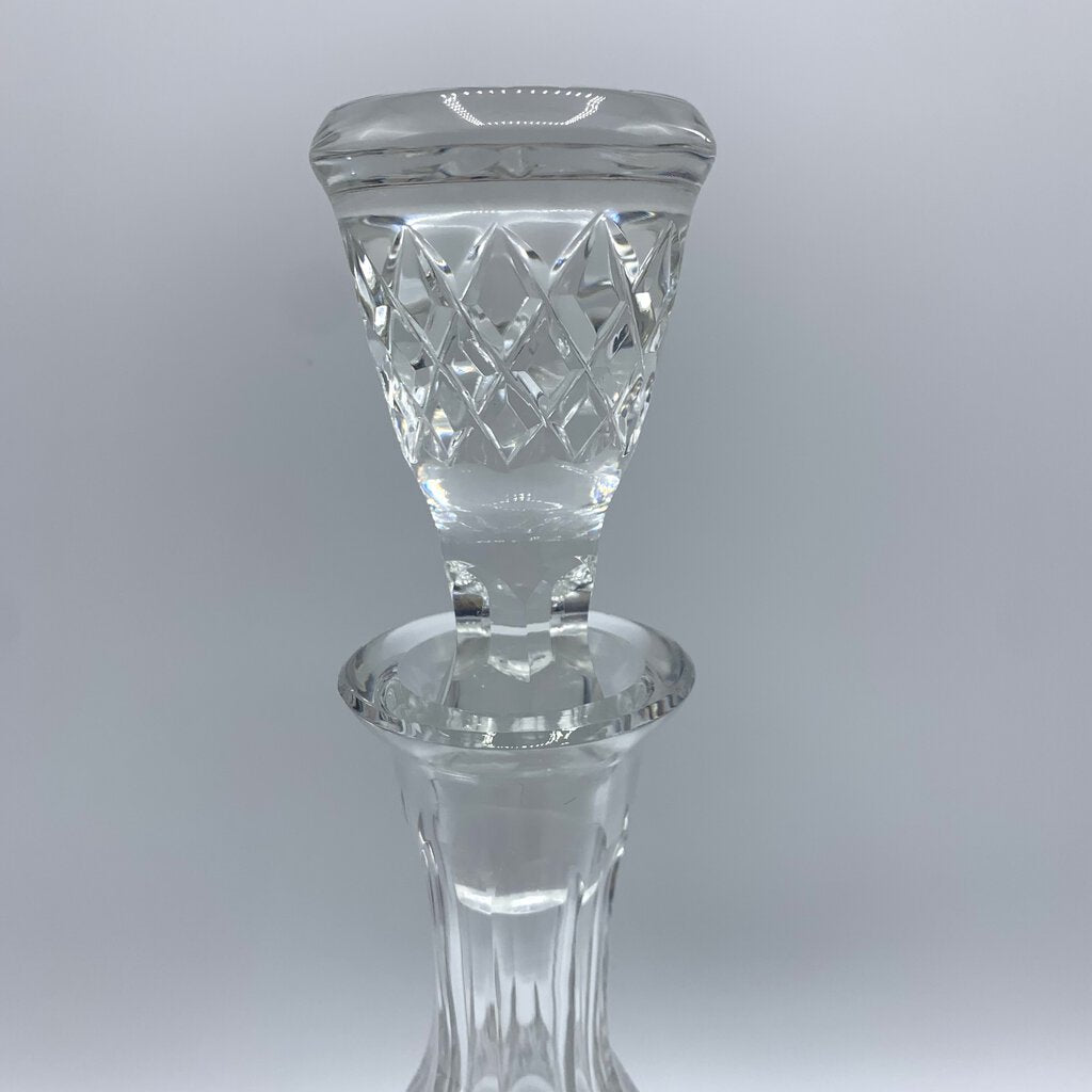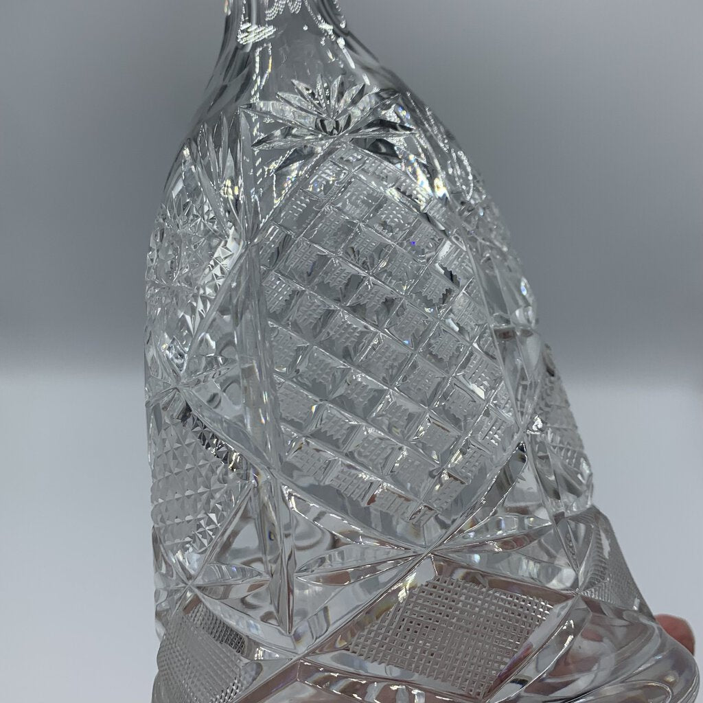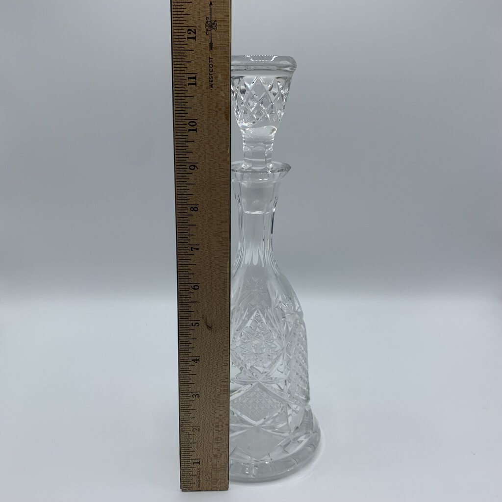 Gorgeous diamond and cut and pinwheel pattern on this elegant decanter. It has a lovely bell shape to it and a diamond cut and starburst designed stopper.