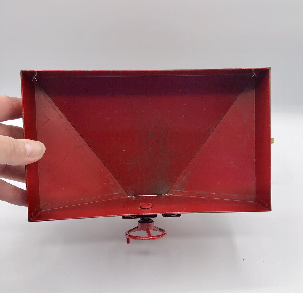 The body is a red metal. The working gravity feed wheel turns with a gear to move the feed door up and down.