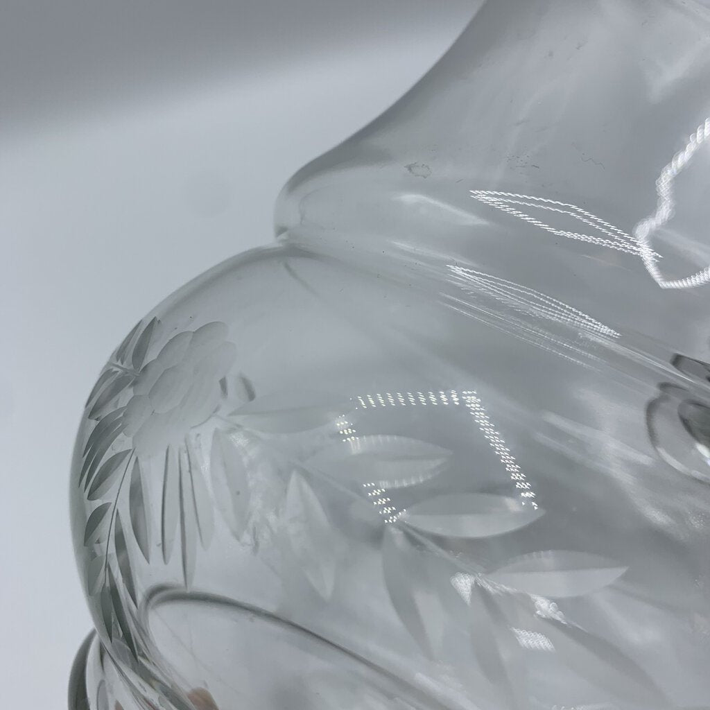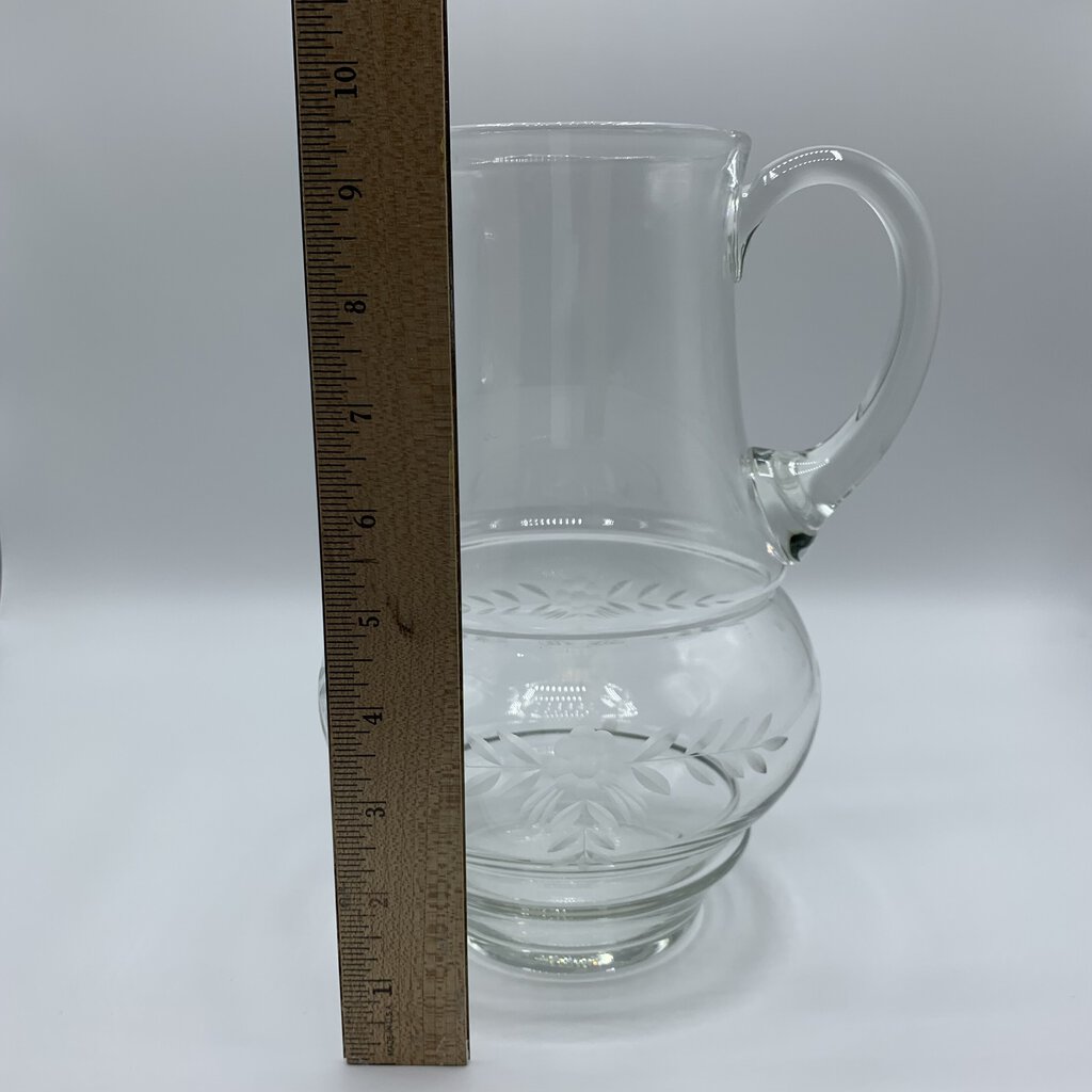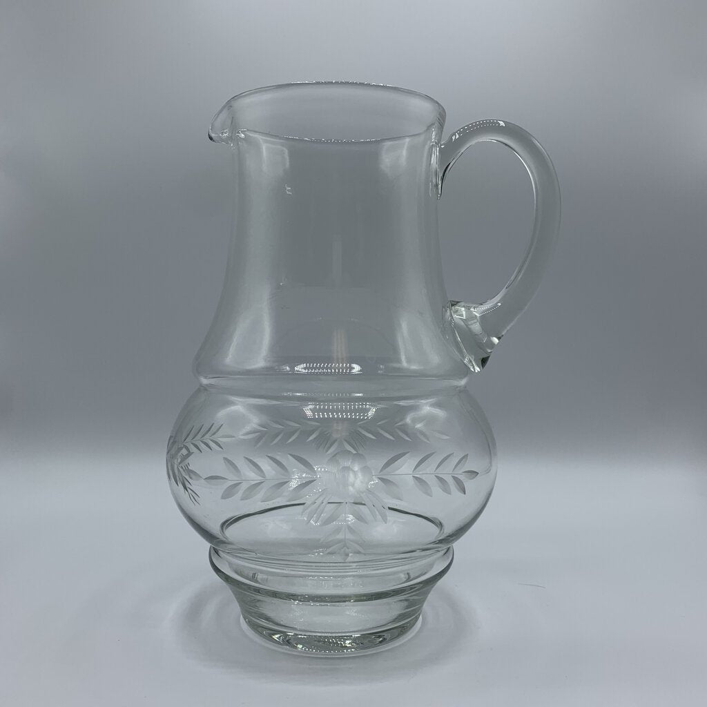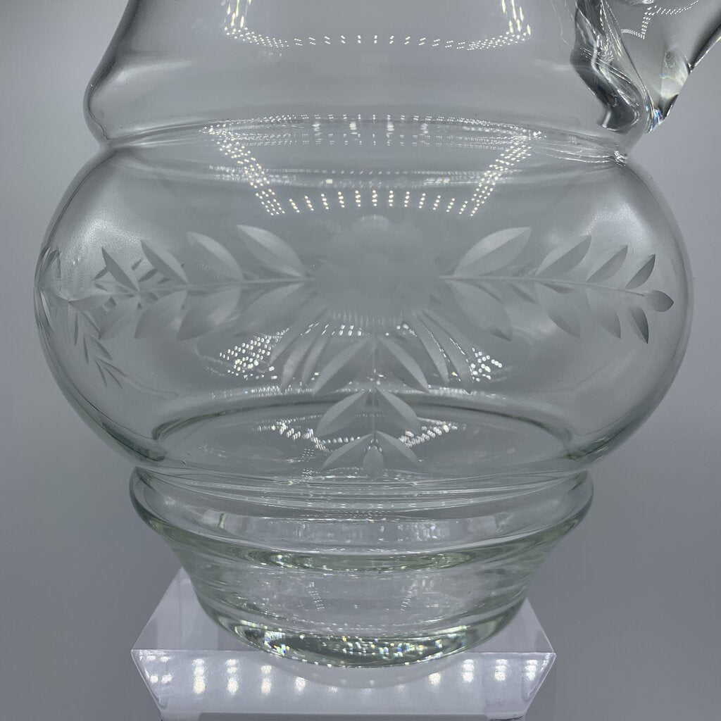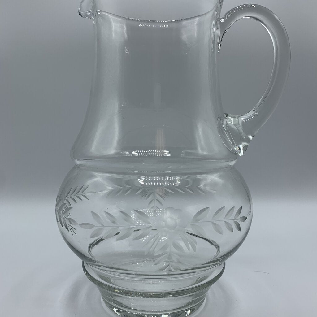 Vintage charm abounds on this etched clear glass pitcher! The pitcher is handblown and features a beautiful flower and laurel etching. Would be enchanting for your Spring or Summer entertaining.