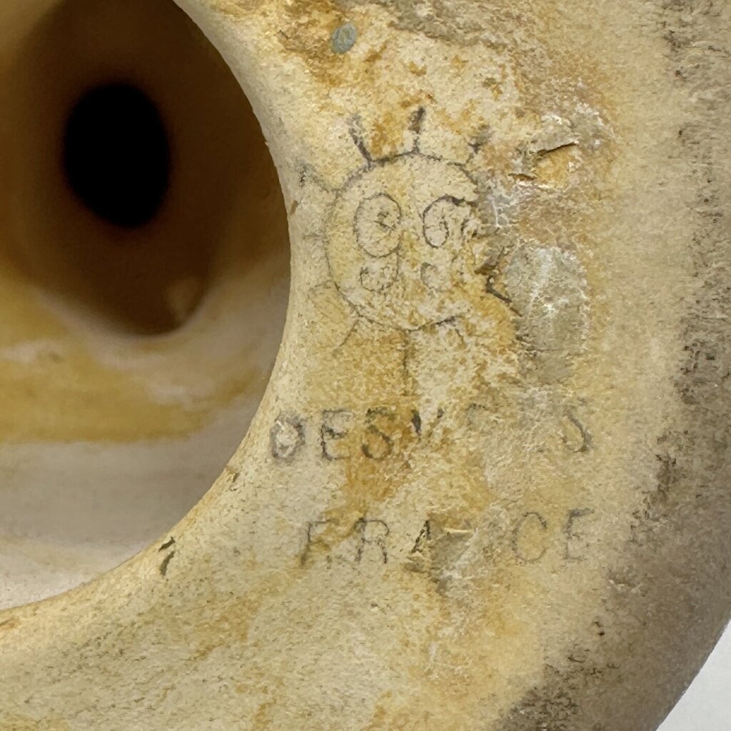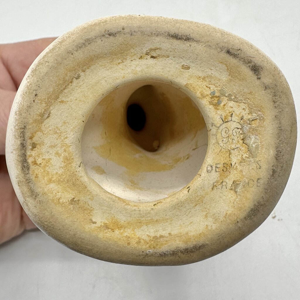 Small vintage pink singing angel figurine made by Gabriel Fourmaintraux in Desvres France. Desvres is deeply tied to its famous earthenware (faïence) production, starting from Gallo-Roman times, with significant growth in the 18th-19th centuries under families like the Fourmaintraux. This adorable handmade 3 1/2” tall kneeling angel is wearing a pink robe and is holding a blue hymnal. It has a lovely high gloss finish and is signed on the bottom. In very good vintage condition with light age and use appropriate wear, no chips, cracks, or crazing.
