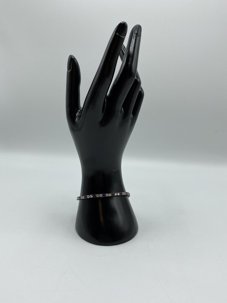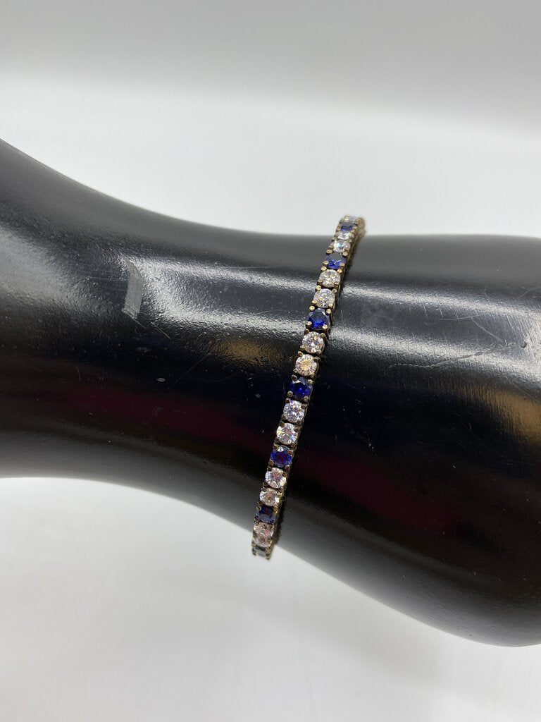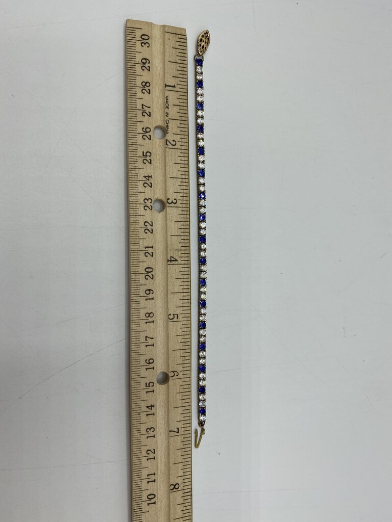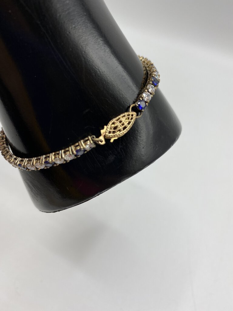 Nice sparkle is found on this rhinestone and sapphire crystal stone bracelet. This bracelet measures 7” in length and the stones are set in a gold toned metal. Easy clasp to use and no stones are missing. Excellent gift for a bride or bridesmaid!