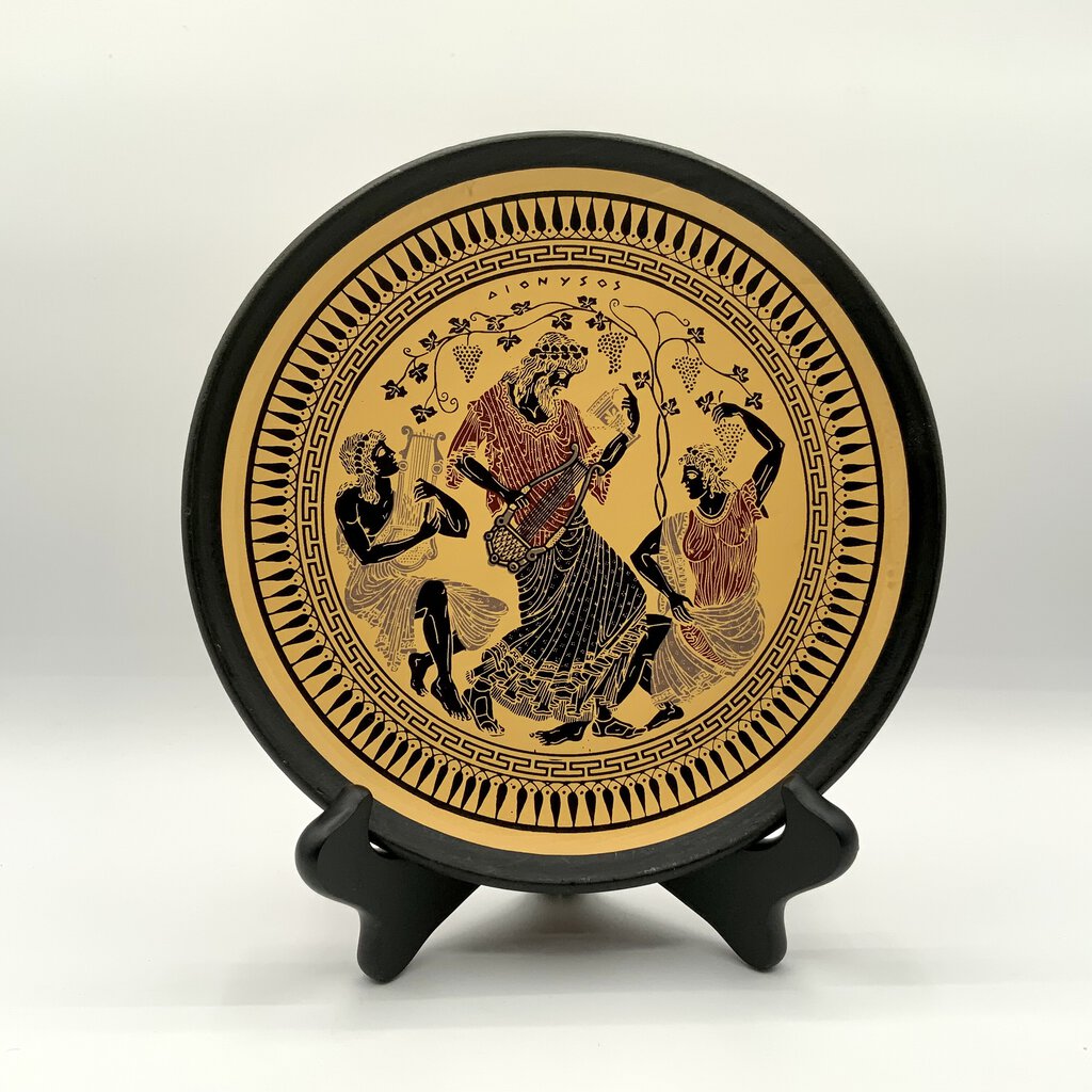Beautiful brand new Greek mythology painted terracotta collectible plate. Represents Dionysus the god of fertility and wine. He was later considered the god of wine and pleasure. Made in Greece. Vibrant gold and black colors that make the piece stand out. Perfect for wall decor and Greek mythology enthusiasts.