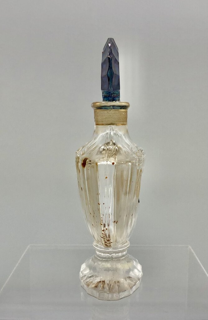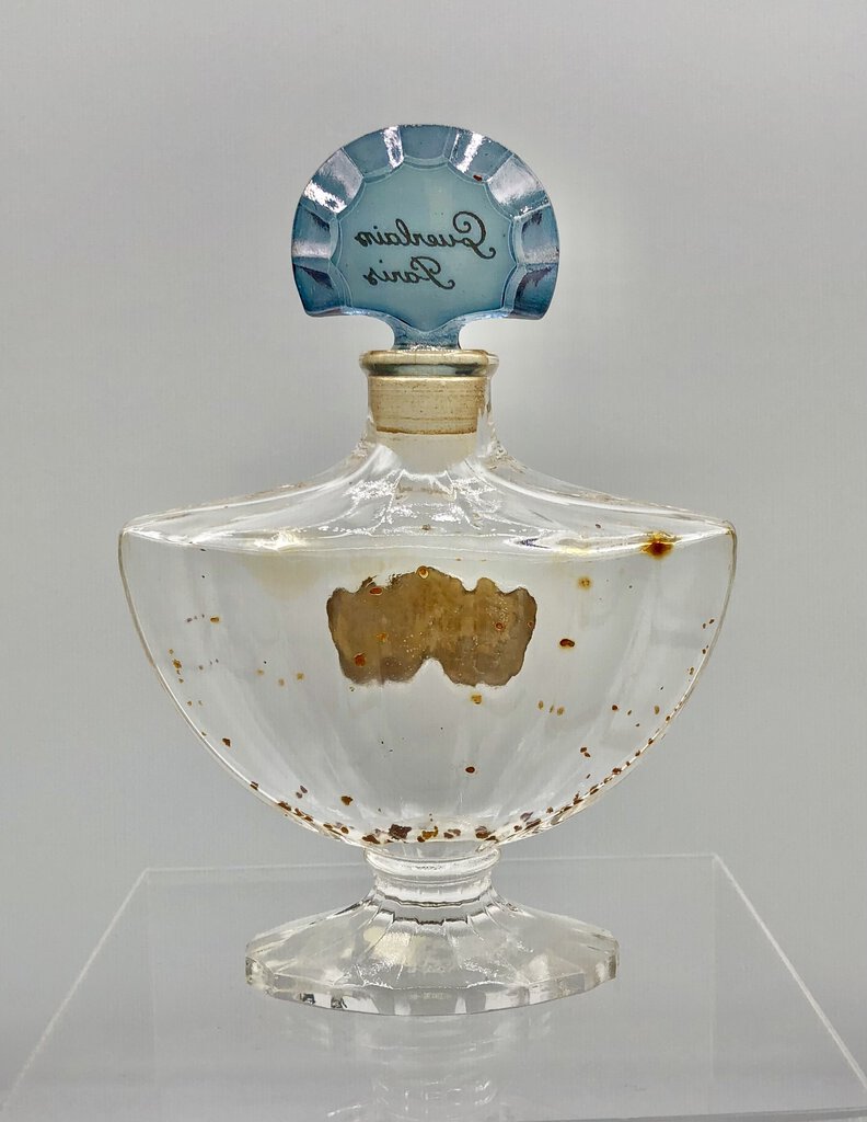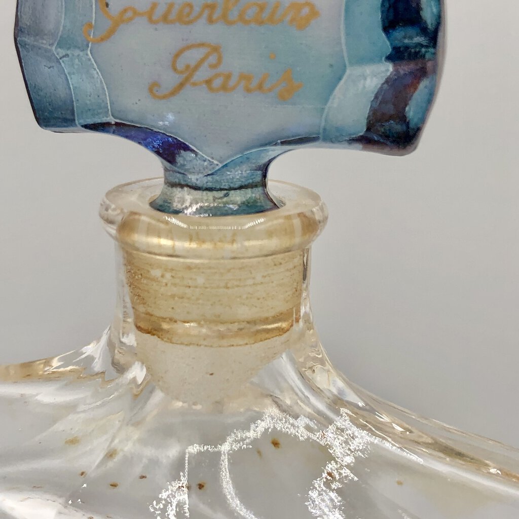 This vintage Guerlain Shalimar perfume bottle is from the mid 20th century. It has a purple blue fan stopper with gold writing.