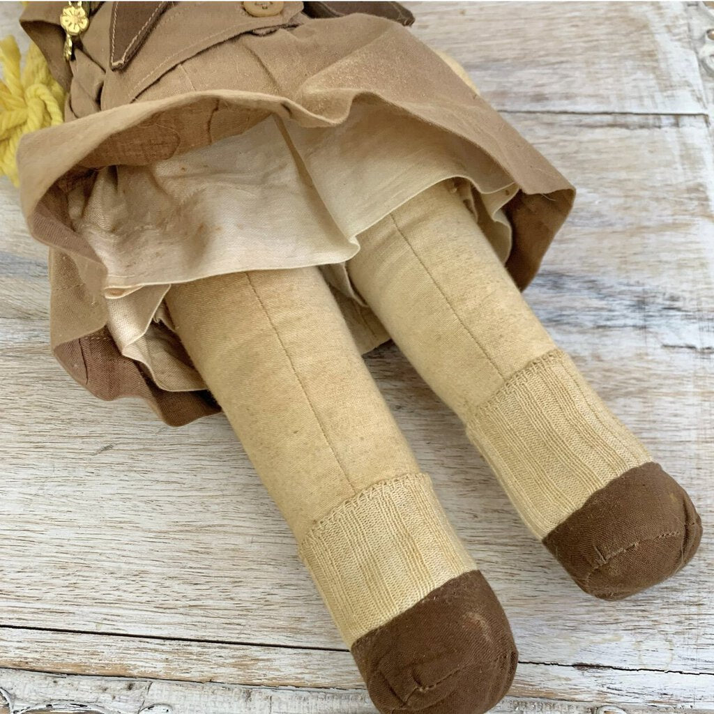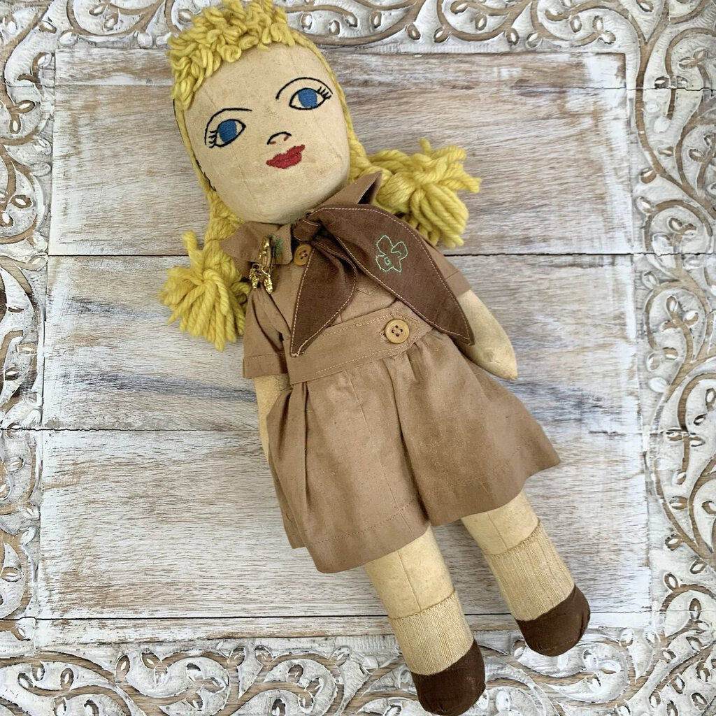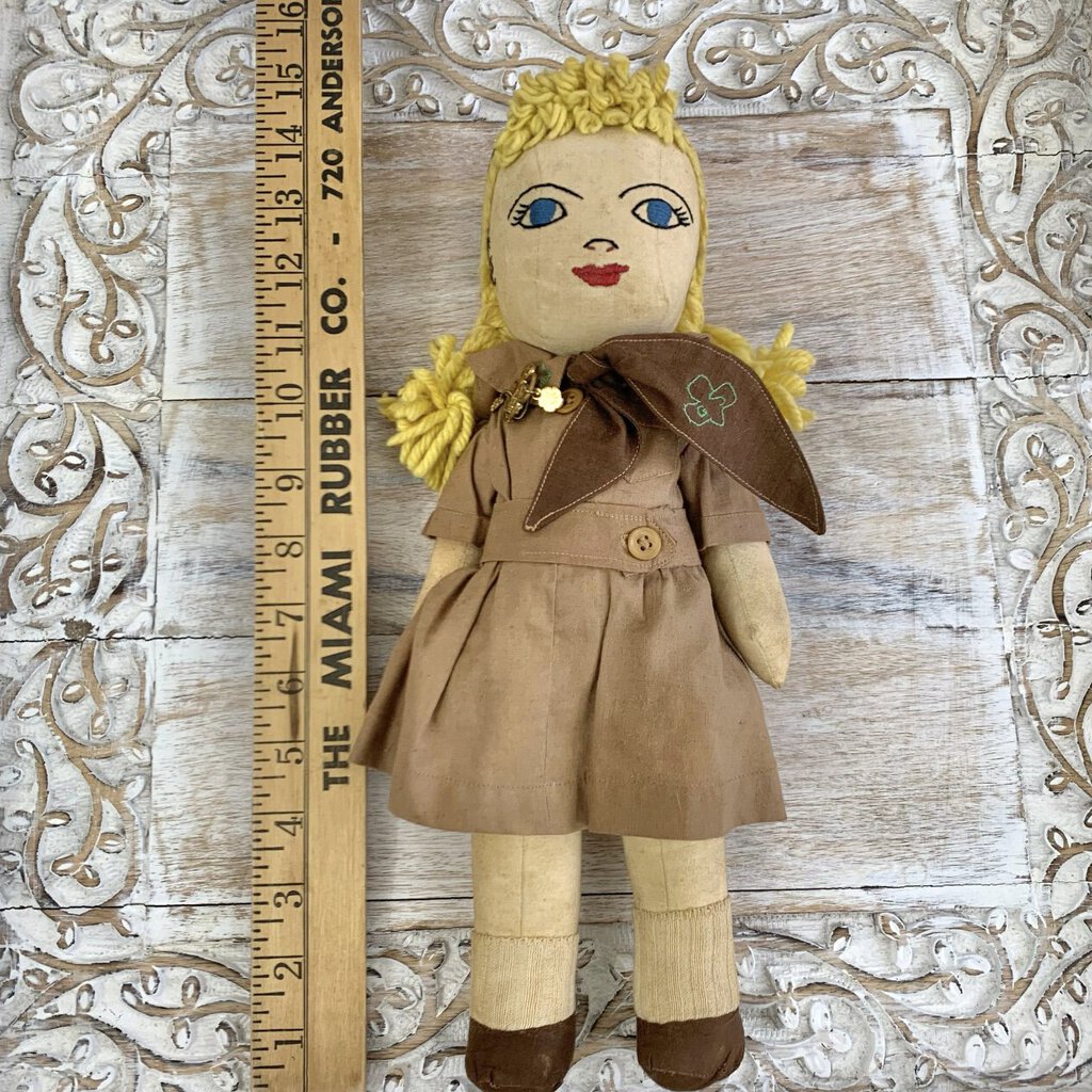 Adorable details to this vintage textile Brownie doll, likely made between the 1940s-1950s based on the Brownie uniform the doll is wearing. The doll has an embroidered trefoil design on her neckerchief, and a real vintage trefoil pin on her collar. Her face was hand-embroidered as well as her ears. Her dress is layered, with a slip and even little bloomers underneath. The doll was estate-owned and is in good vintage condition. The body and clothes of the doll are in excellent shape, but she is dirty and would benefit from a knowledgeable cleaning.It measures 14 inches in length. Please carefully review the photos for condition details.