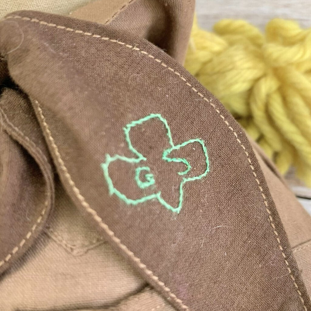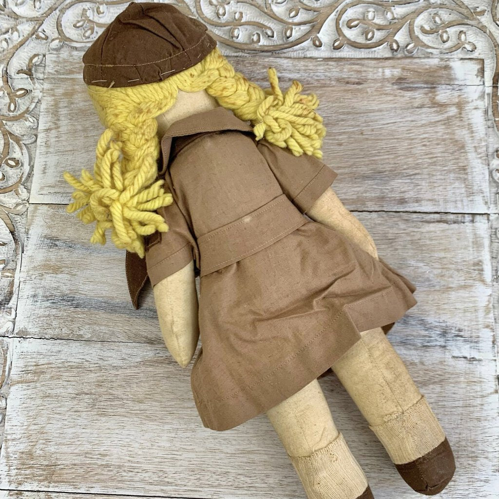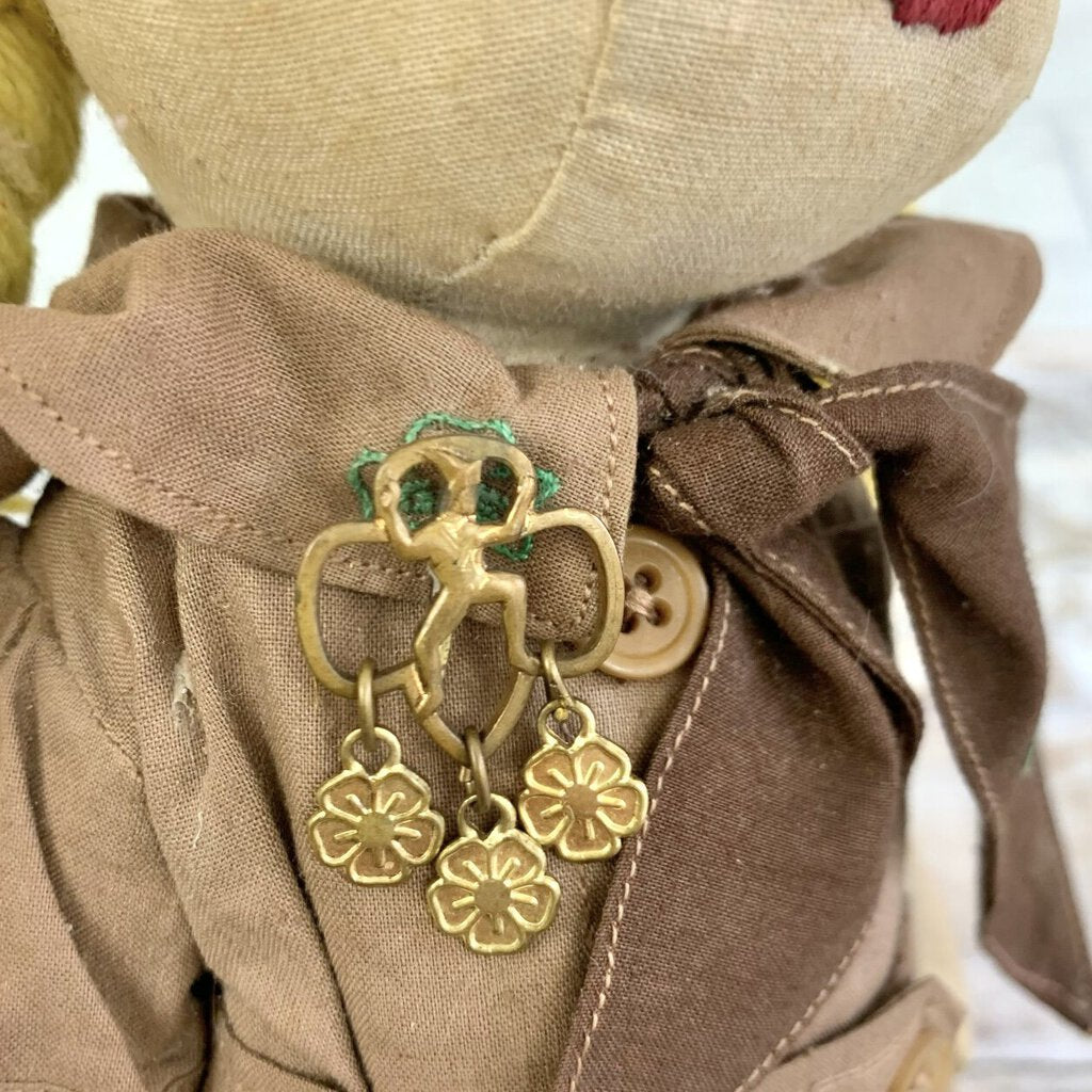 Adorable details to this vintage textile Brownie doll, likely made between the 1940s-1950s based on the Brownie uniform the doll is wearing. The doll has an embroidered trefoil design on her neckerchief, and a real vintage trefoil pin on her collar. Her face was hand-embroidered as well as her ears. Her dress is layered, with a slip and even little bloomers underneath. The doll was estate-owned and is in good vintage condition. The body and clothes of the doll are in excellent shape, but she is dirty and would benefit from a knowledgeable cleaning.It measures 14 inches in length. Please carefully review the photos for condition details.