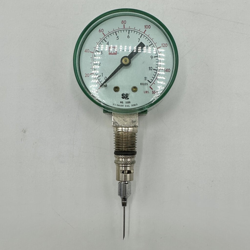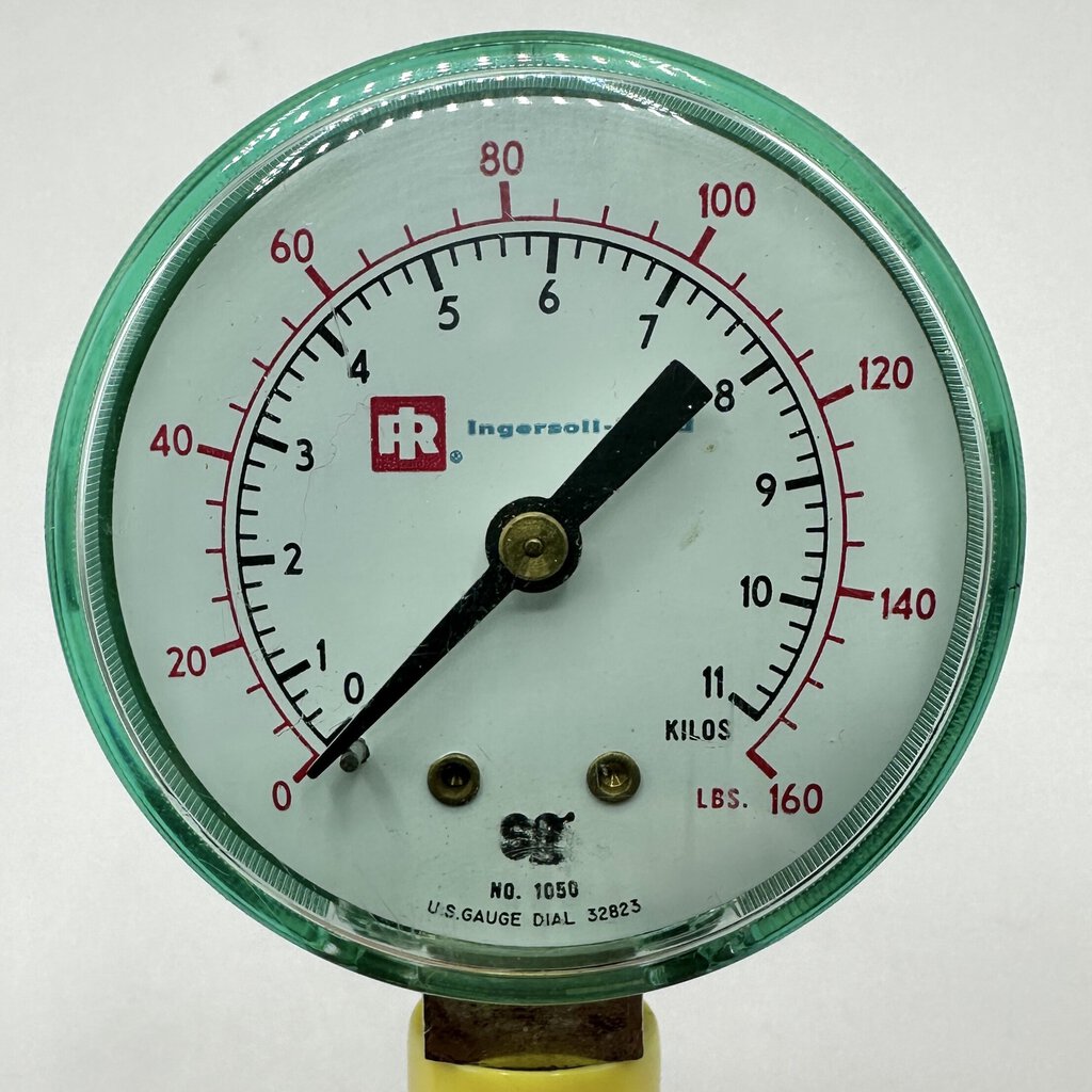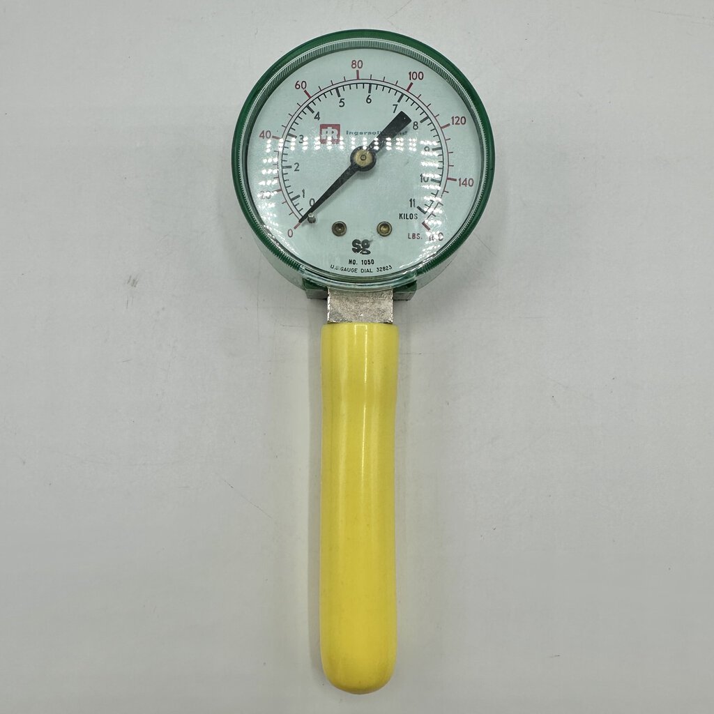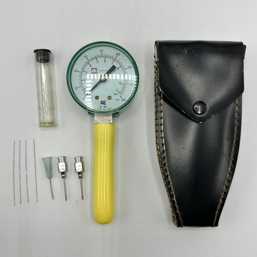 Vintage Ingersoll-Rand No 1050 Needle Air Pressure Gauge. U.S. Gauge Dial 32823, 0-160 psi. Includes leather case and additional needles. Could not be tested. Visually in very nice vintage condition. It shows light wear and there is a small crack on the top of the plastic housing. Please carefully review the photos for condition details.