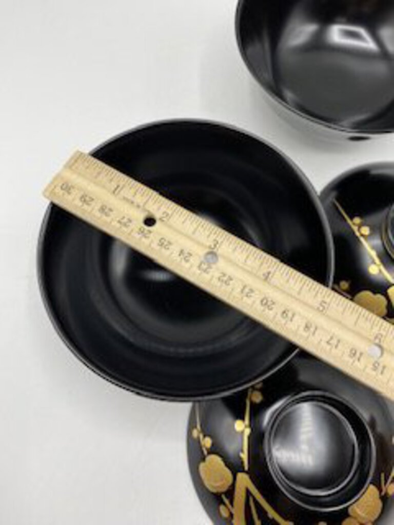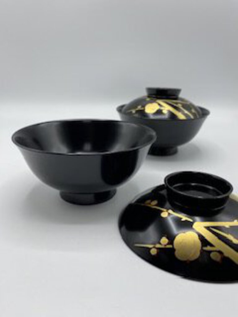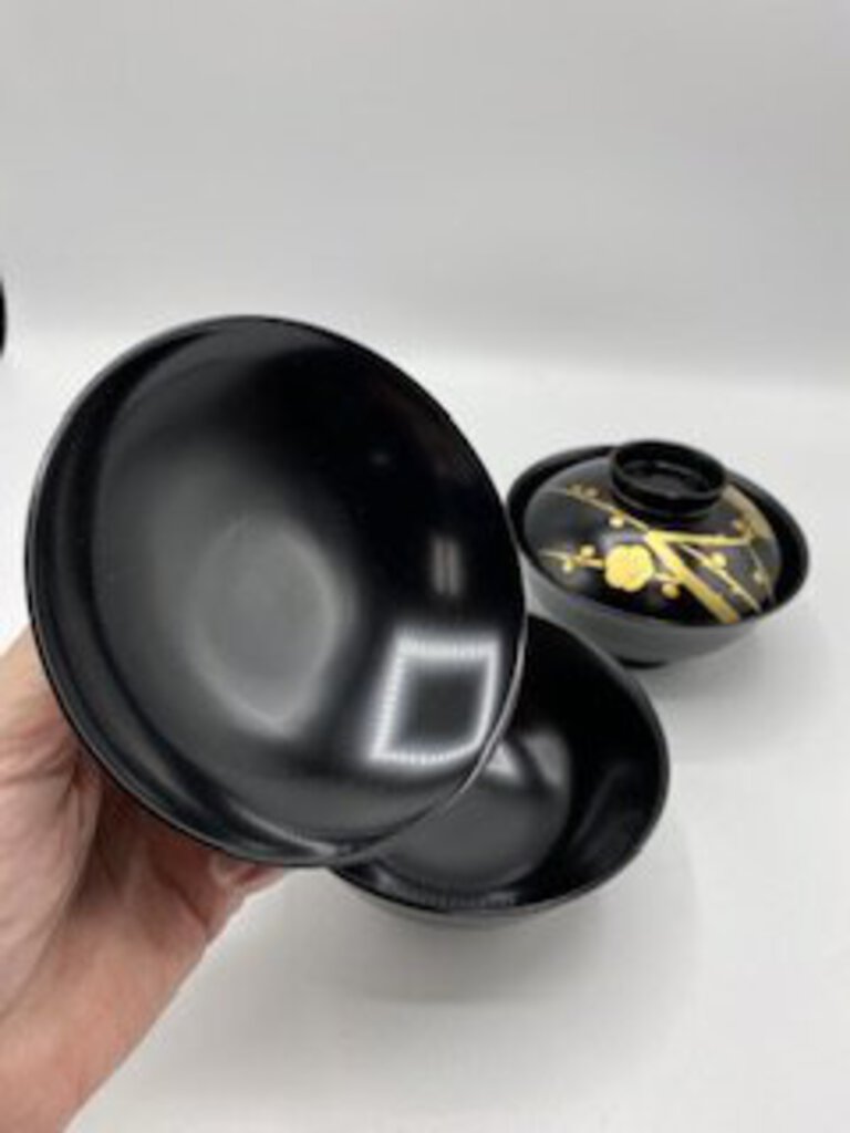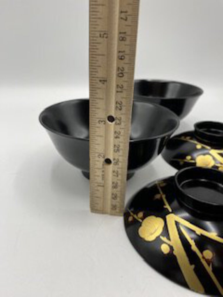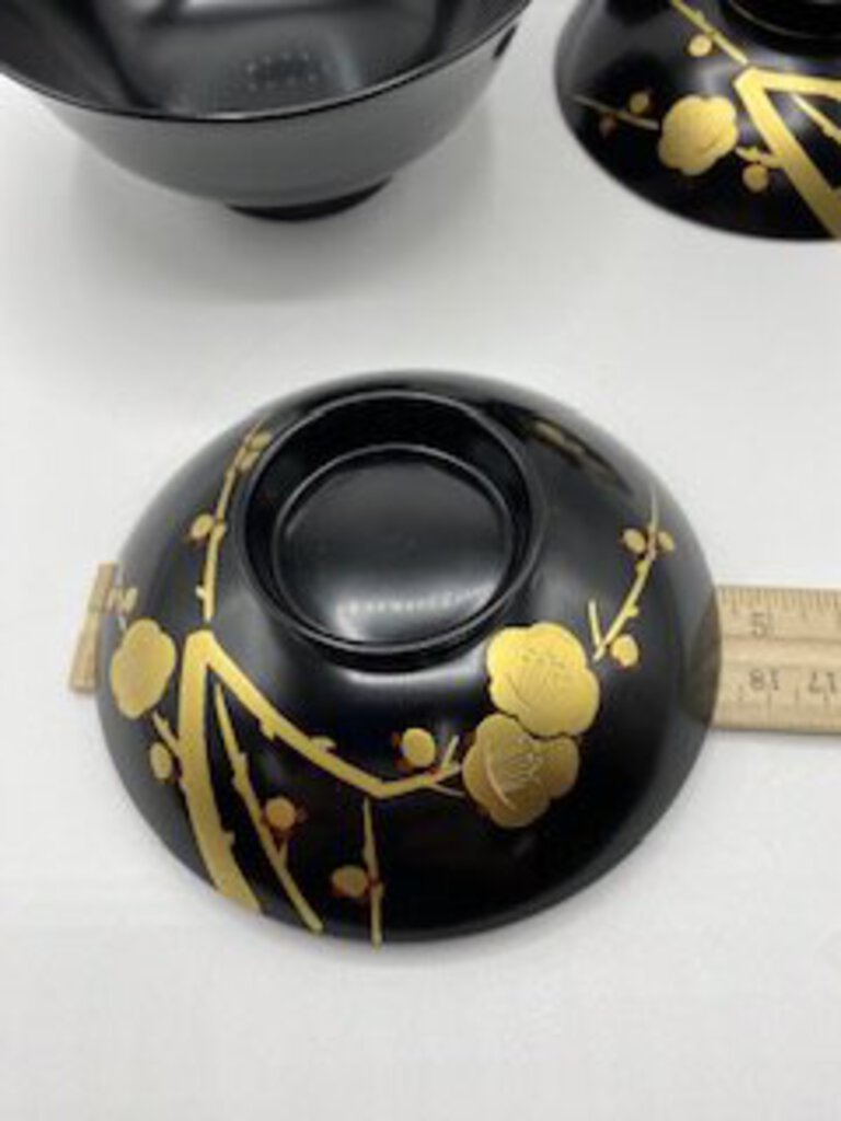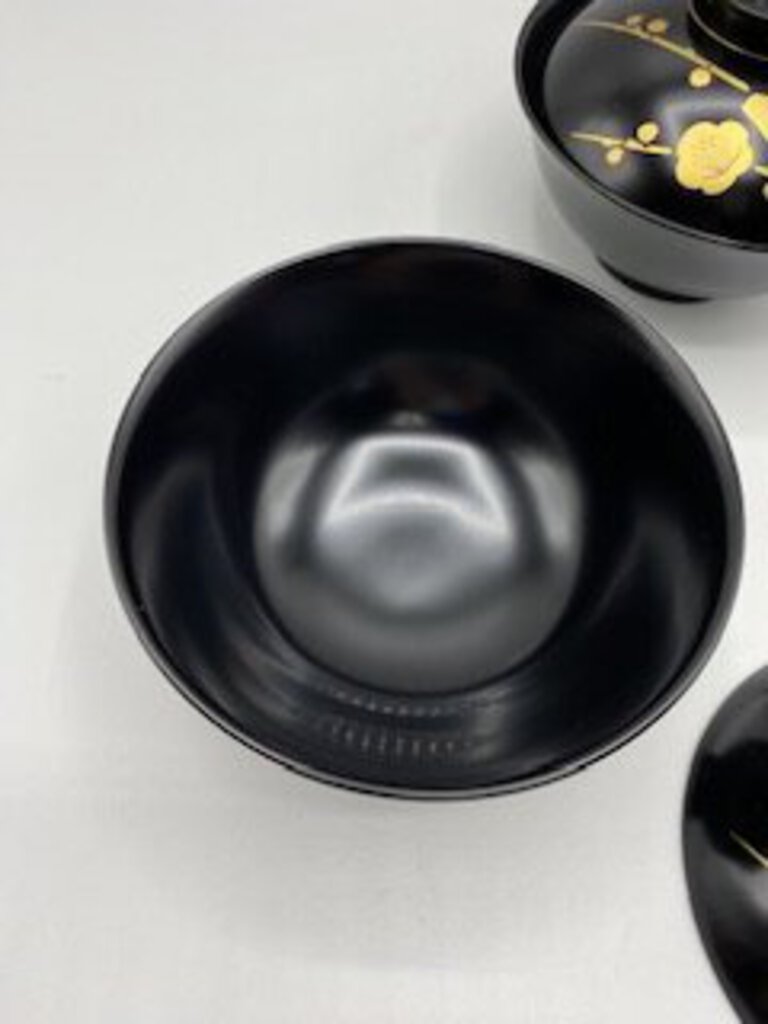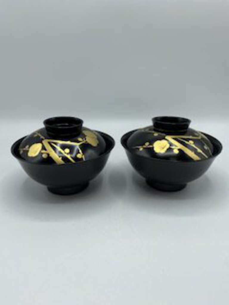 Matching set of two Japanese black lacquer soup bowls with lids. Lids are decorated with gold branches of cherry blossoms and small red dots of accent color. Bowls measure 5” in diameter and 2.5”deep. No chips, or cracks, no scratches in gold floral design, clean.