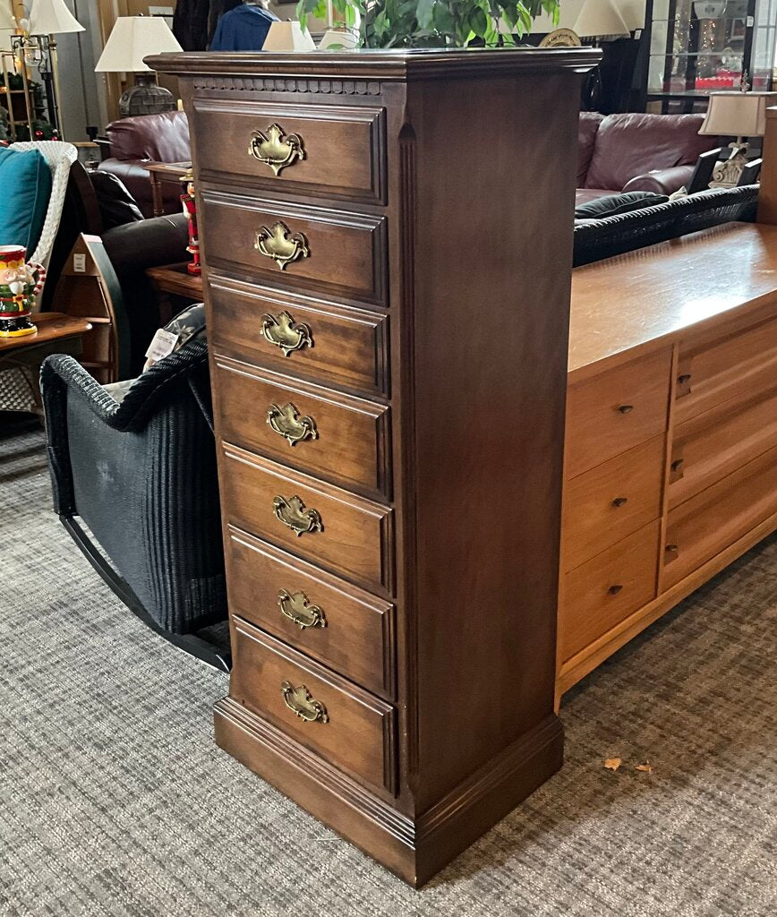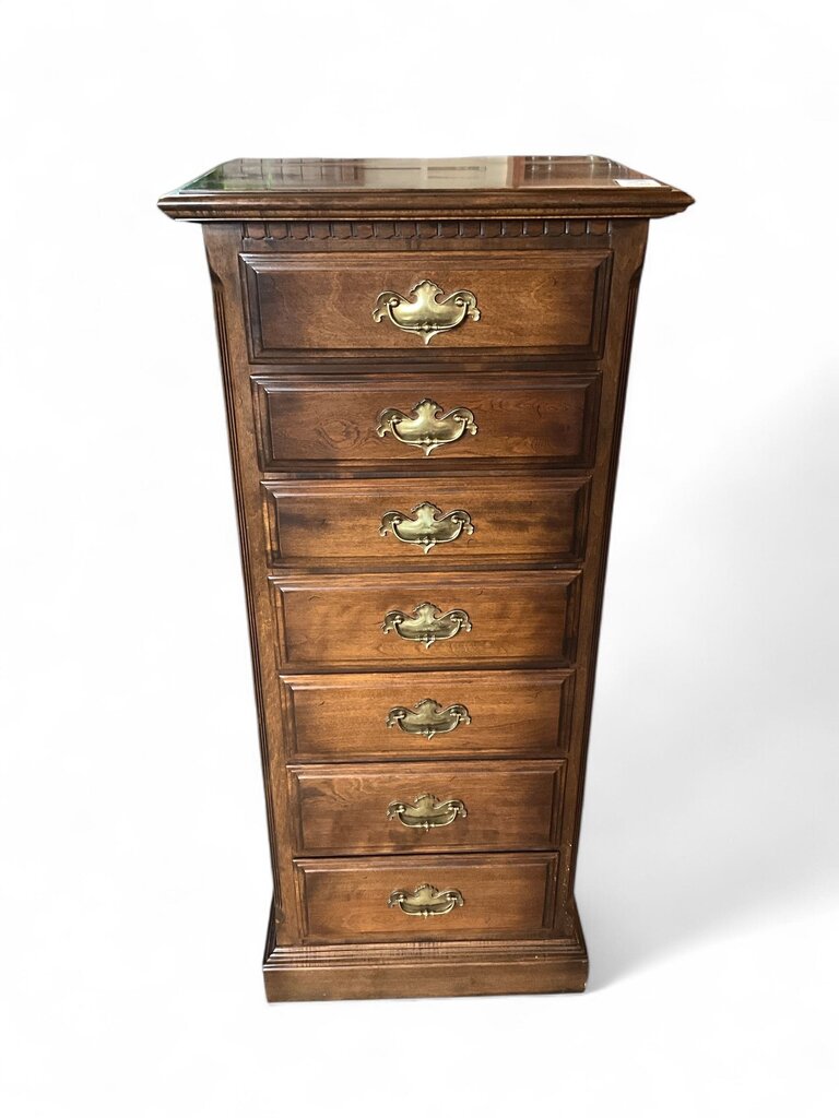 This chest is in amazing condition and has no damage! There are 7 drawers in total, and the top drawer has soft, orange felt inside for jewelry. Beautiful brass hardware and this is such a great piece for any home!
