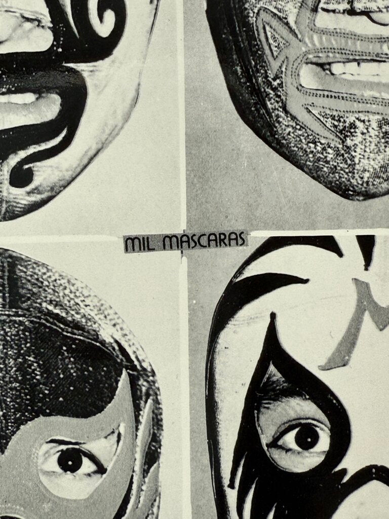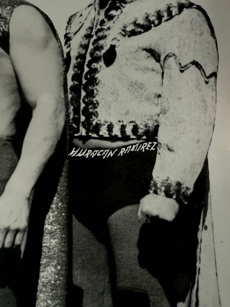 Estate set of 2 black and white photographs from Mexican Wrestling of Lucha Libre. High Gloss photo paper, sized approximately 5.5” x 3.5”. The photograph of two masked wrestlers in full costume reads on their belts, “Blue Demon” and “Huracan Ramirez”. The second photograph is a collage of 4 different masked wrestlers faces and inscribed in the center of the photo “Mil Mascaras”. No rips, tears, stains or odors in paper.