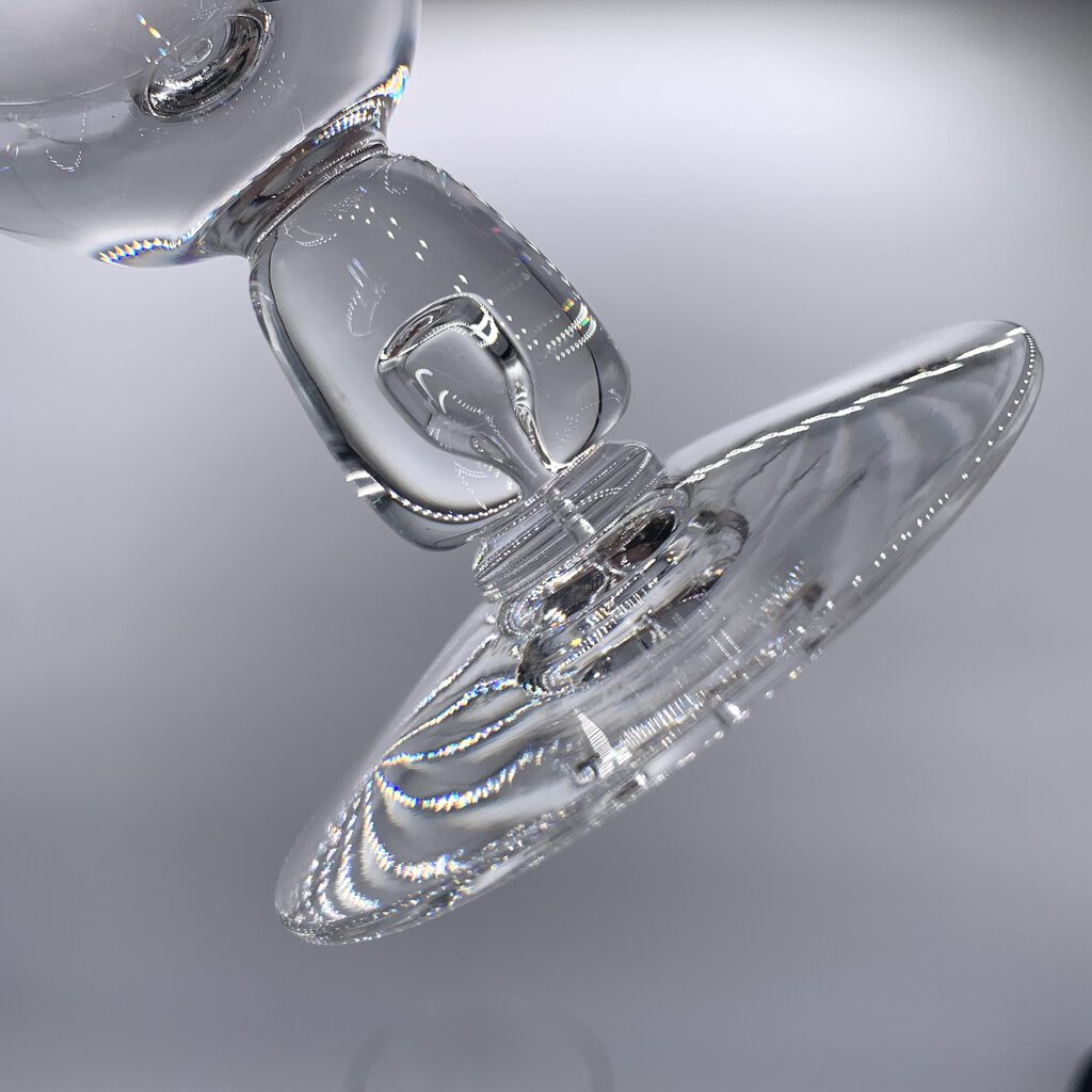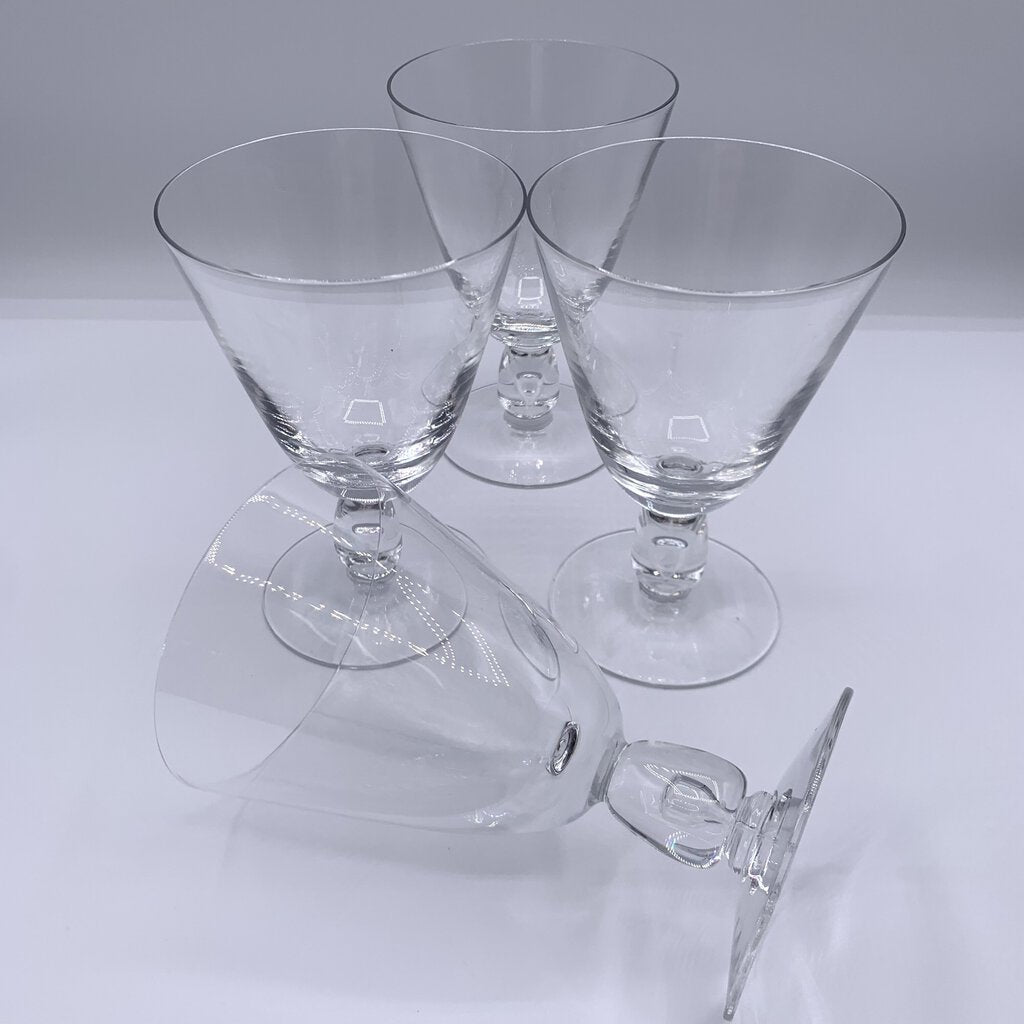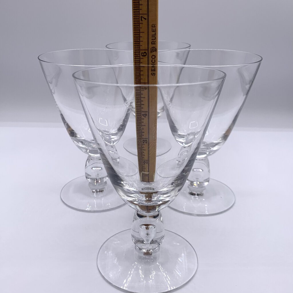 Unique teardrop controlled air bubble element on these mid-century water or wine goblets made by Fostoria between 1954-1965. This pattern was ahead of its time as it looks quite modern with the tear drop bubble stem despite being between 58 to 69 years old! Good design can be timeless!