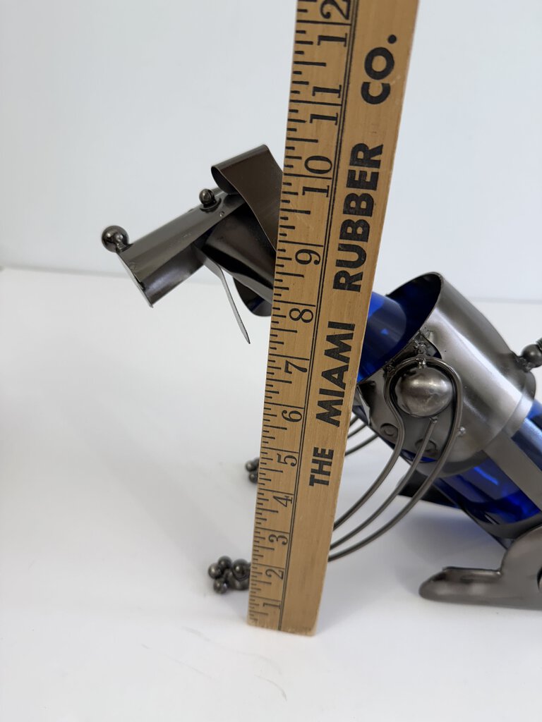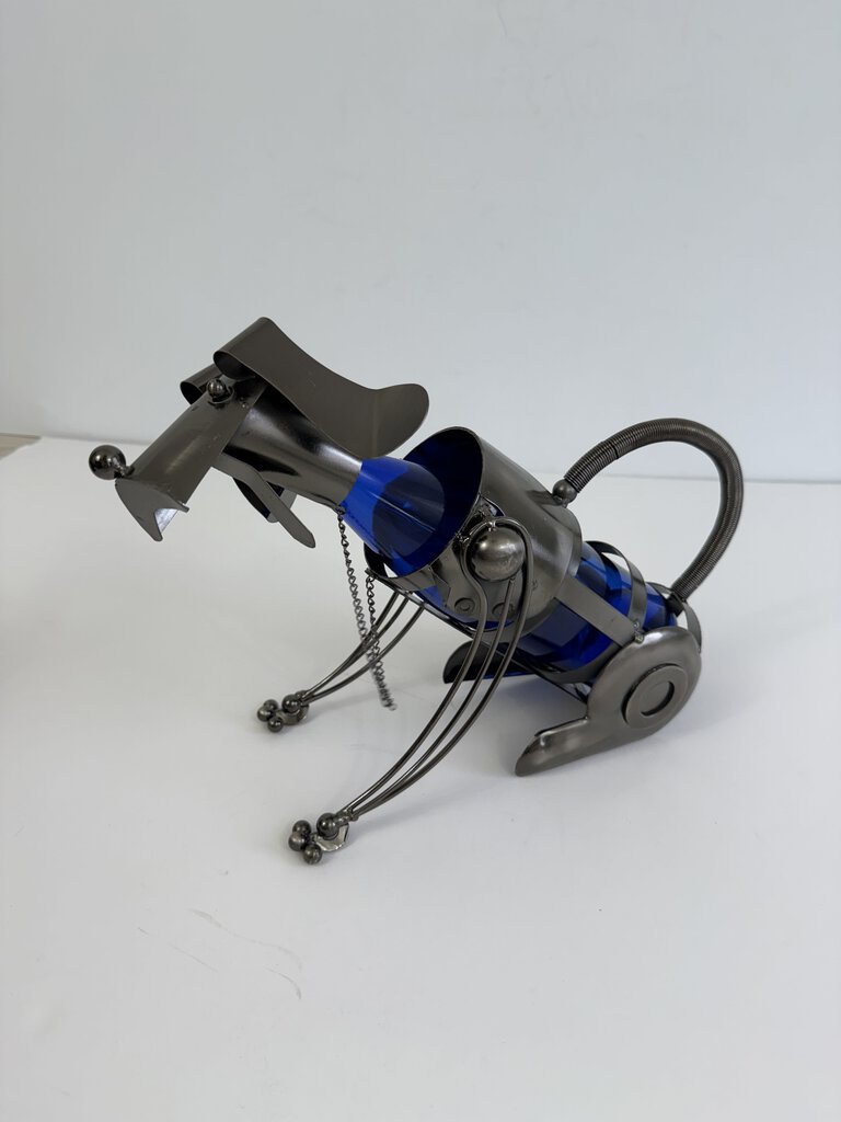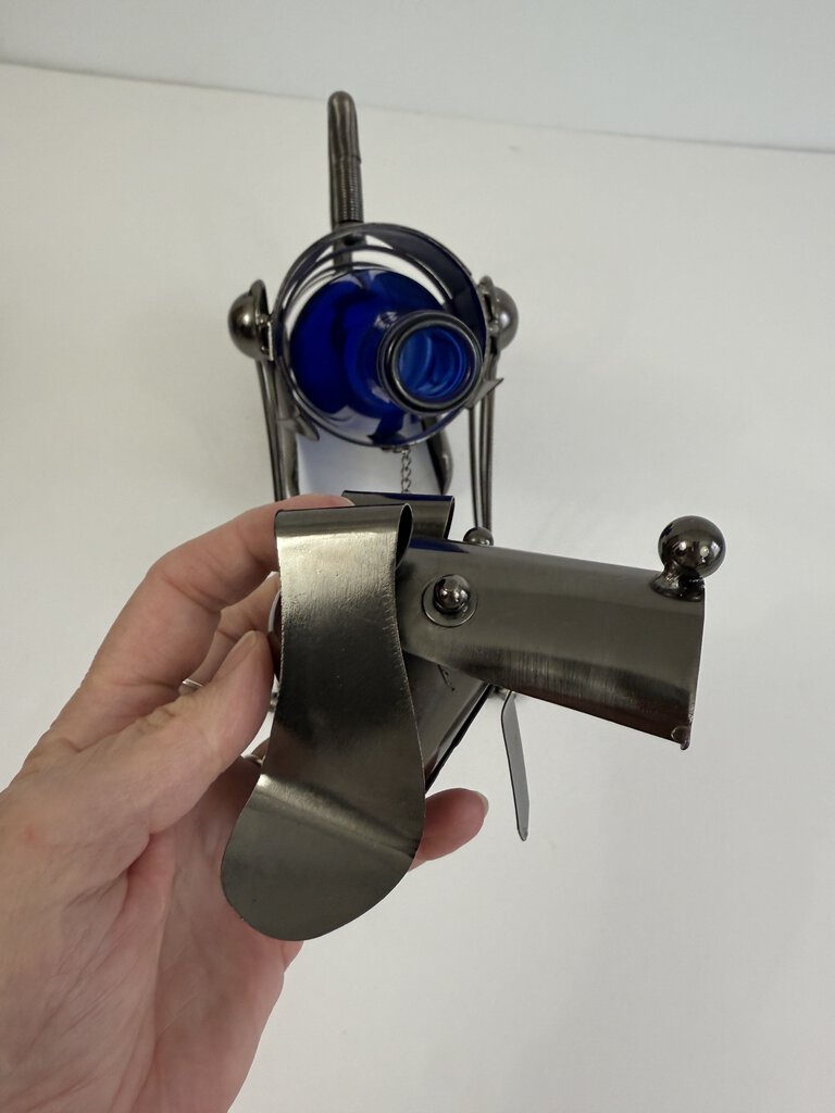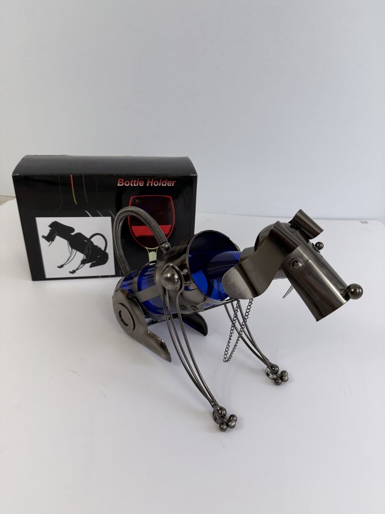 New in Box this novelty metal art wine bottle holder is in the shape of a cute dog. Great display for your bar. Originally from Groskopf’s a high end accessory store in Grand Rapids, MI.