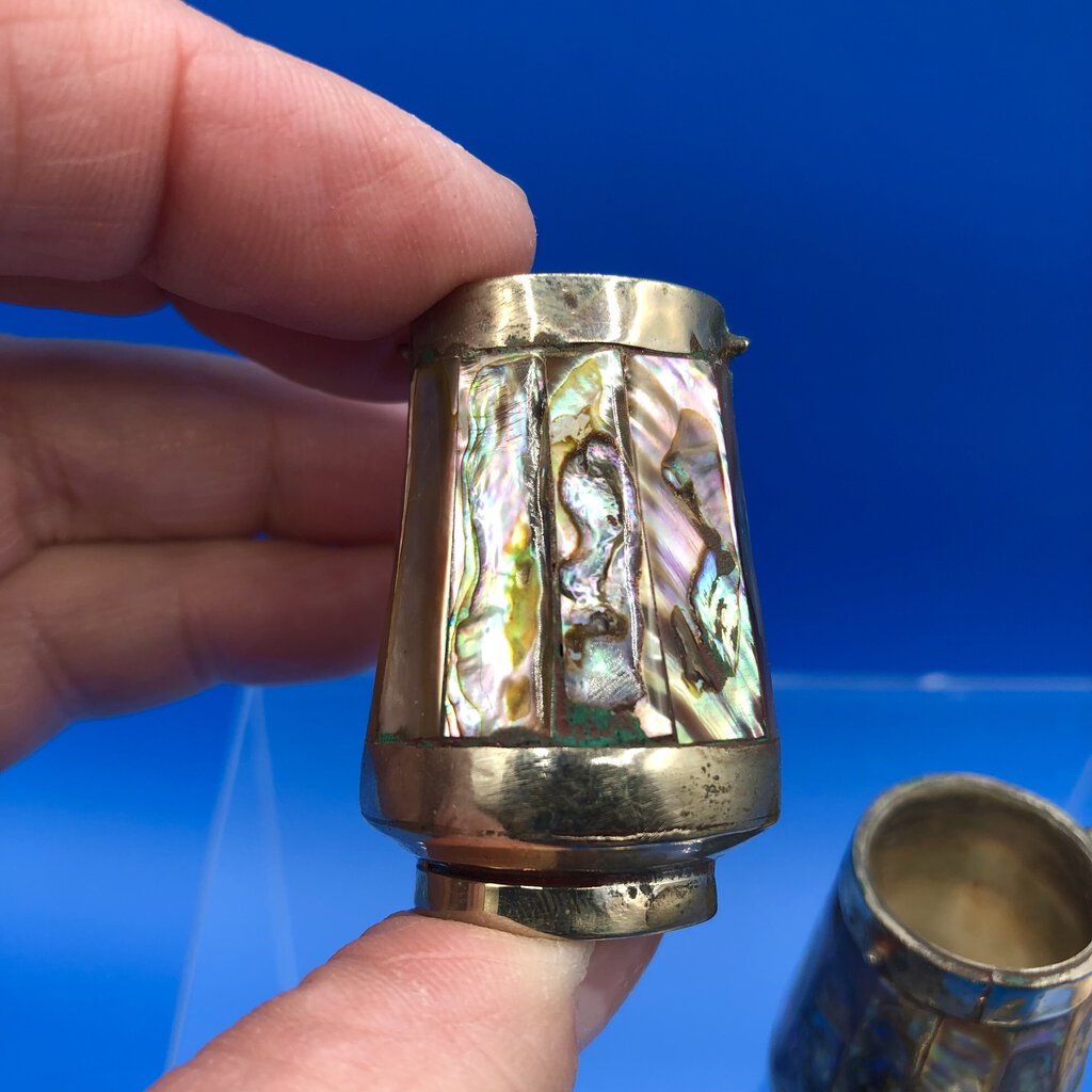 This is a lovely set of shakers made of abalone and alpaca silver, made in Mexico.