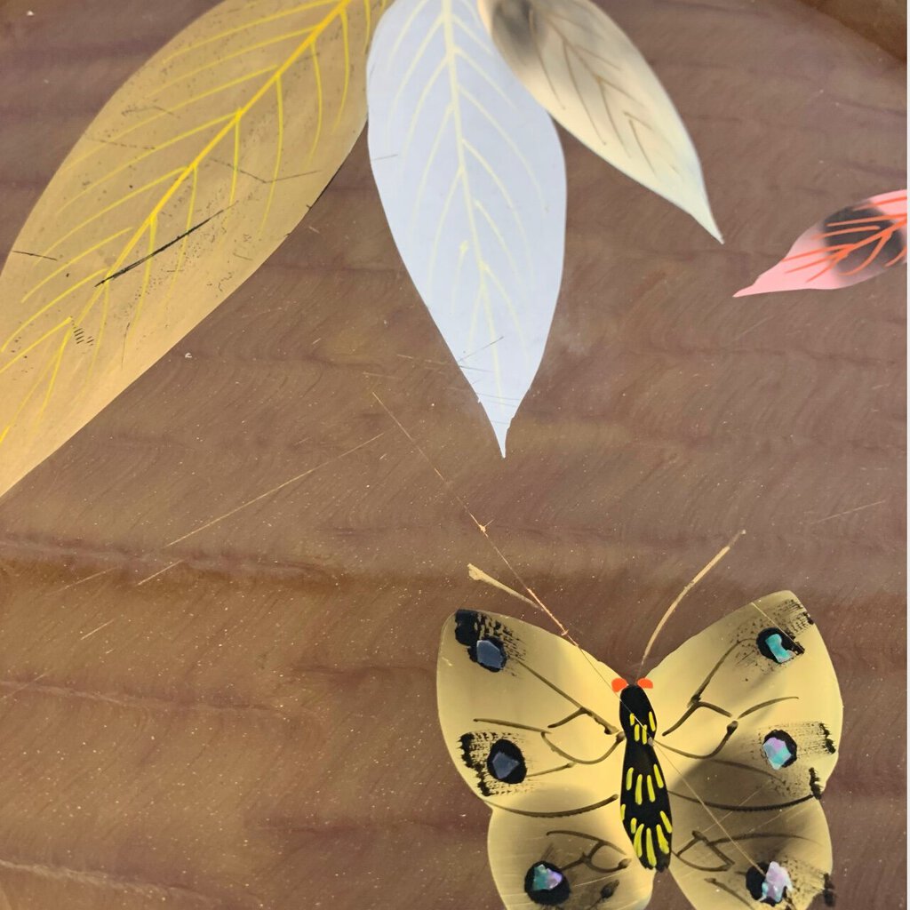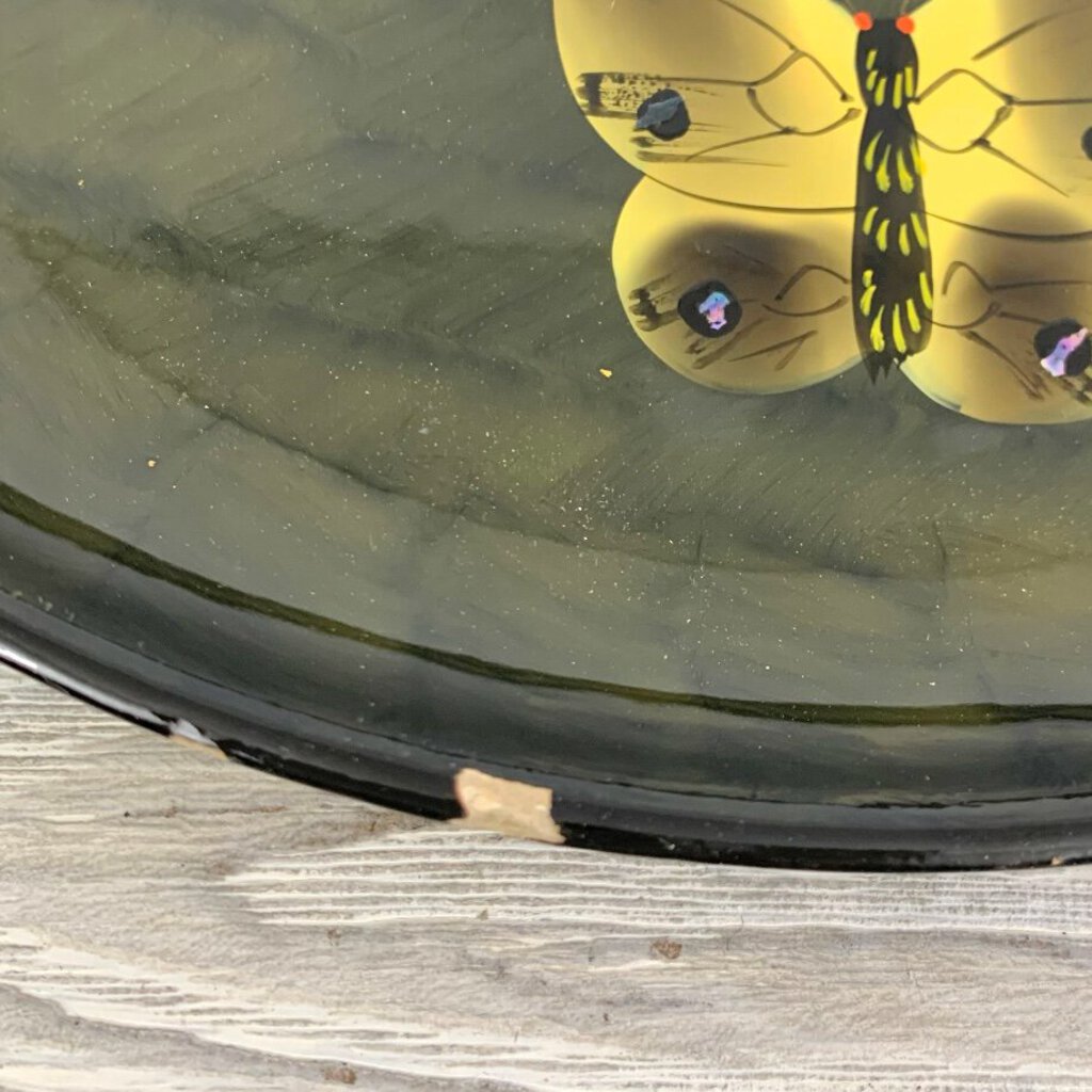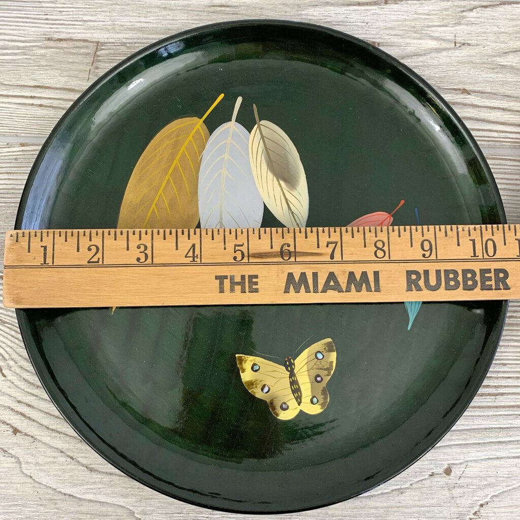 Great MCM lacquerware plates or trays made in Japan between the 1950s-1960s. They are hand-painted and feature a botanical scene with leaves and a butterfly. The butterfly’s wings have tiny chips of abalone shell affixed to them. These would make great bar trays, or wall hangings. Would look adorable in a MCM gallery wall configuration! The plates/trays were estate-owned and are in good vintage condition for the most part. You will see some chips around the edge of the plates, and some subtle scratching. Also some scratching on the bottoms of a couple of the plates. A few pieces of abalone shell are missing from the butterfly wings. Take a moment to look at the pictures for reference. They measure 10.75” in diameter.