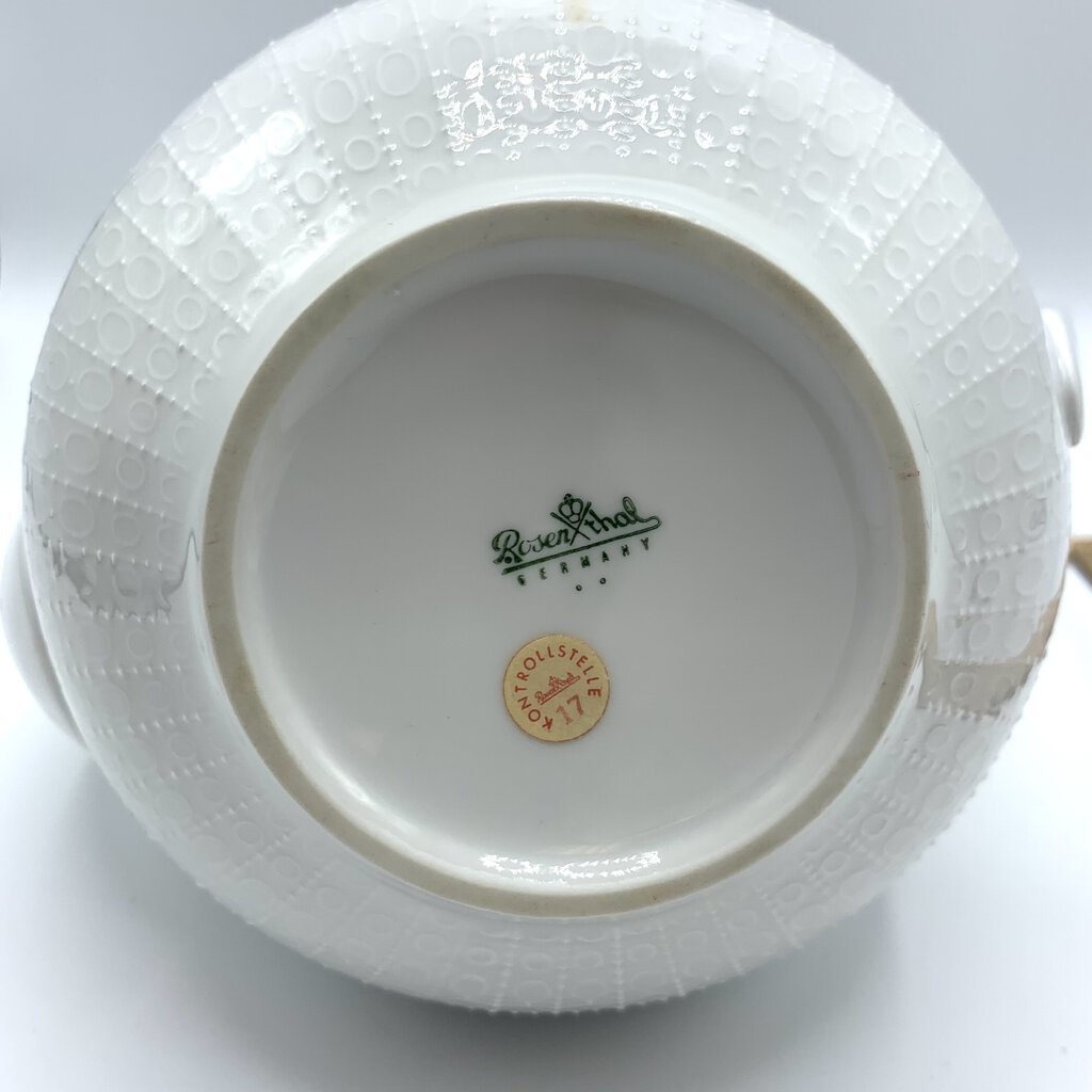 Intricate, yet subtle pattern to this understated mid-century coffee pot made by Rosenthal of Germany. Crafted from porcelain and embossed with a unique design of ovals and dots, the pattern is crisp and elegant. Rosenthal produced the Romance pattern from 1961-2005, but based on the backstamp, this piece was made in the 1960s.