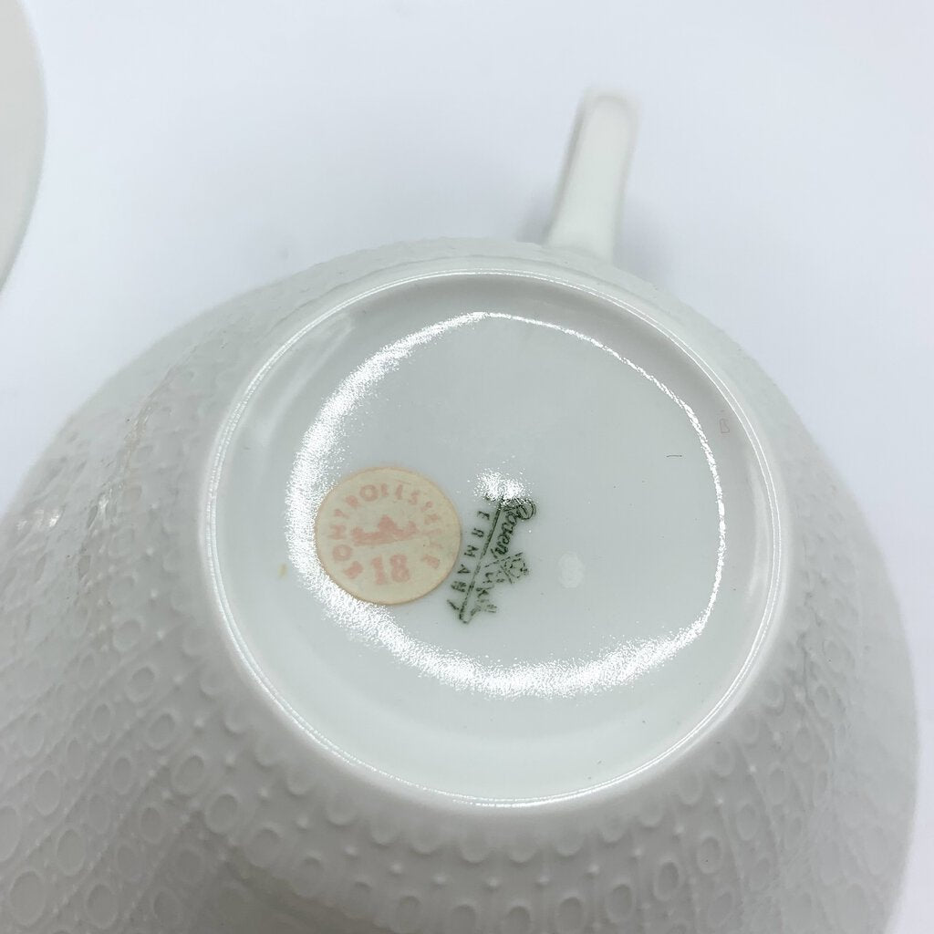 Intricate, yet subtle pattern to this set of 4 double-handled soup bowls with underplates made by Rosenthal of Germany. Designed by Danish artist Bjorn Wiinblad and crafted from porcelain, the bowls are embossed with a unique pattern of ovals and dots. The design is crisp and elegant. Rosenthal produced the Romance pattern from 1961-2005, but based on the backstamp, the bowls were made in the 1960s. The set would be stunning displayed on open kitchen shelving!
