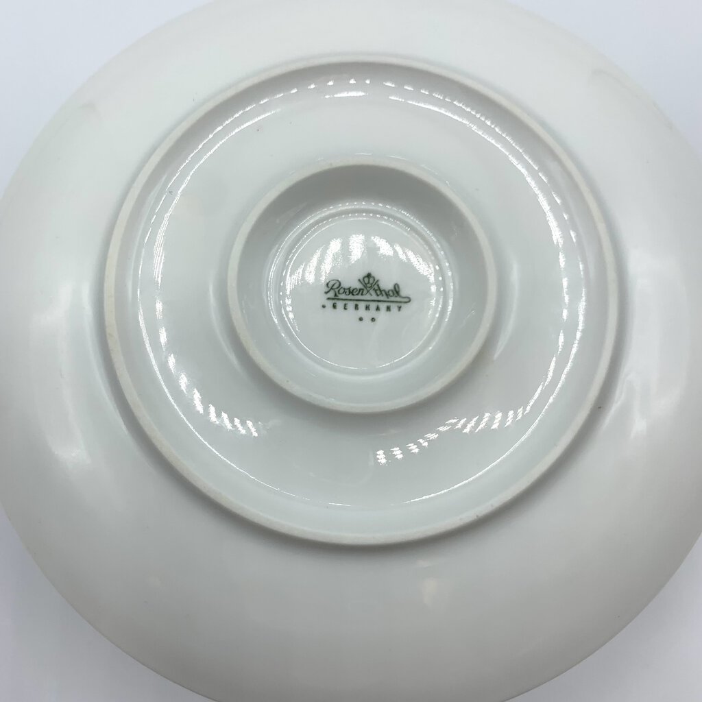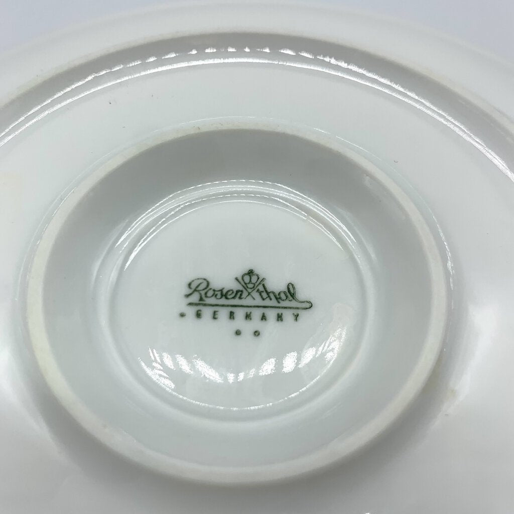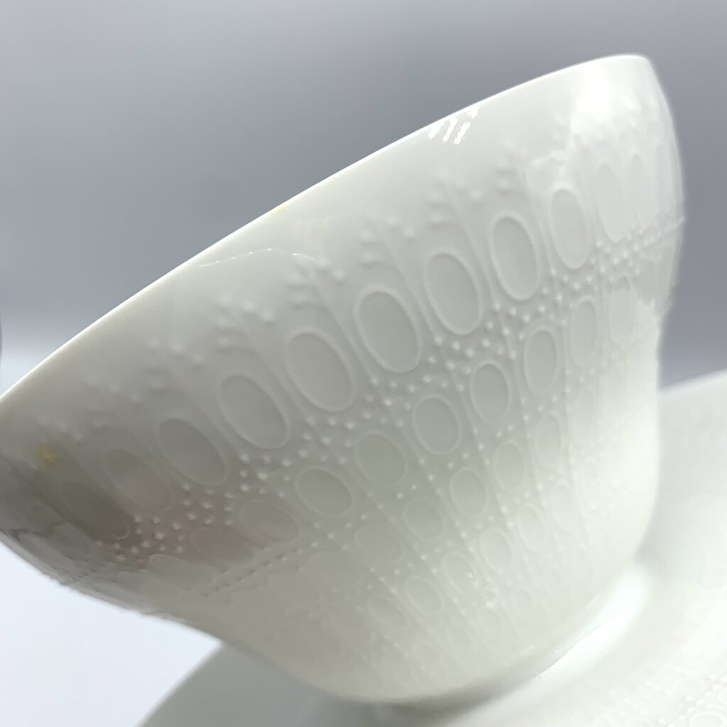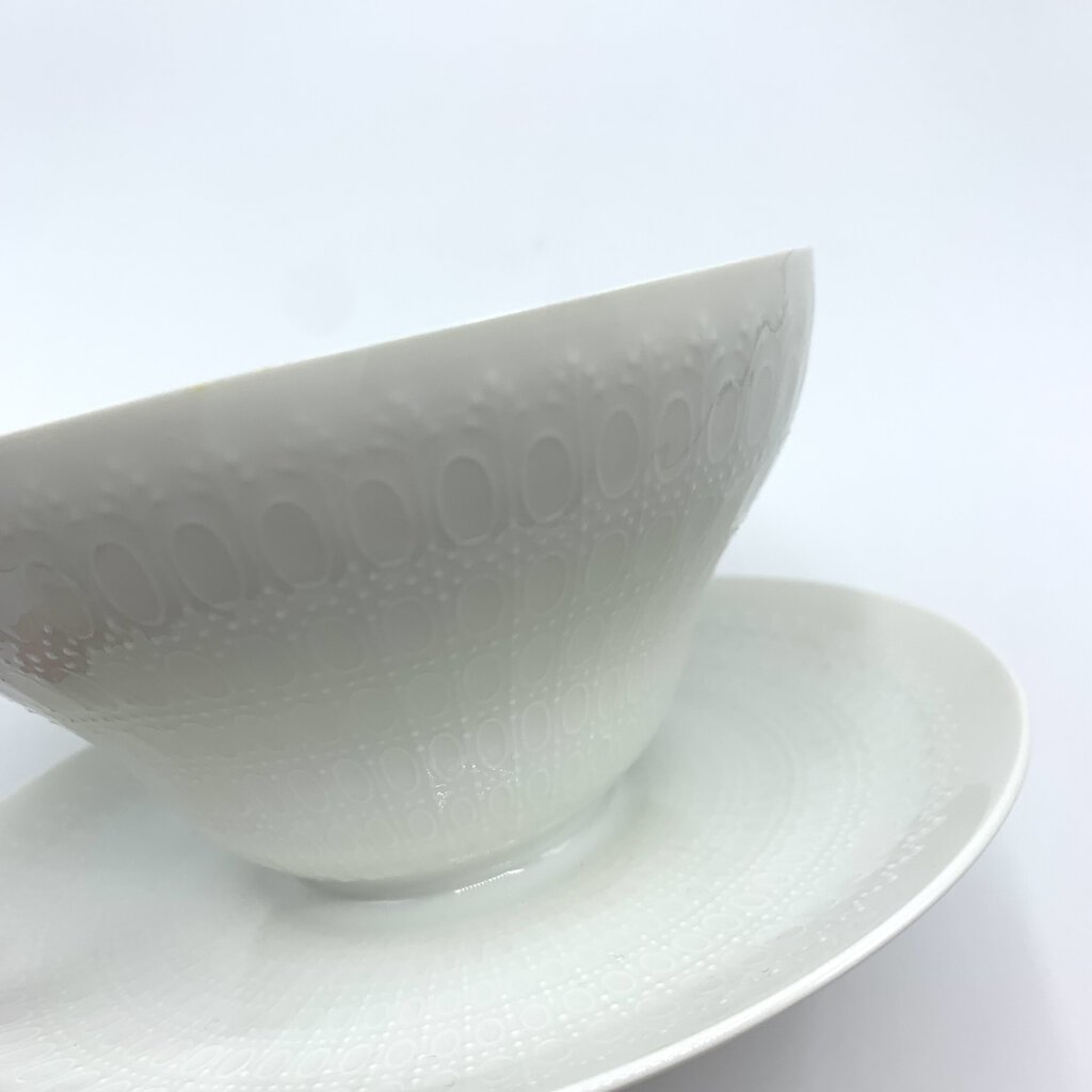 Intricate, yet subtle pattern to this mid-century gravy/sauce boat made by Rosenthal of Germany. Designed by Danish artist Bjorn Wiinblad and crafted from porcelain, the gravy boat is embossed with a unique pattern of ovals and dots. The design is crisp and elegant. Rosenthal produced the Romance pattern from 1961-2005, but based on the backstamp, this piece was made in the 1960s. It would be stunning on open kitchen shelving!