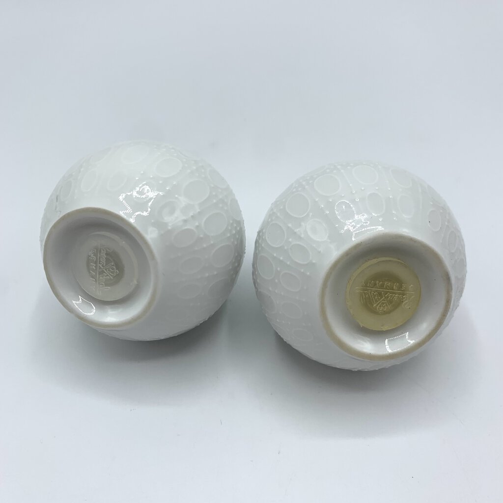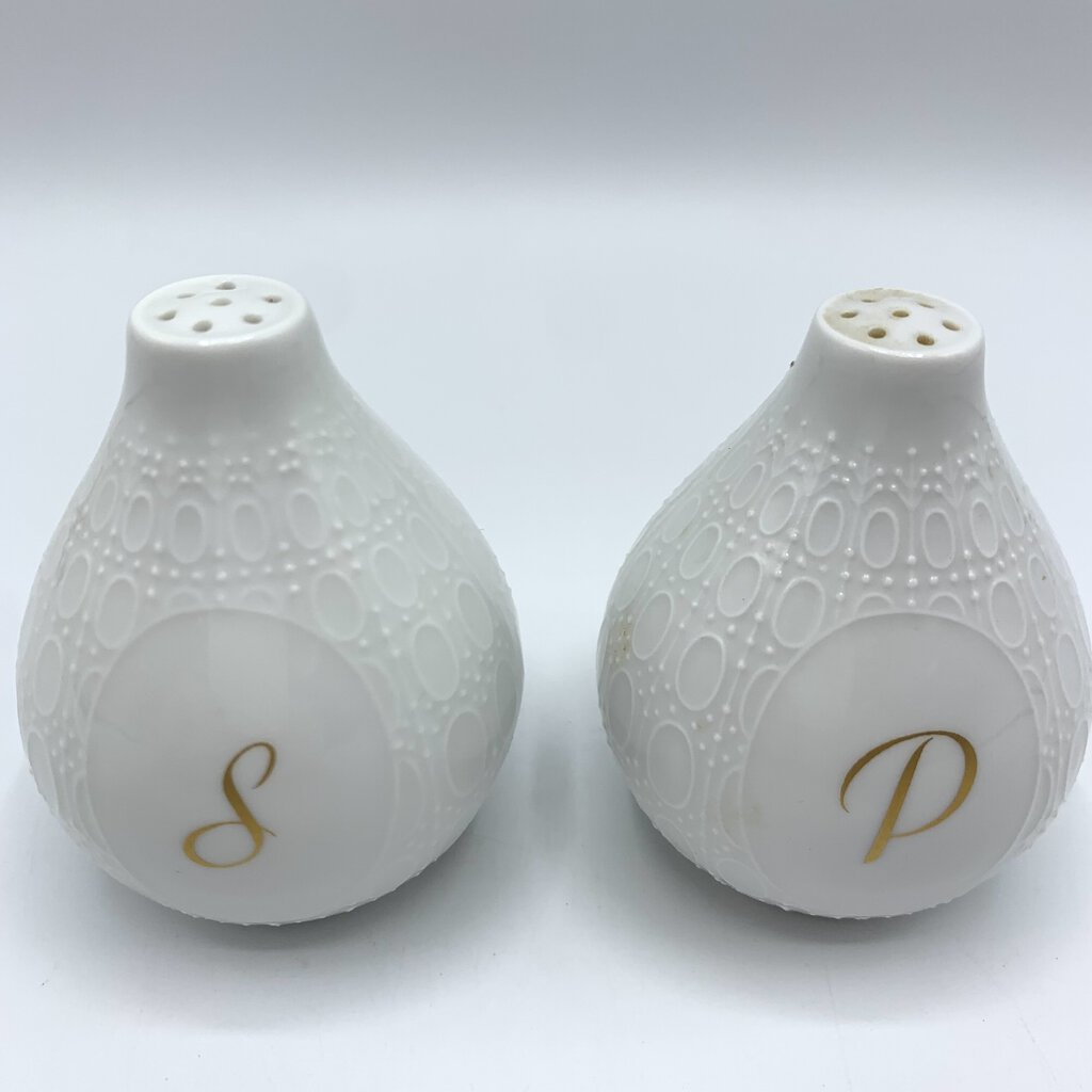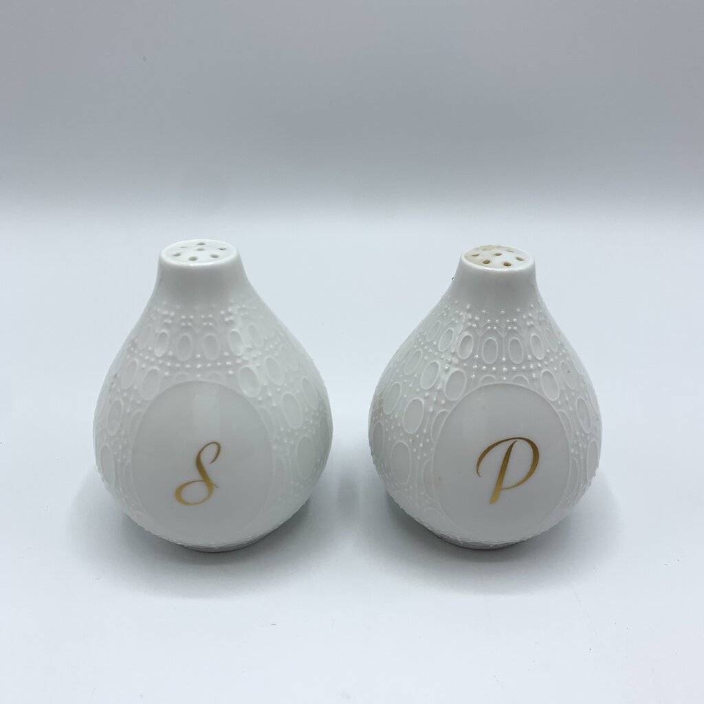 Intricate, yet subtle pattern to these mid-century salt and pepper shakers made by Rosenthal of Germany. Designed by Danish artist Bjorn Wiinblad and crafted from porcelain, these shakers are embossed with a unique pattern of ovals and dots. The design is crisp and elegant. Rosenthal produced the Romance pattern from 1961-2005, but based on the backstamp, they were made in the 1960s. They would be stunning on open kitchen shelving!