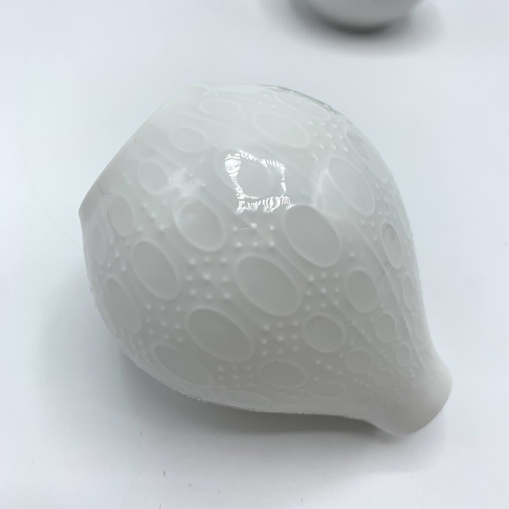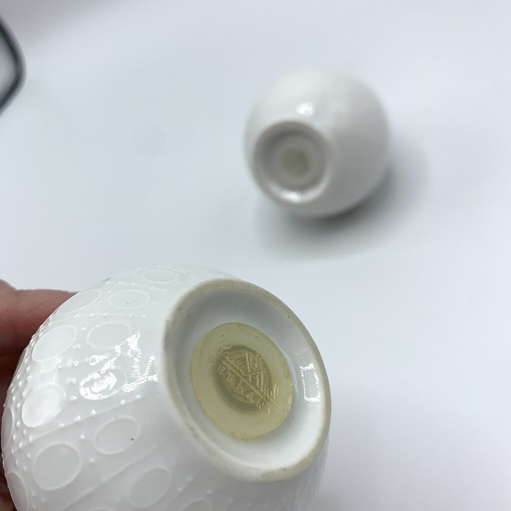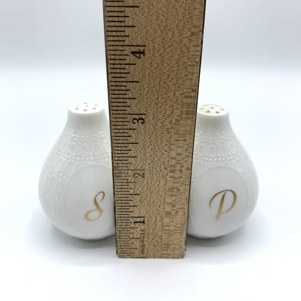 Intricate, yet subtle pattern to these mid-century salt and pepper shakers made by Rosenthal of Germany. Designed by Danish artist Bjorn Wiinblad and crafted from porcelain, these shakers are embossed with a unique pattern of ovals and dots. The design is crisp and elegant. Rosenthal produced the Romance pattern from 1961-2005, but based on the backstamp, they were made in the 1960s. They would be stunning on open kitchen shelving!