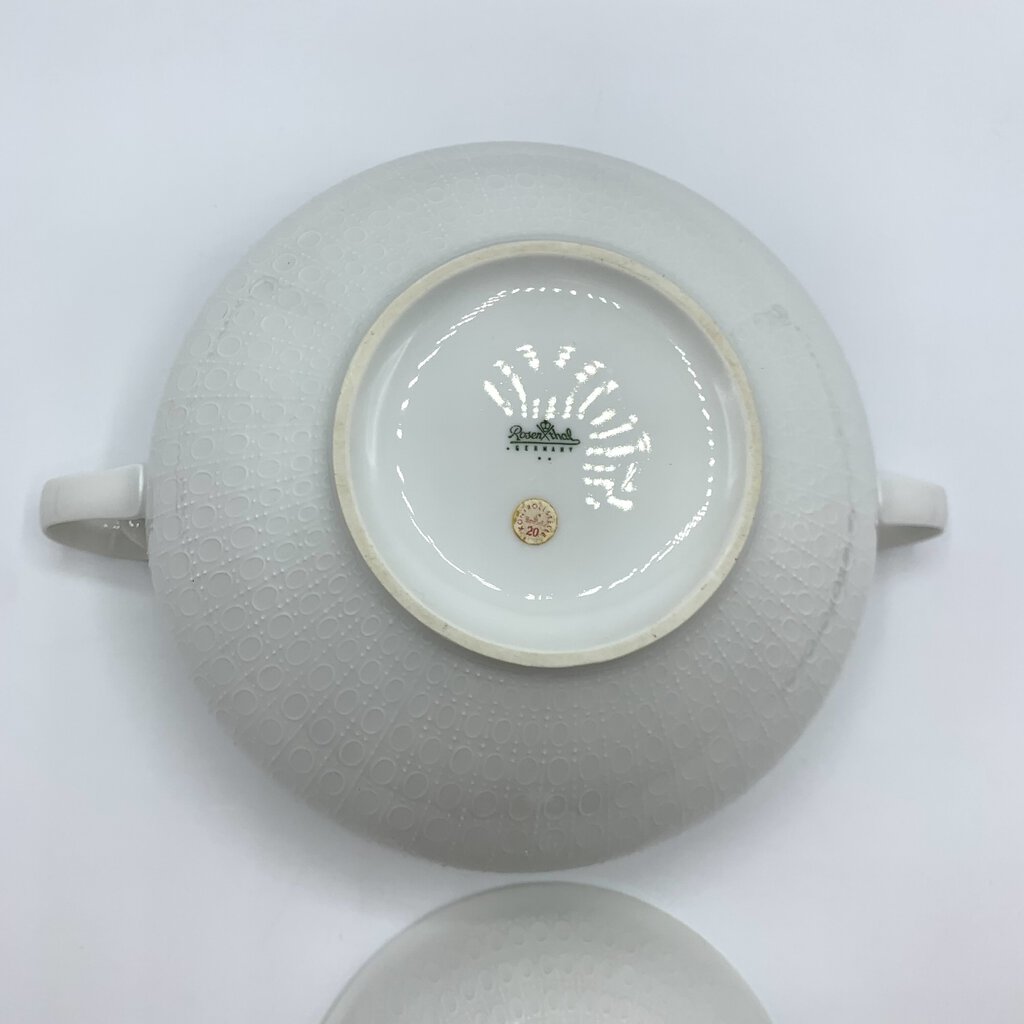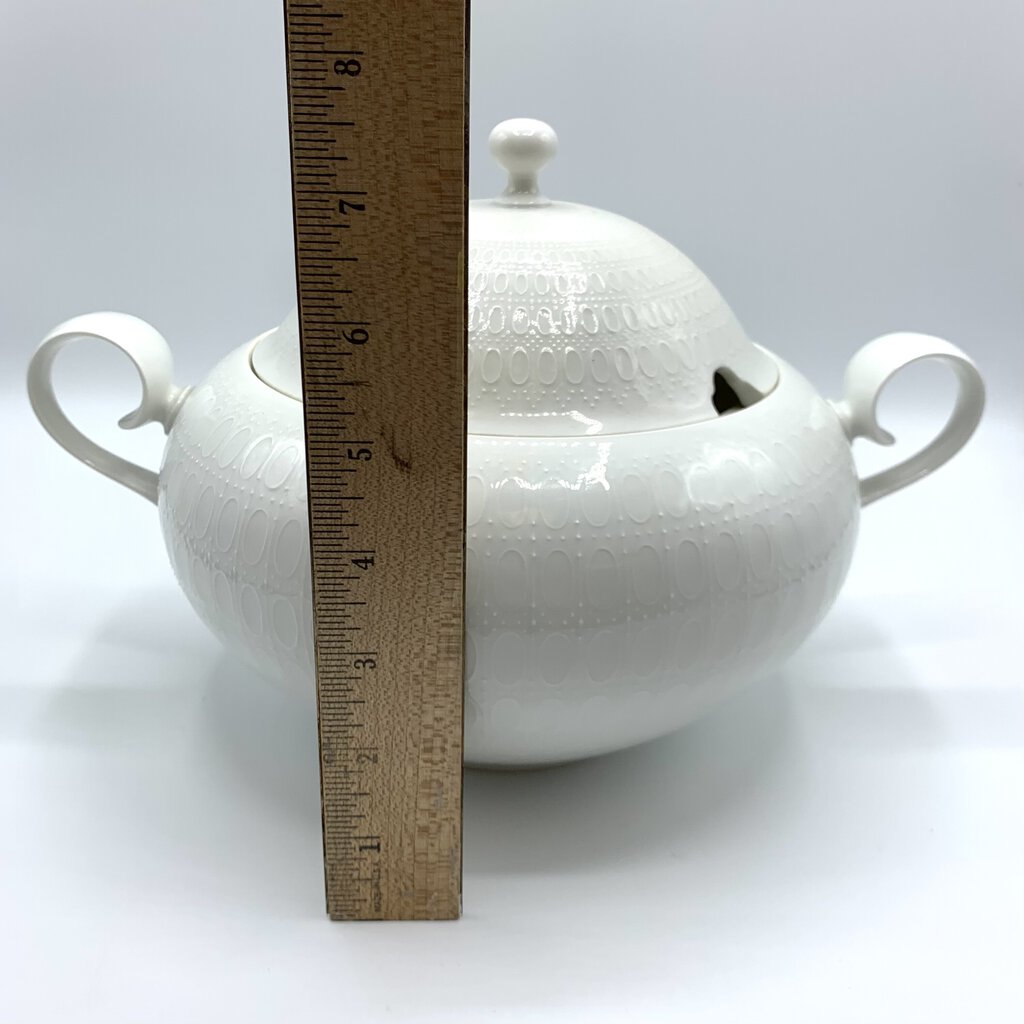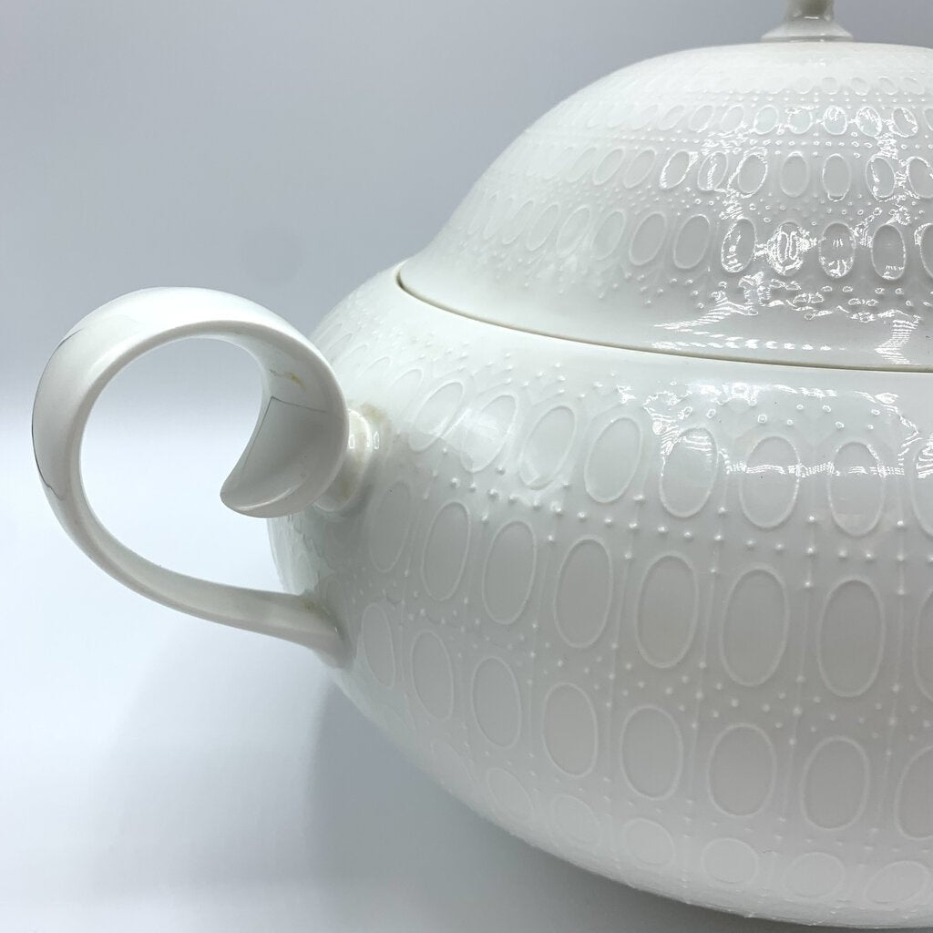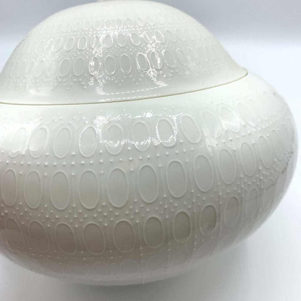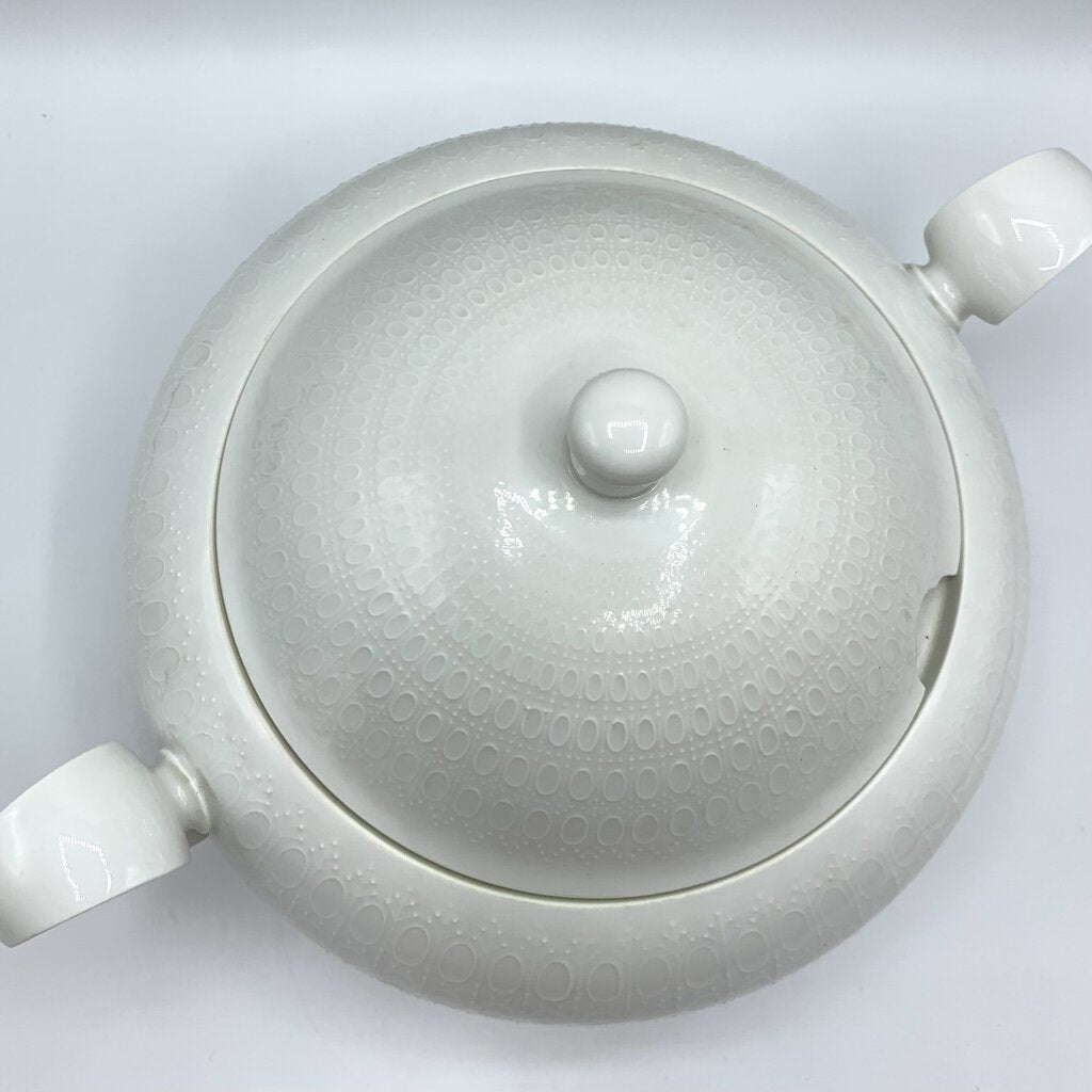Intricate, yet subtle pattern to this nice-sized, mid-century tureen made by Rosenthal of Germany. Designed by Danish artist Bjorn Wiinblad and crafted from porcelain, the tureen is embossed with a unique pattern of ovals and dots. The design is crisp and elegant. Rosenthal produced the Romance pattern from 1961-2005, but based on the backstamp, this piece was made in the 1960s. It would be stunning displayed on open kitchen shelving!