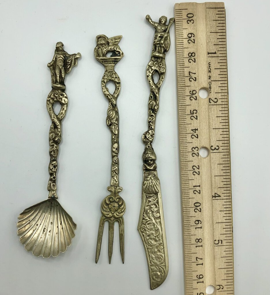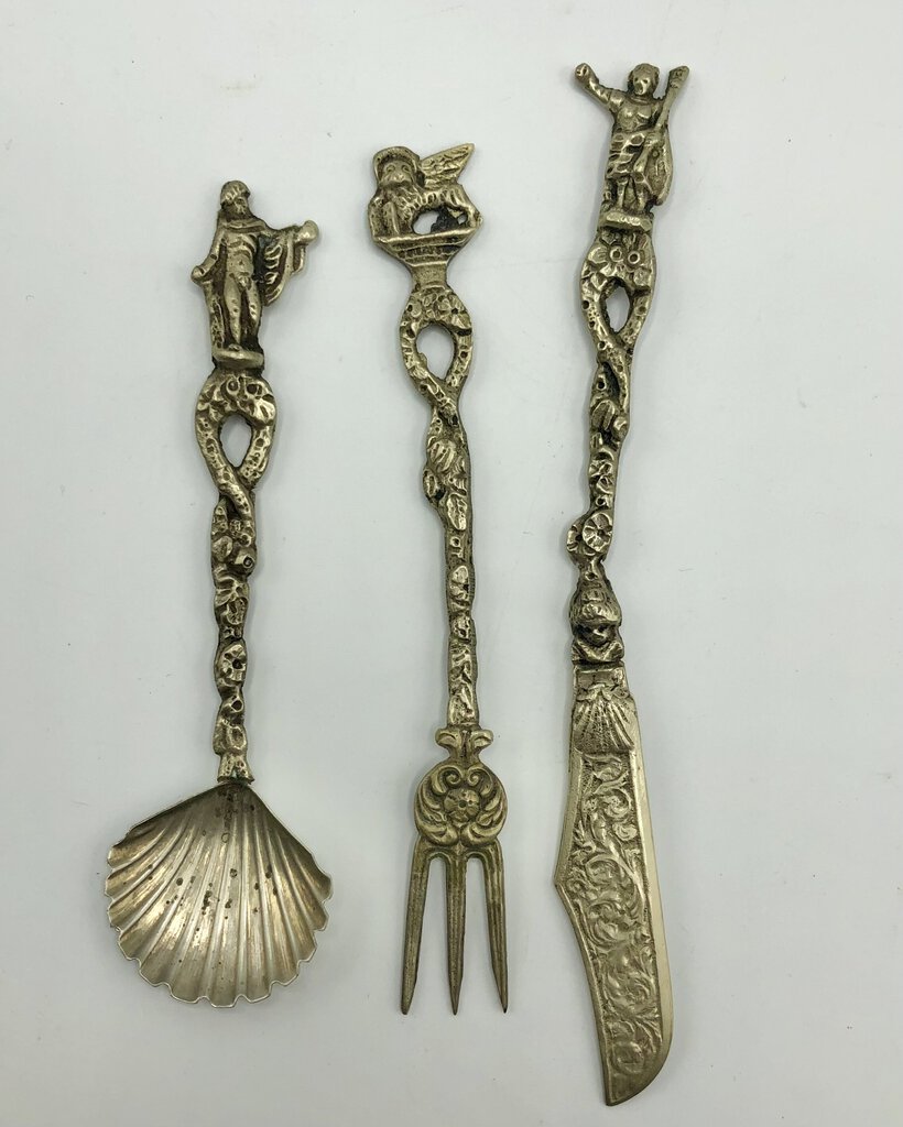 Small appetizer serving utensils, made in Italy, each piece with ornate design.