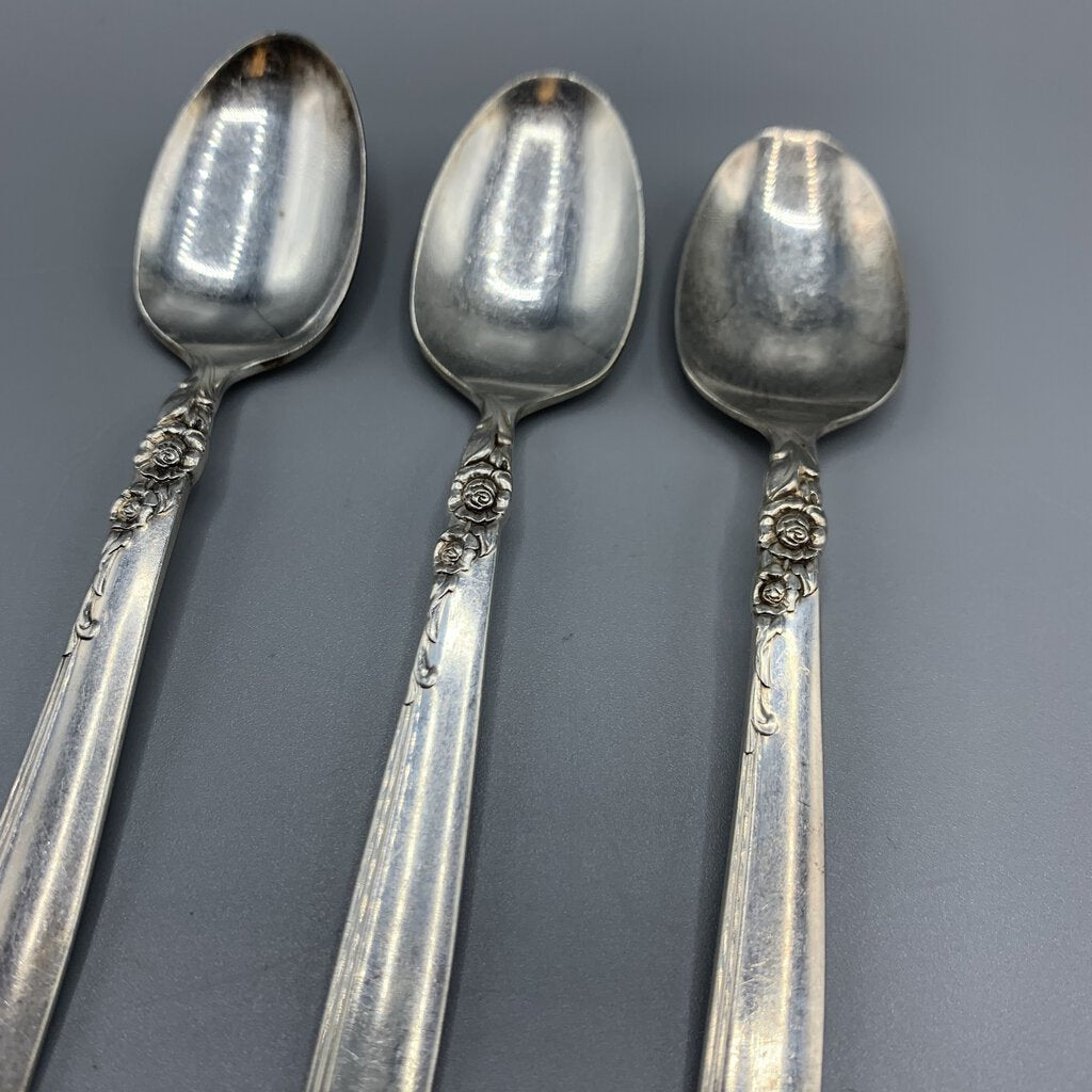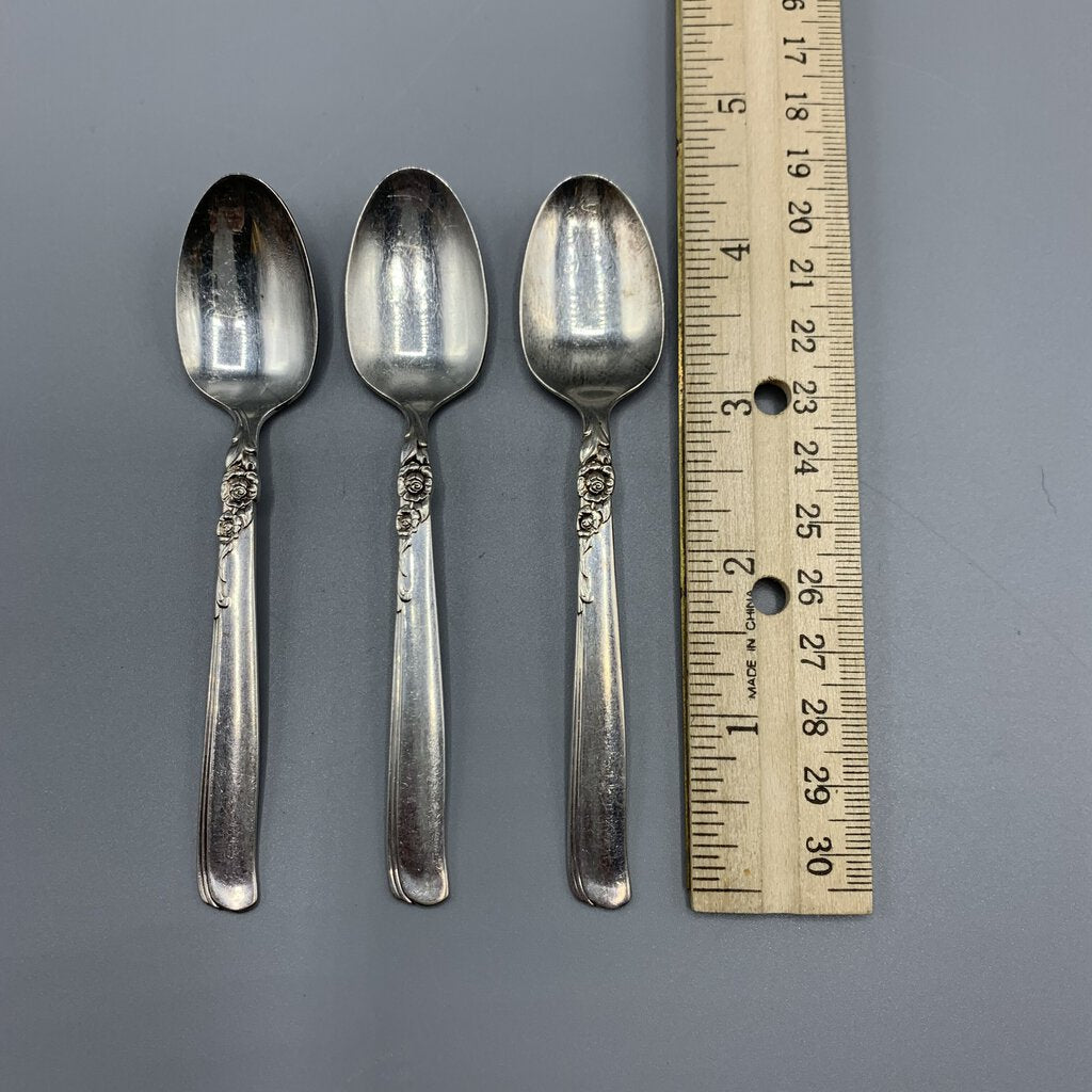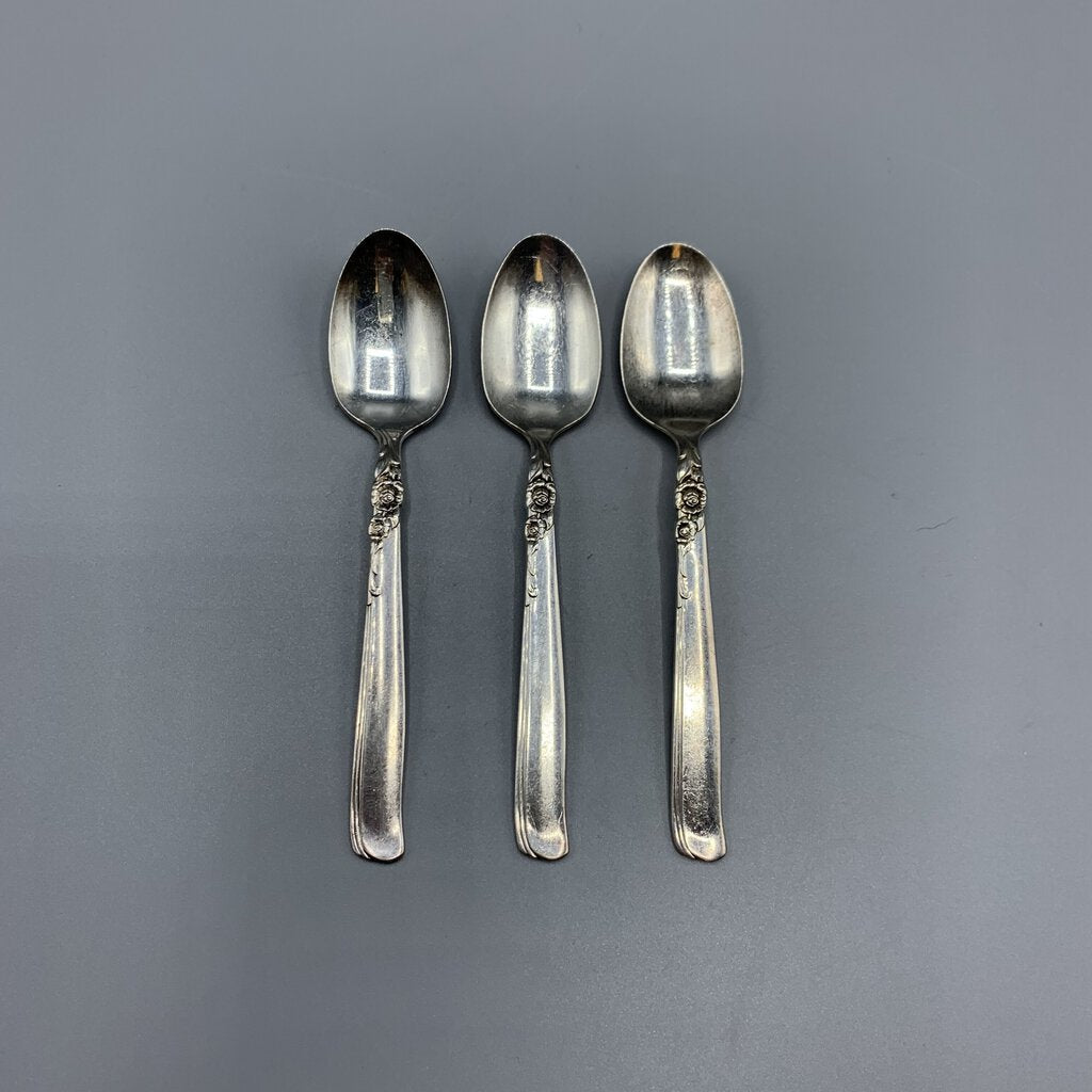 Charming set of three silverplate demitasse or baby spoons made by Oneida in 1955. They are from the Oneida Prestige line in the “Gay Adventure” pattern, which features a graceful floral flourish design at the neck of the spoon.