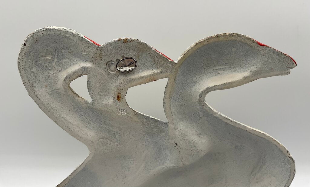 This vintage door stop was produced in Taiwan and features three white ducks walking together on a grassy platform, made of cast iron and painted, adding a touch of charm and whimsy. This door stop is incredibly sturdy and heavy enough to keep even the heaviest of doors open. This piece is in fantastic vintage condition, no chips, cracks, or other damages present. Please carefully review all photos for overall condition. Item measures 8 1/8” tall by 7 1/2” wide and weighs 4 pounds and 1.8 ounces. Estate item. Condition is pre owned. Ships USPS Ground Advantage Mail.