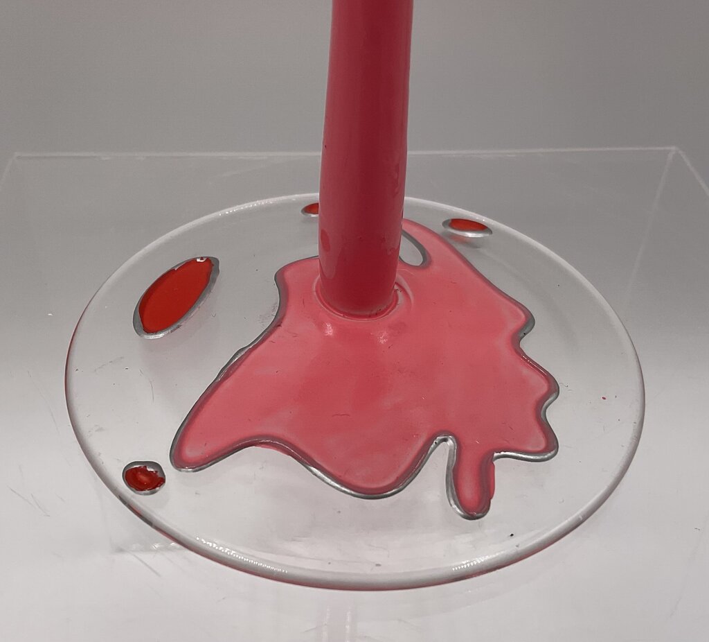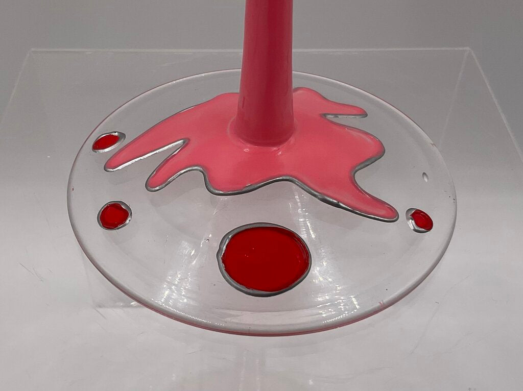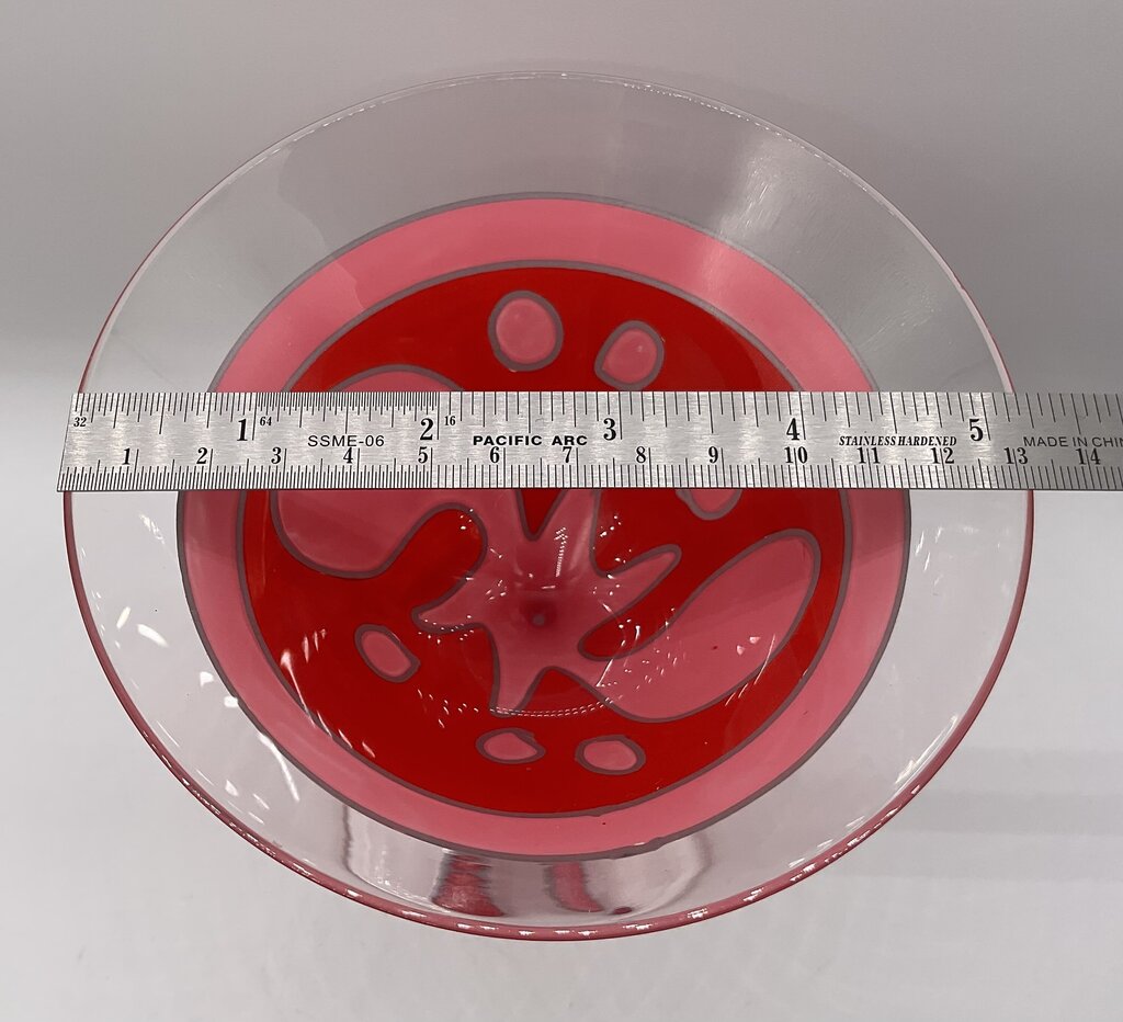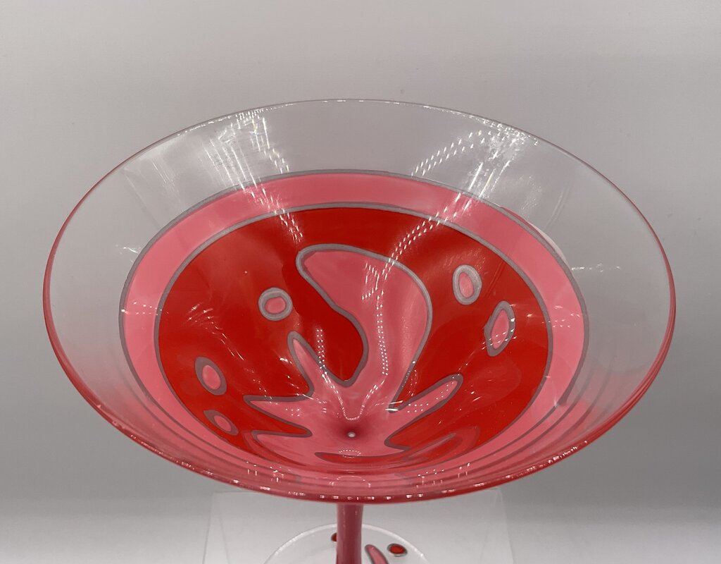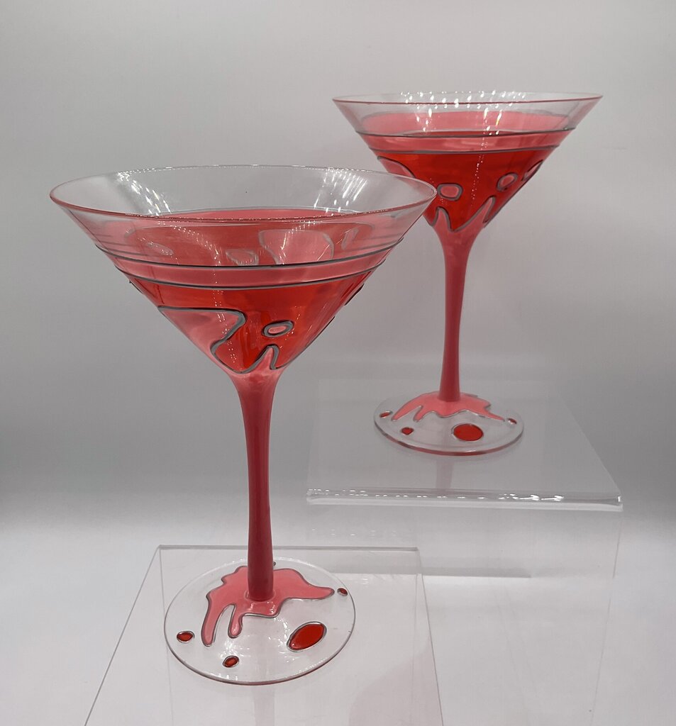 These two martini/cocktail glasses are hand painted and create the cartoonish illusion that a pink liquid is pouring down from the top portion of the glass onto the base of the glass. These glasses are incredibly fun and add a touch of whimsy and charm to any set of glasses. These two glasses are in excellent vintage condition, no chips, cracks, or other damages present. Please carefully review all photos for overall condition. Each glass measures 7 1/8” tall and 5 1/8” wide at the rim. Both glasses together weigh 1 pound and 1.5 ounces. Estate item. Condition is pre owned. Ships USPS Ground Advantage Mail.