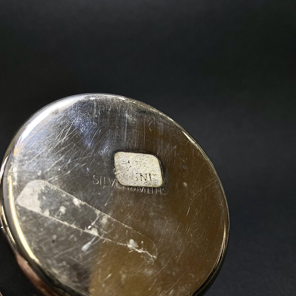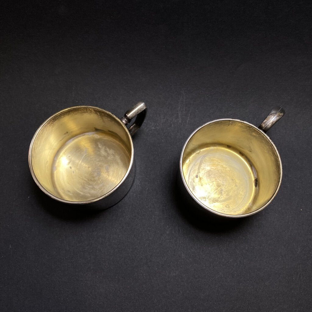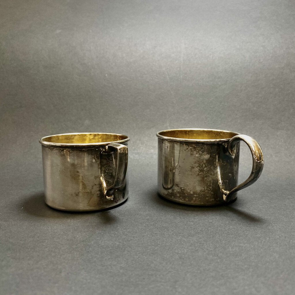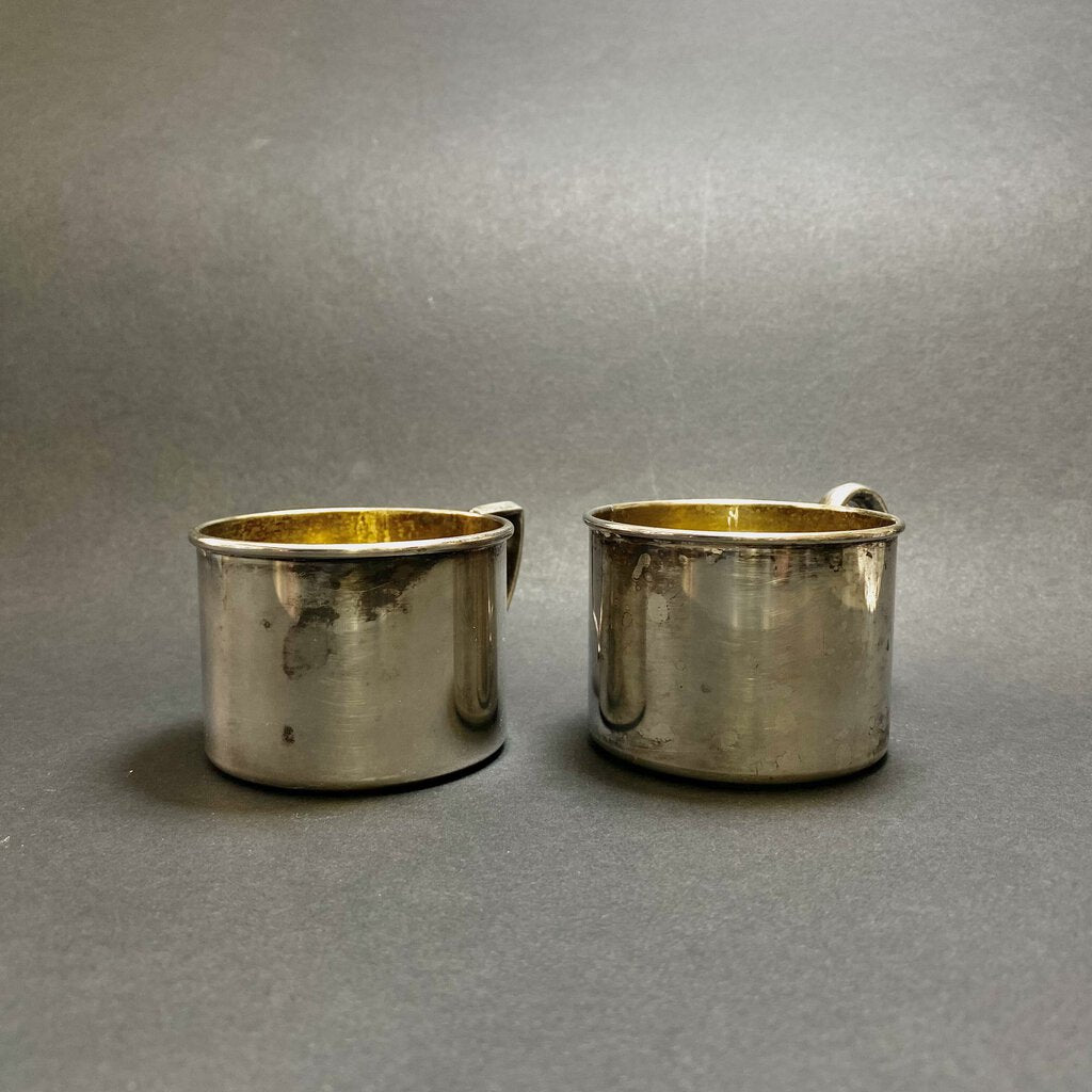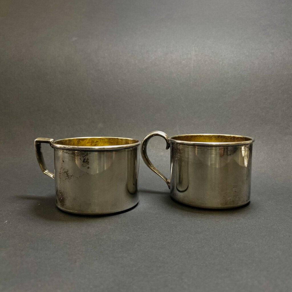 Both mugs are in nice vintage condition with no dings. There is a charming tarnish to these mugs, but if you wanted to polish it away, it could be done. ??????????? ????????????: Squared Handle: 1.75" H x 2.5" W x 3.25" D Rounded Handle: 1.75" H x 2.5" W x 3.5" D *Age unknown Please send us a message if you have any questions.