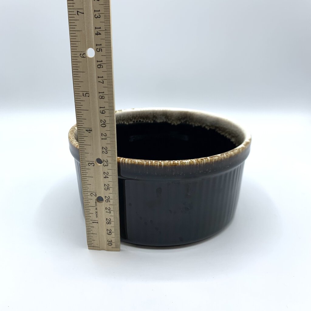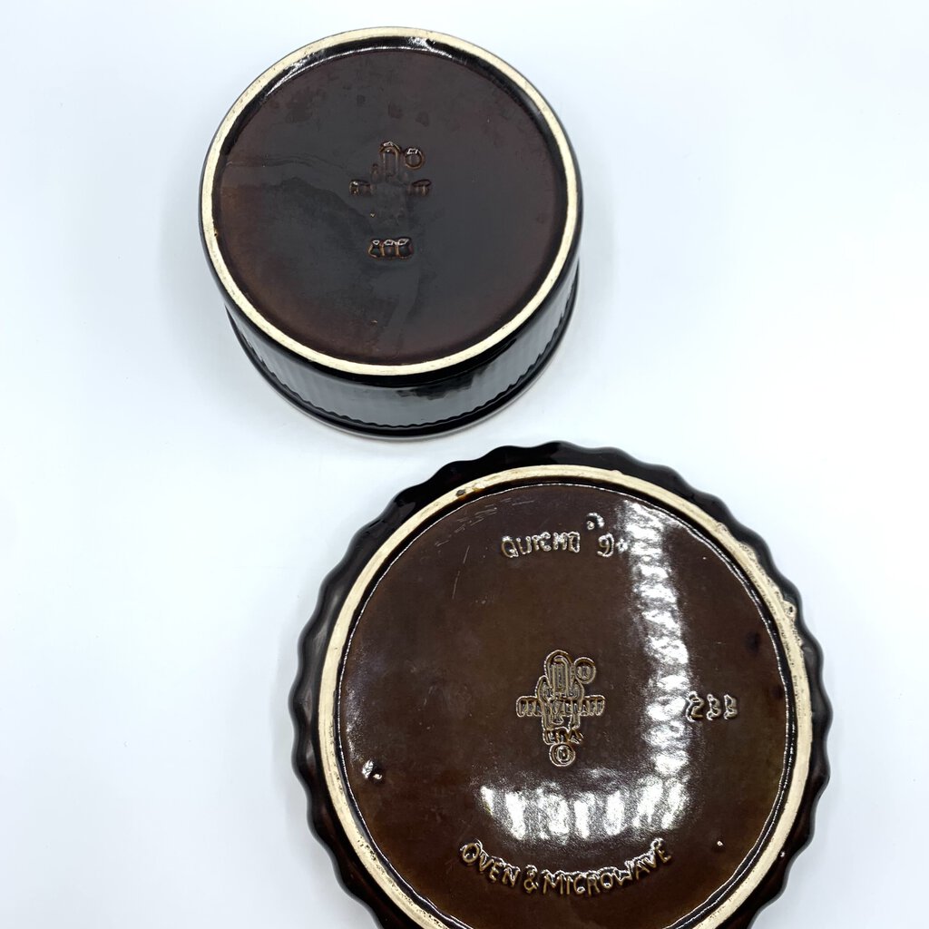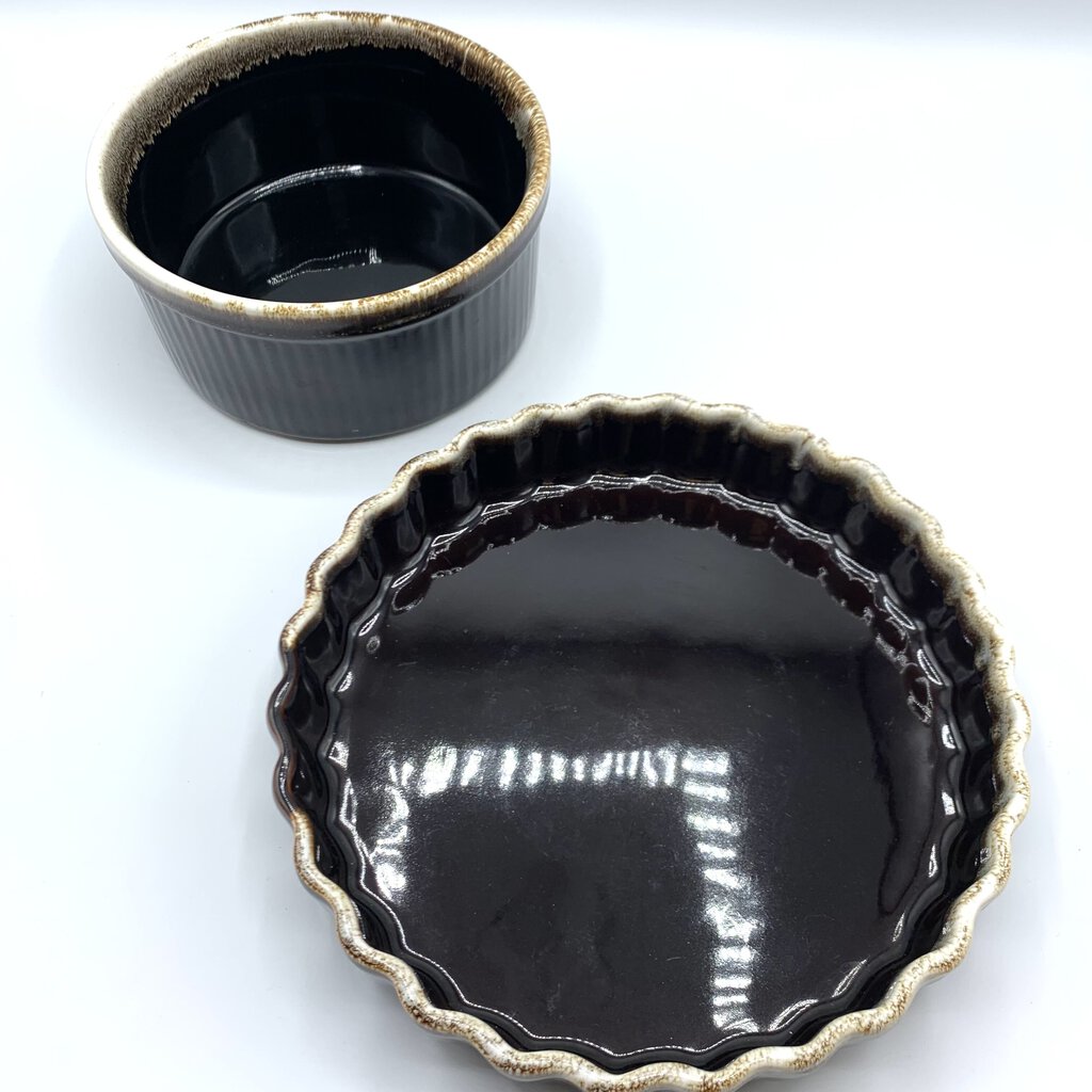 The brown drip glaze is the star of the show on these iconic vintage Pfaltzgraff Gourmet Brown baking dishes. The dark coffee bean brown juxataposed with the lovely cream color makes for interesting glaze details. No two pieces are alike! In this set you will receive a quiche dish and soufflé dish.
