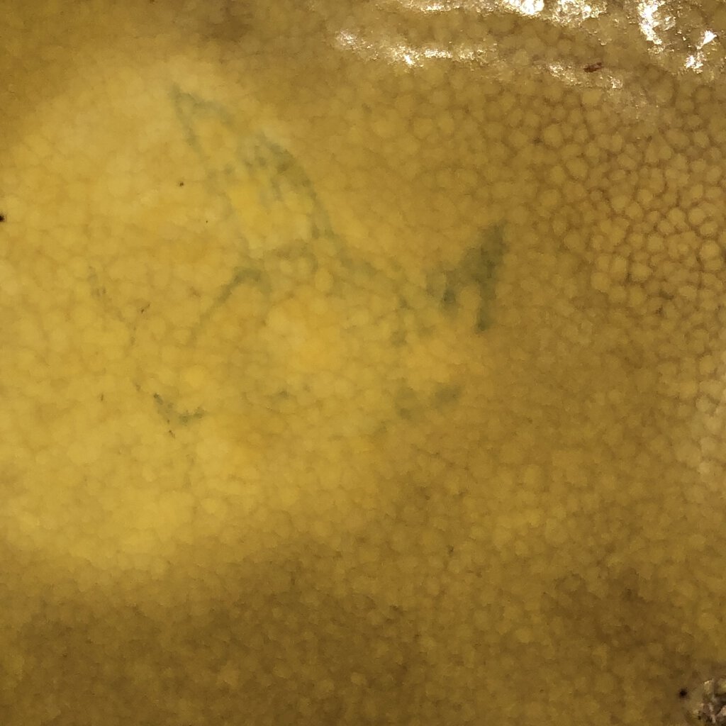 This pudgy fella has seen many a year of delicious cookies. Made by the Red Wing pottery company, the yellow, high gloss glaze is accented with brown waist tie, hat and good book.