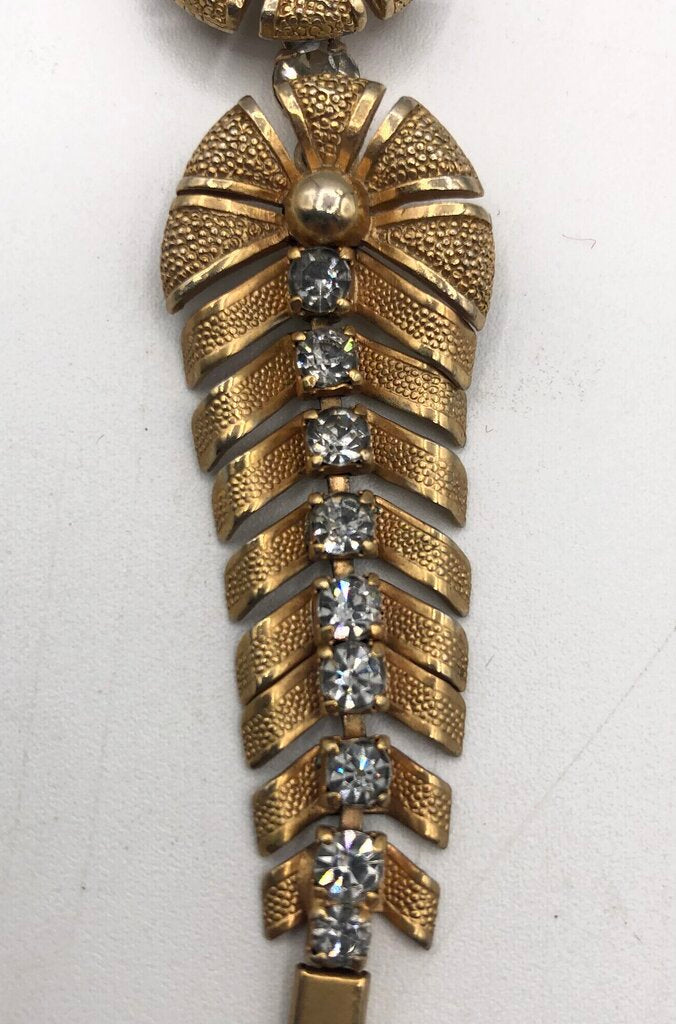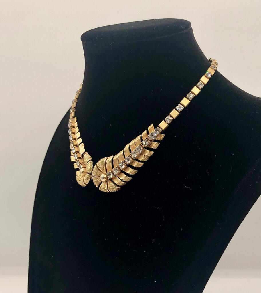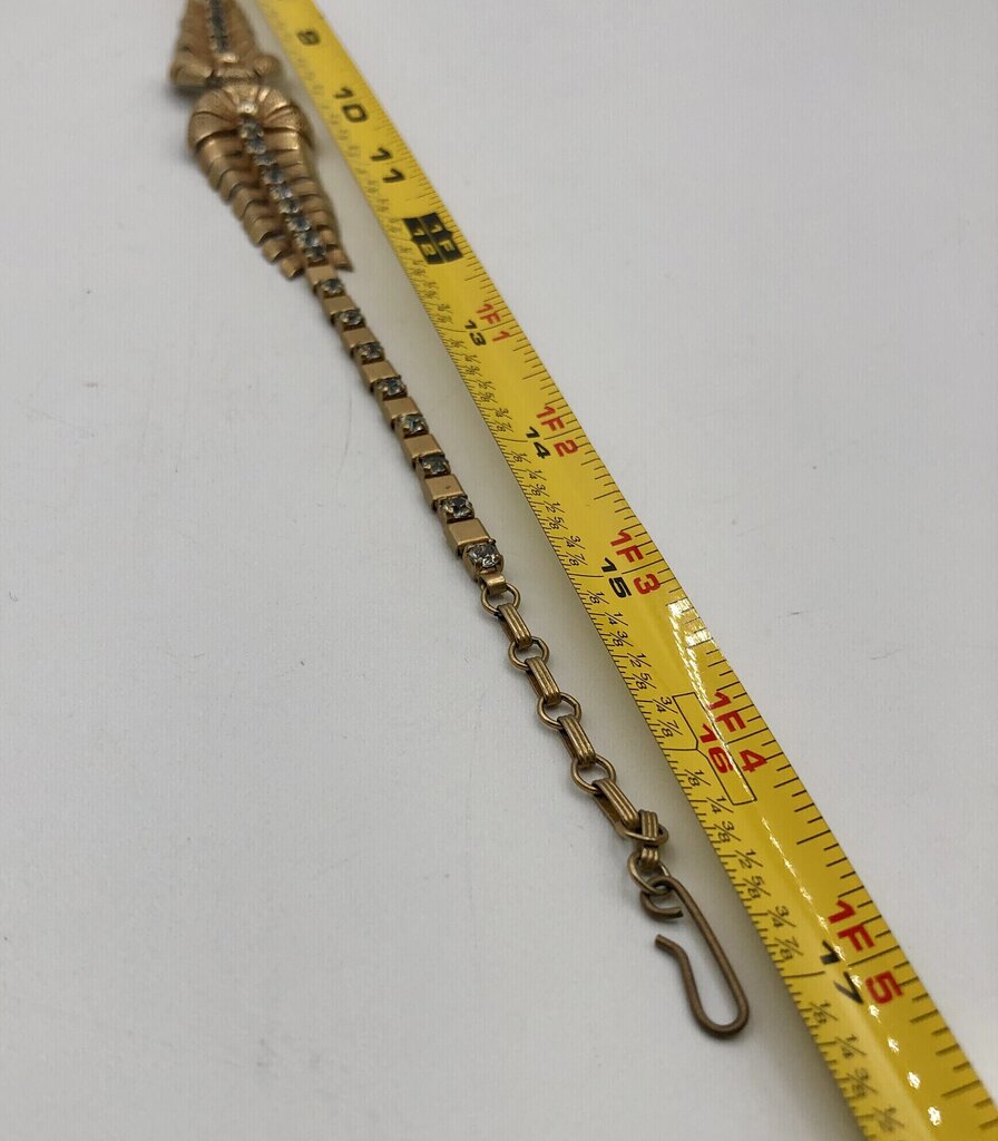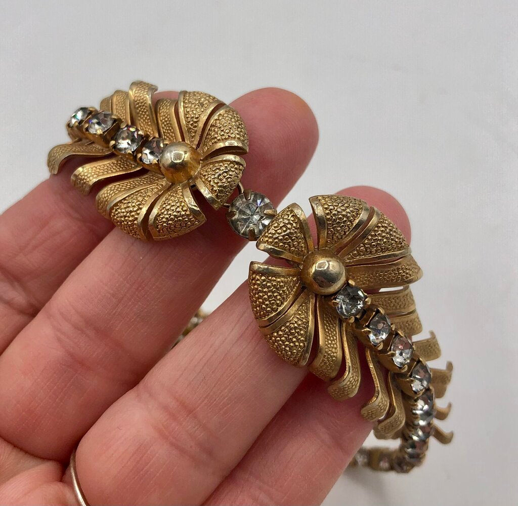 This vintage piece is beautifully designed and quality crafted. The rich gold tone finish has a textured surface and is accented with sparkling clear rhinestones.