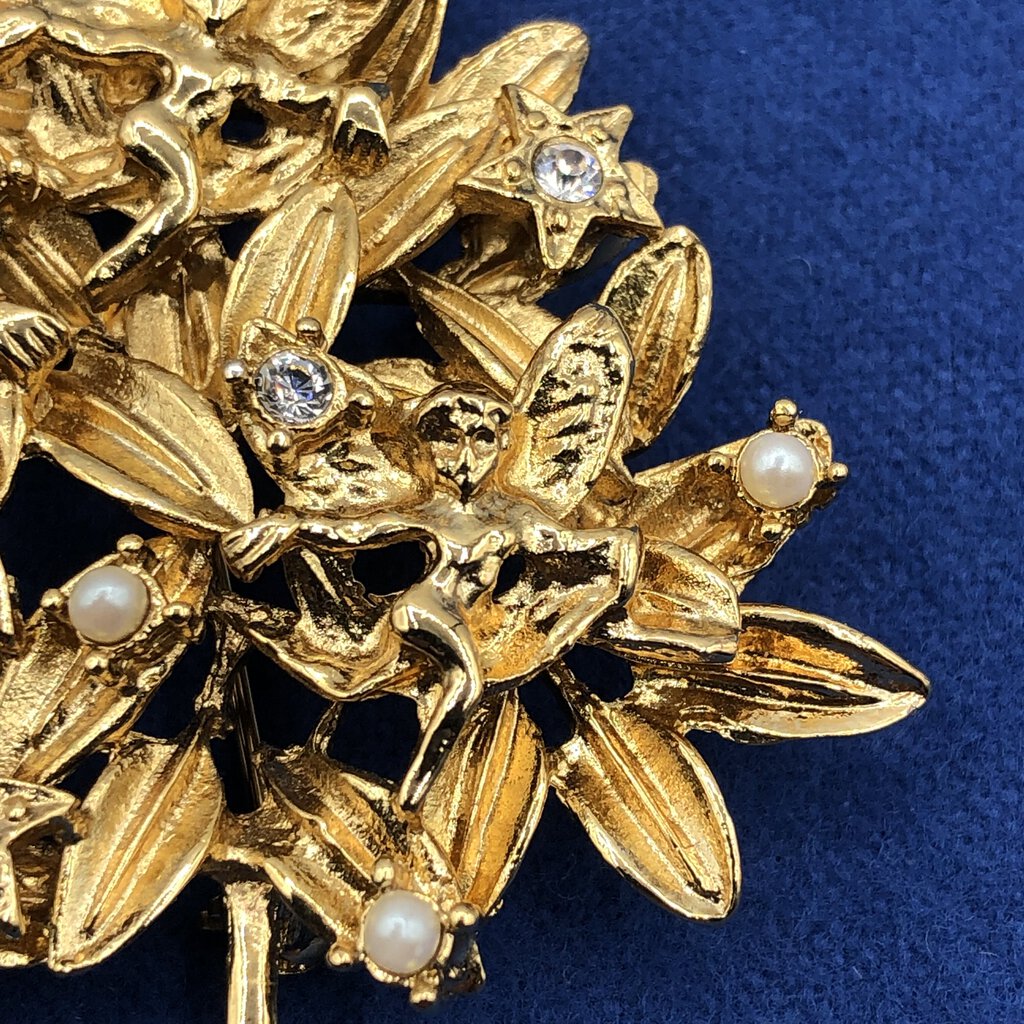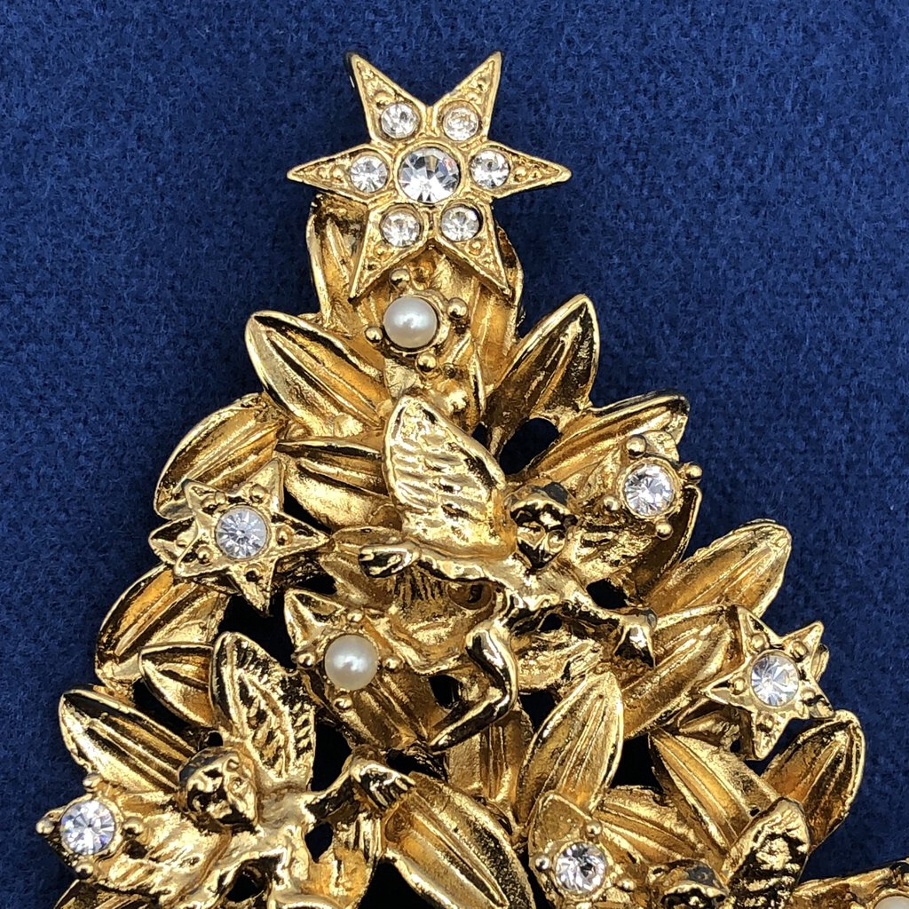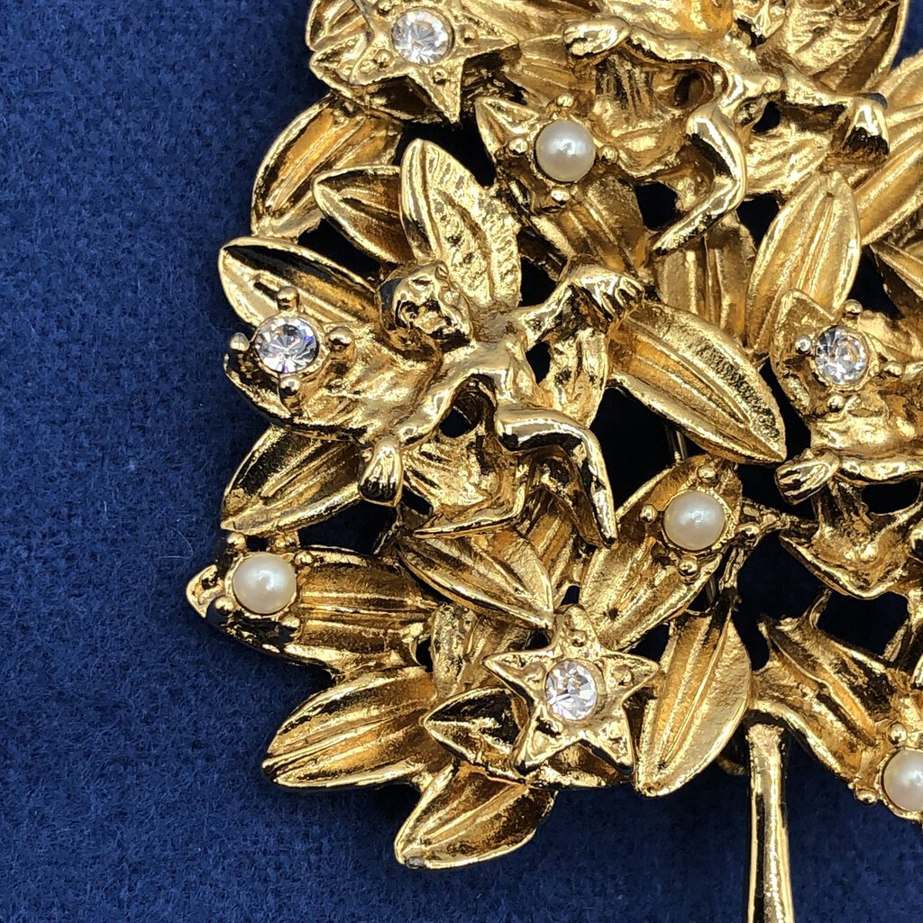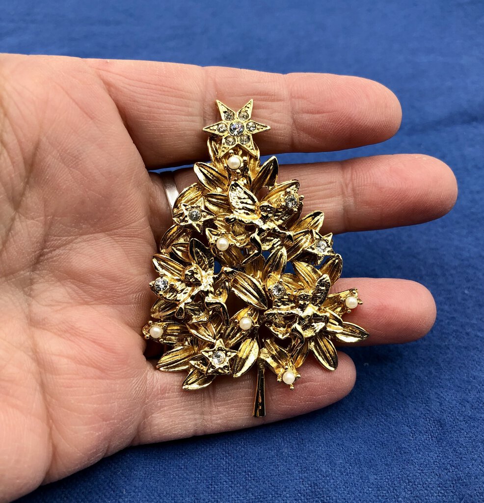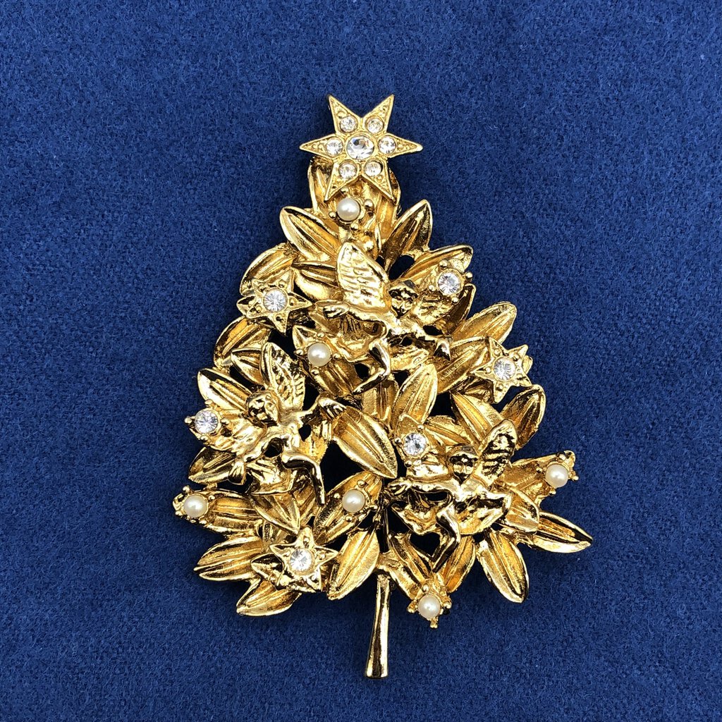 Beautifully stylized gold tone Christmas tree brooch alit with cherubs. The piece is accented with sparkling rhinestones and faux seed pearls.