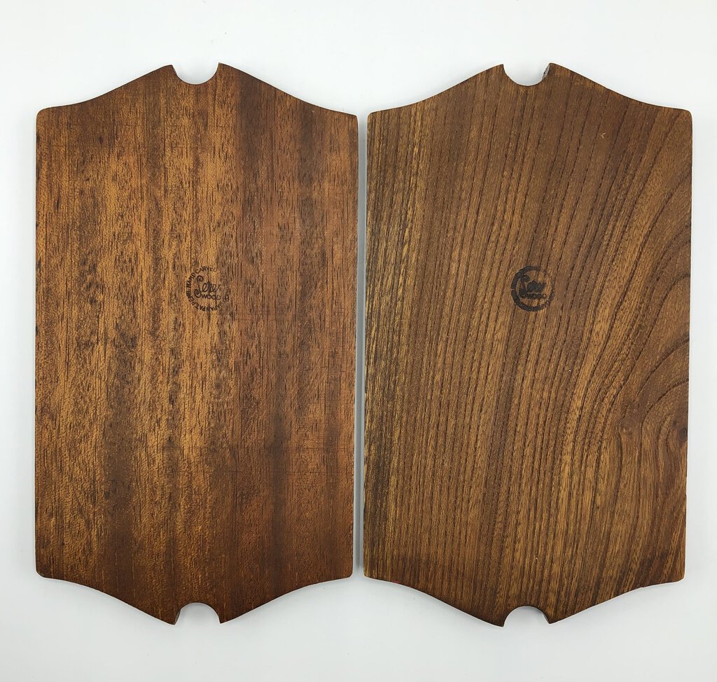 These vintage hardwood coaster and snack trays would look great in any man cave or bar area. Each has a cork lined spot for holding your cold beer while the inset tray holds nuts, chips or pretzels.